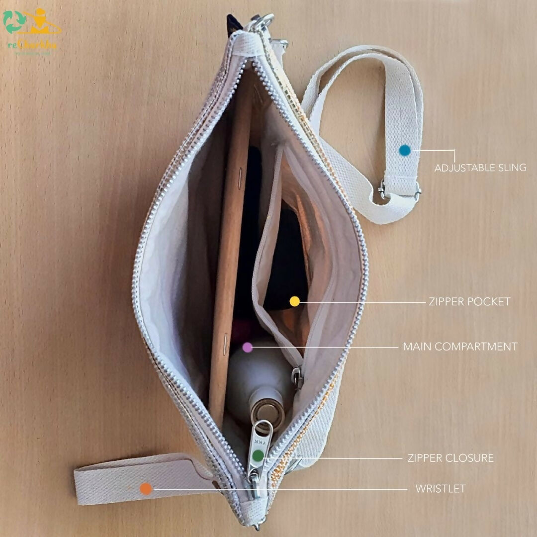Our 3-in-1 Sling-it is a must-have for all of you, young or old! After all, it’s all about how versatile you can get with the same bag, be it your morning chores or evening dinner get-together. reCharkha’s UPCYCLED-HANDWOVEN 3-in-1 Sling-it is your travel pouch, a wristlet, or a sling bag, all-in-one!