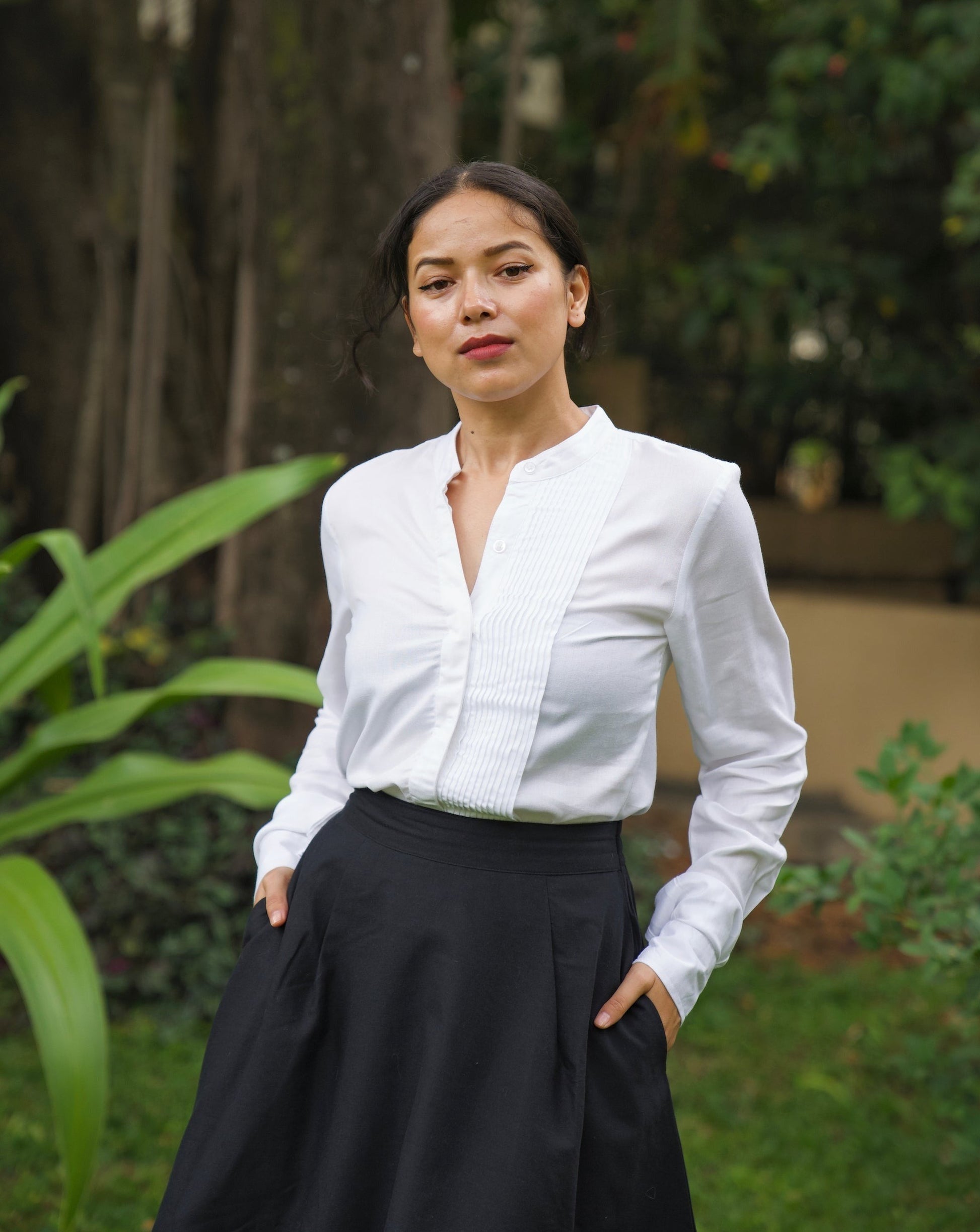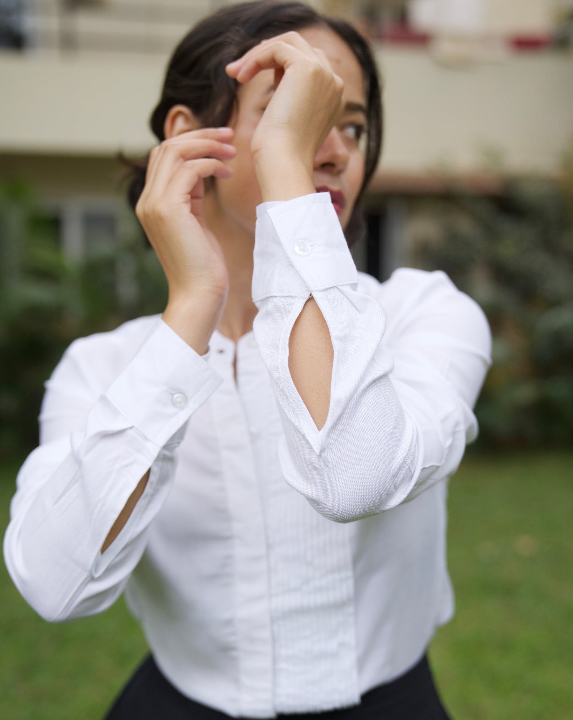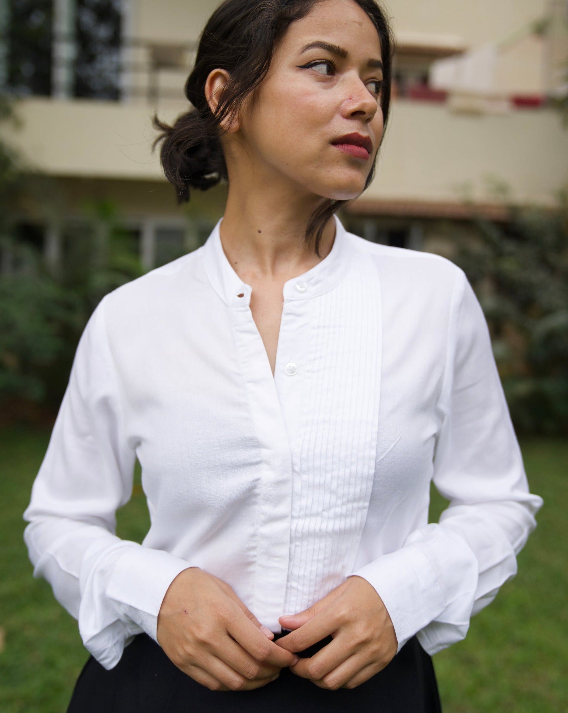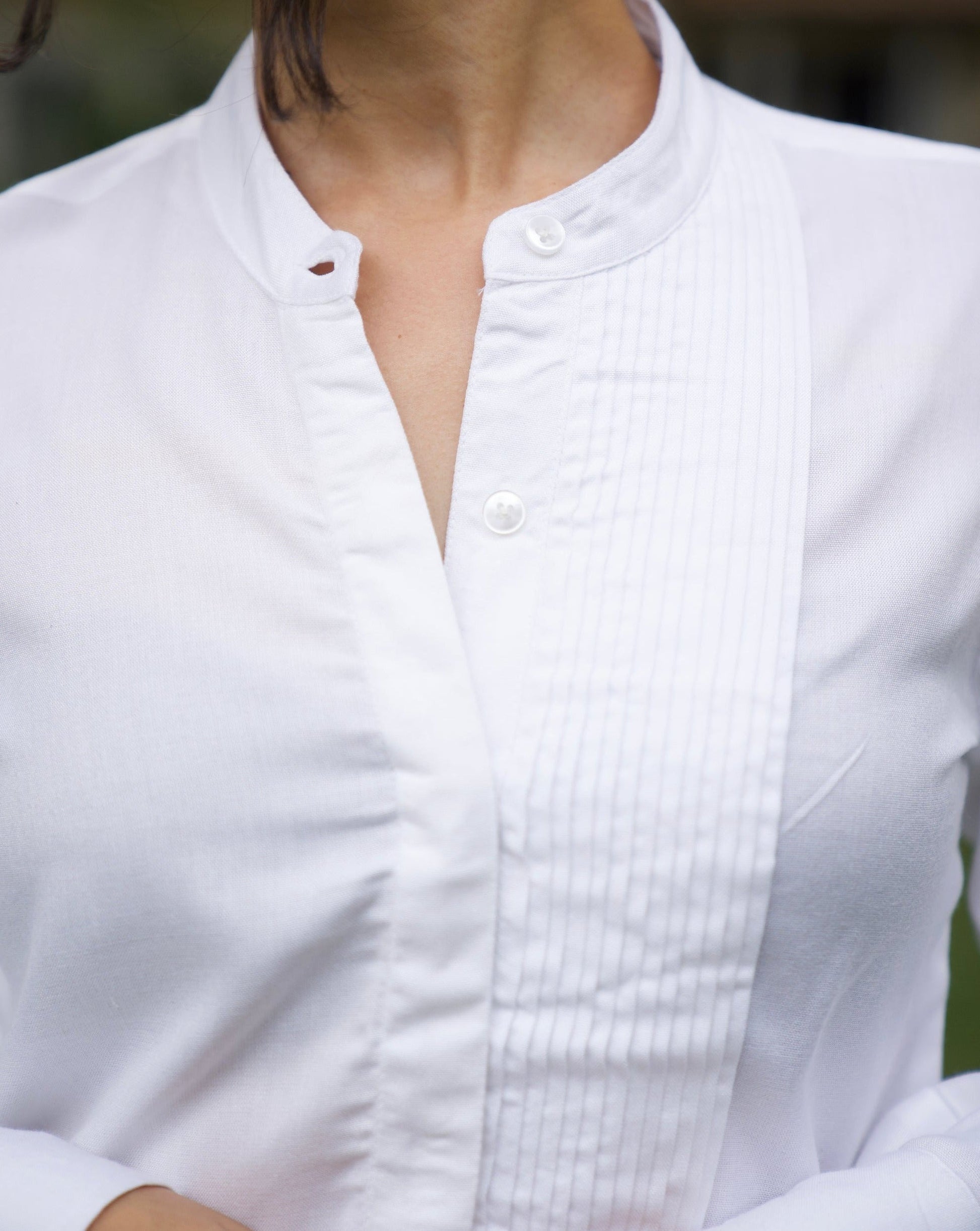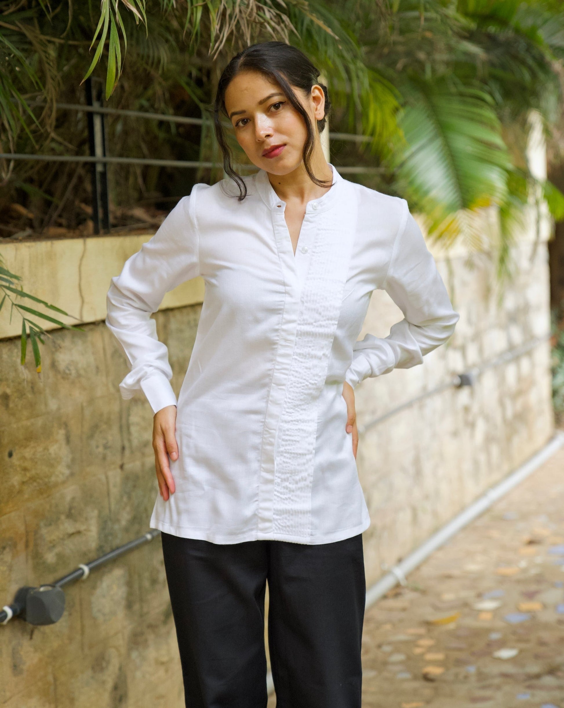 The quintessential formal shirt - white, fitted, white, cotton, pin-tucked on one side with a mandarin collar. The Snow Shirt is a must-have for those important meetings or even a date with your bestie.