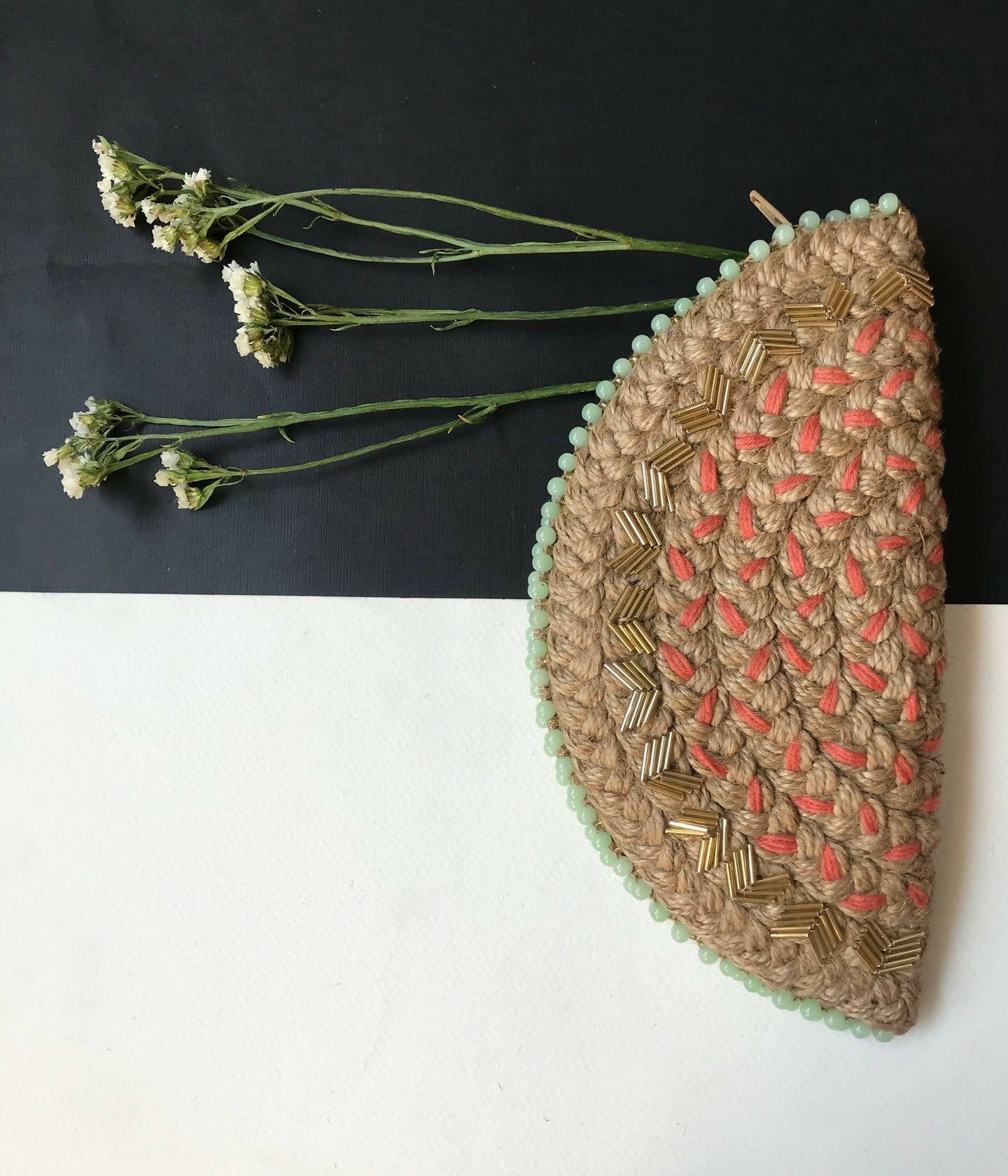 A true masterpiece skilfully crafted from natural jute and soft white wool. This elegant clutch is adorned with intricate bugle beads, adding a touch of starlight to your ensemble. As a tribute to our signature design, the Half Moon, this handcrafted bag is meticulously created from a single jute Dhaaga, showcasing the epitome of craftsmanship. It goes through 6 pairs of skilful hands to bring this special piece to life. Indulge in the uniqueness that every bag connoisseur deserves with this exceptional and honoured clutch.