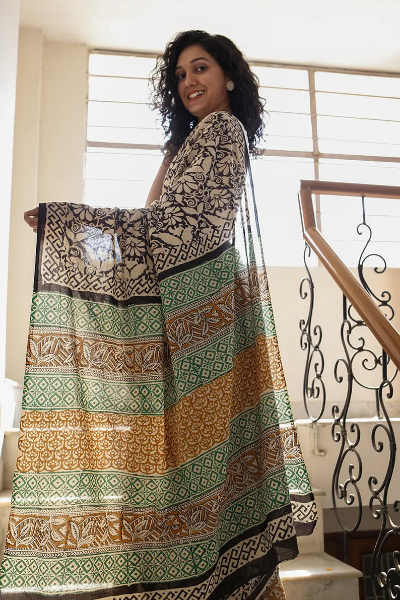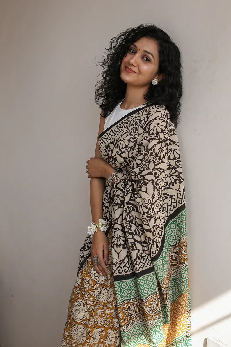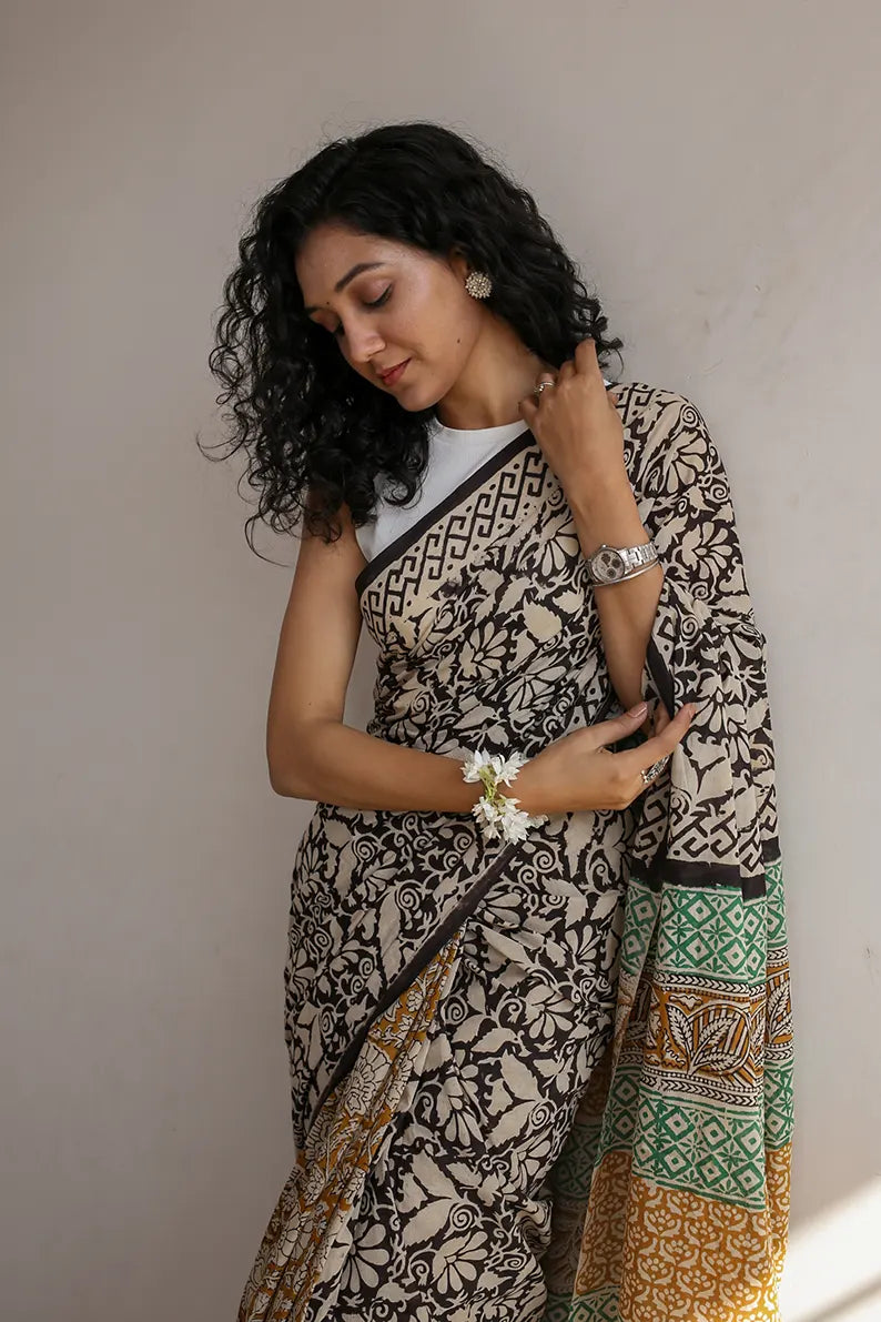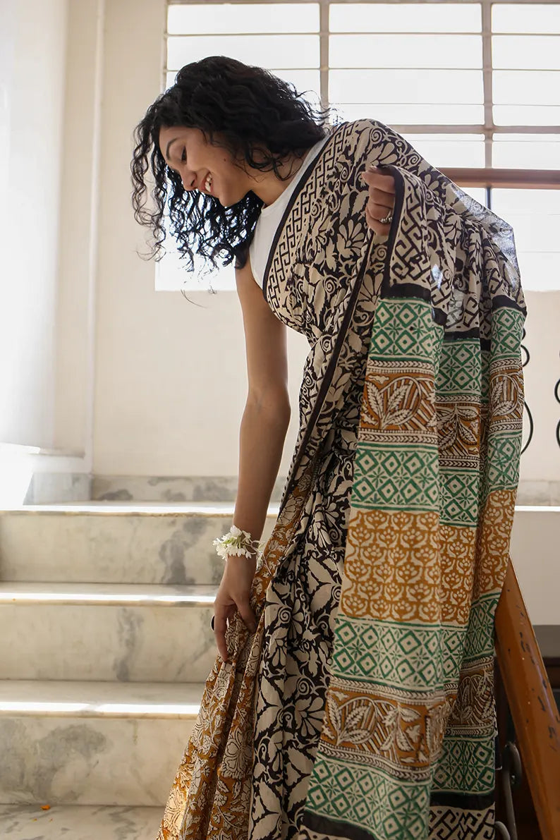Spring Garden - Dabu Hand Block Print Mulmul Cotton Bagru Saree