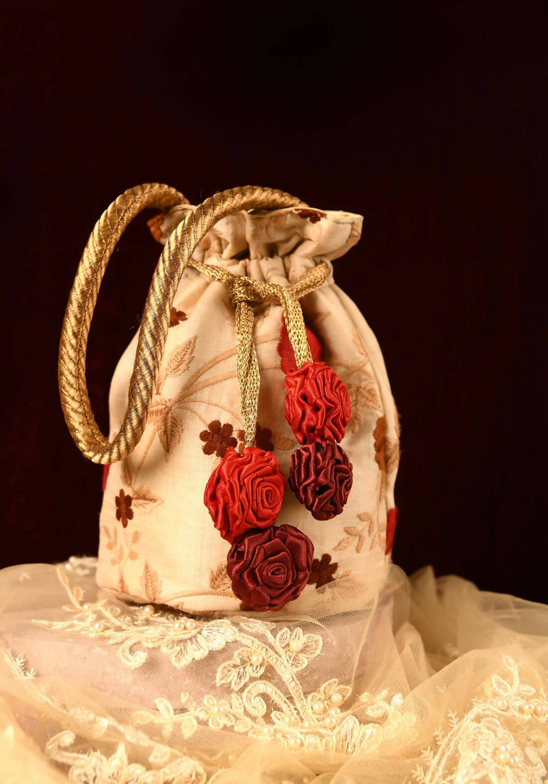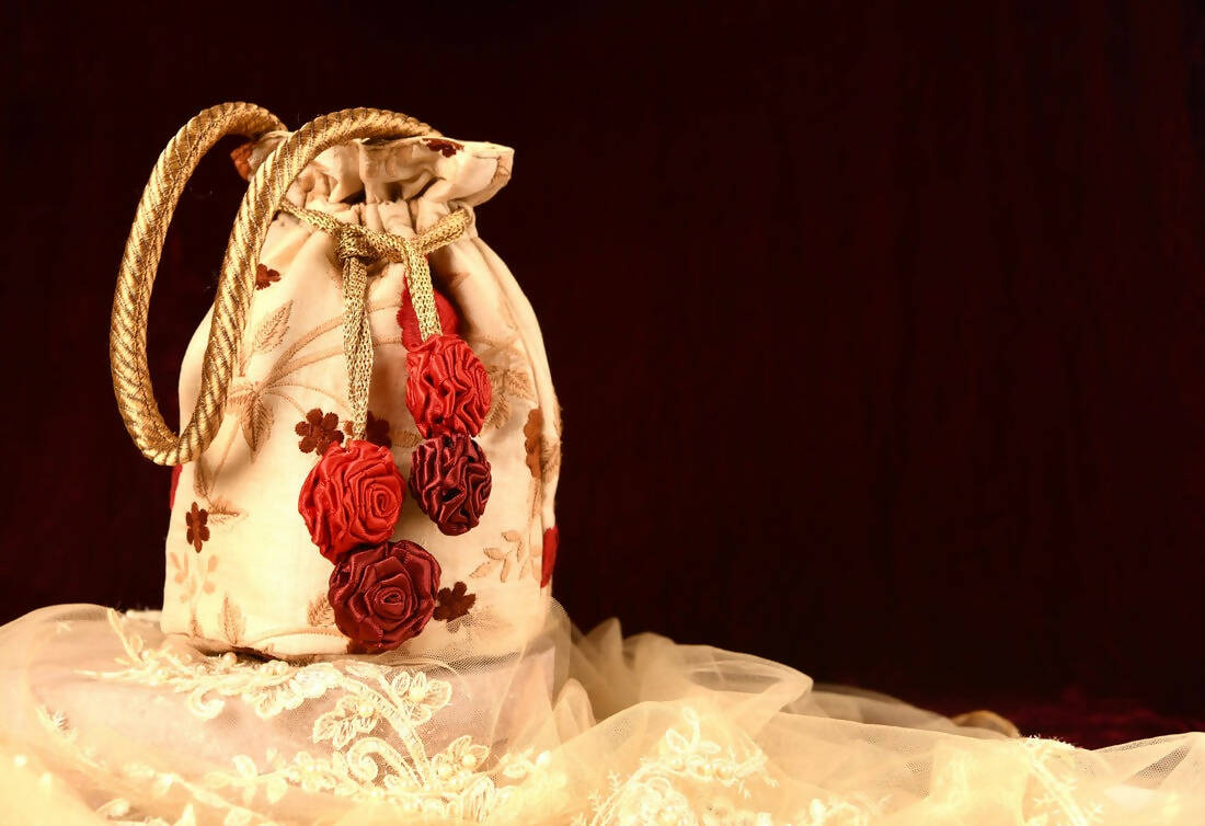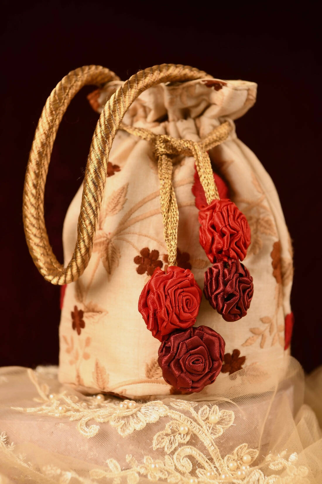 Elevate your festive or wedding attire with our exquisite Potli ethnic bag. Handcrafted, this bag is the perfect accessory to complement your traditional look. This pure silk embroidered potli with handmade rose tassels, satin lining, cushioning and two pockets exude with class aesthetics.