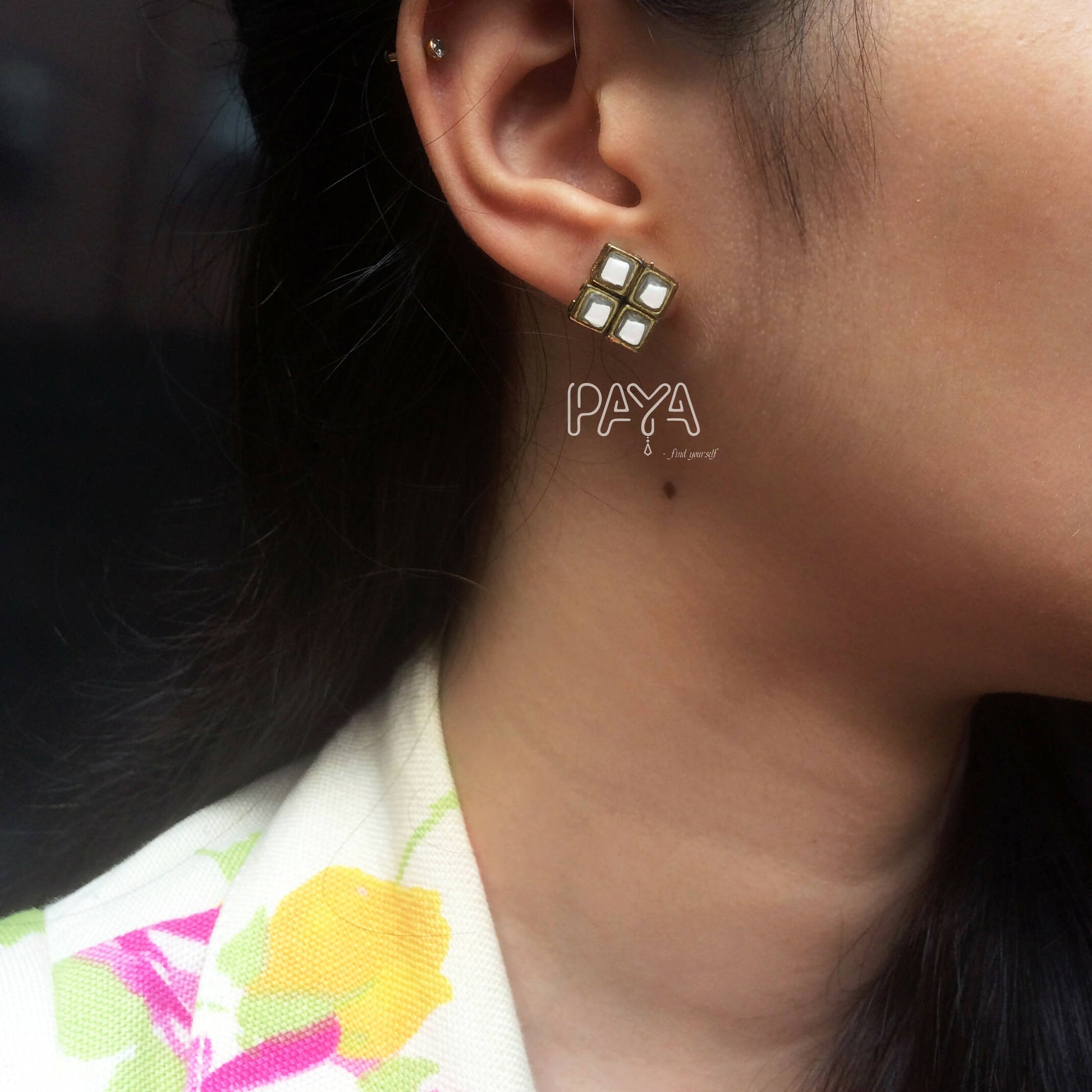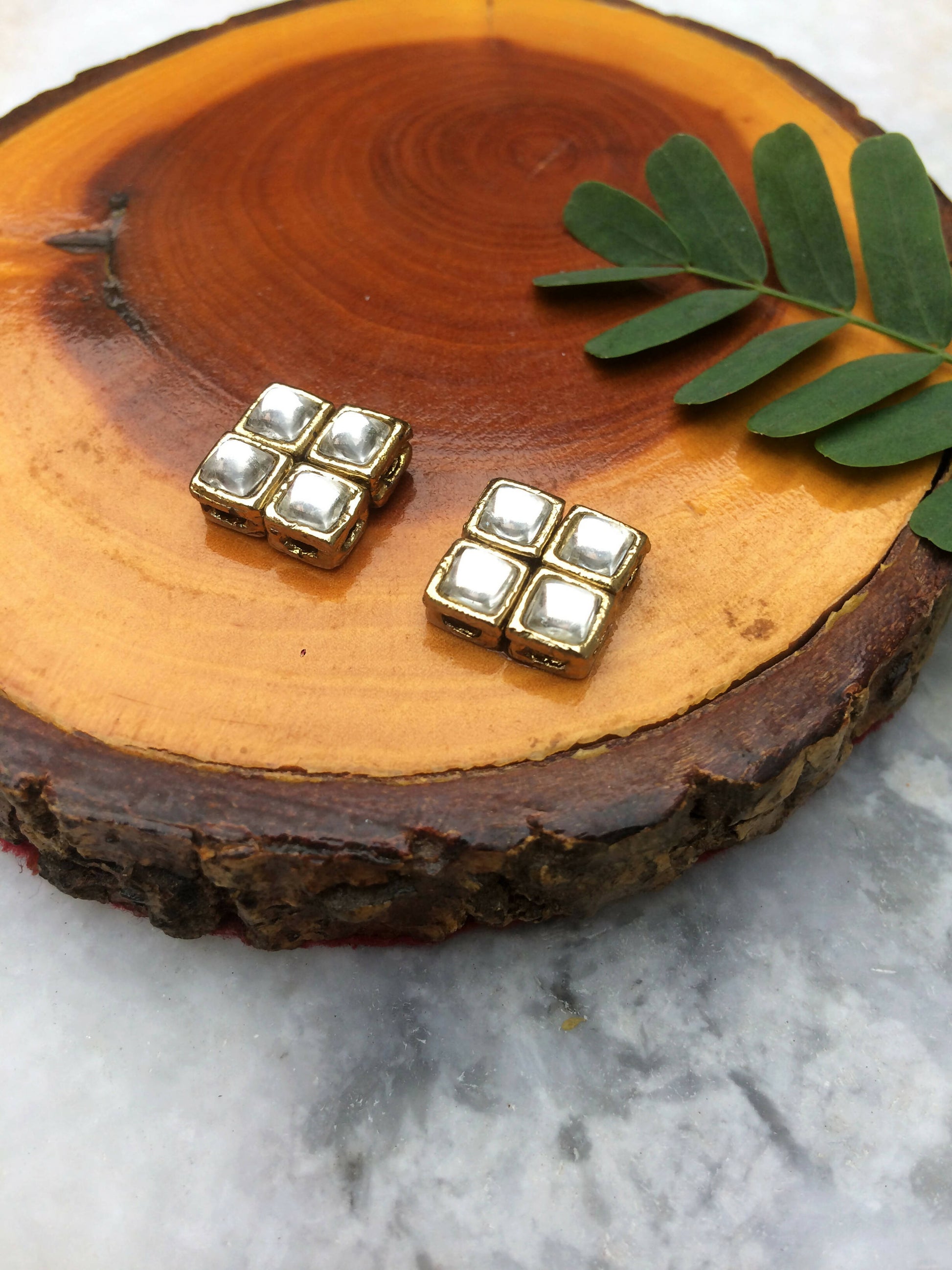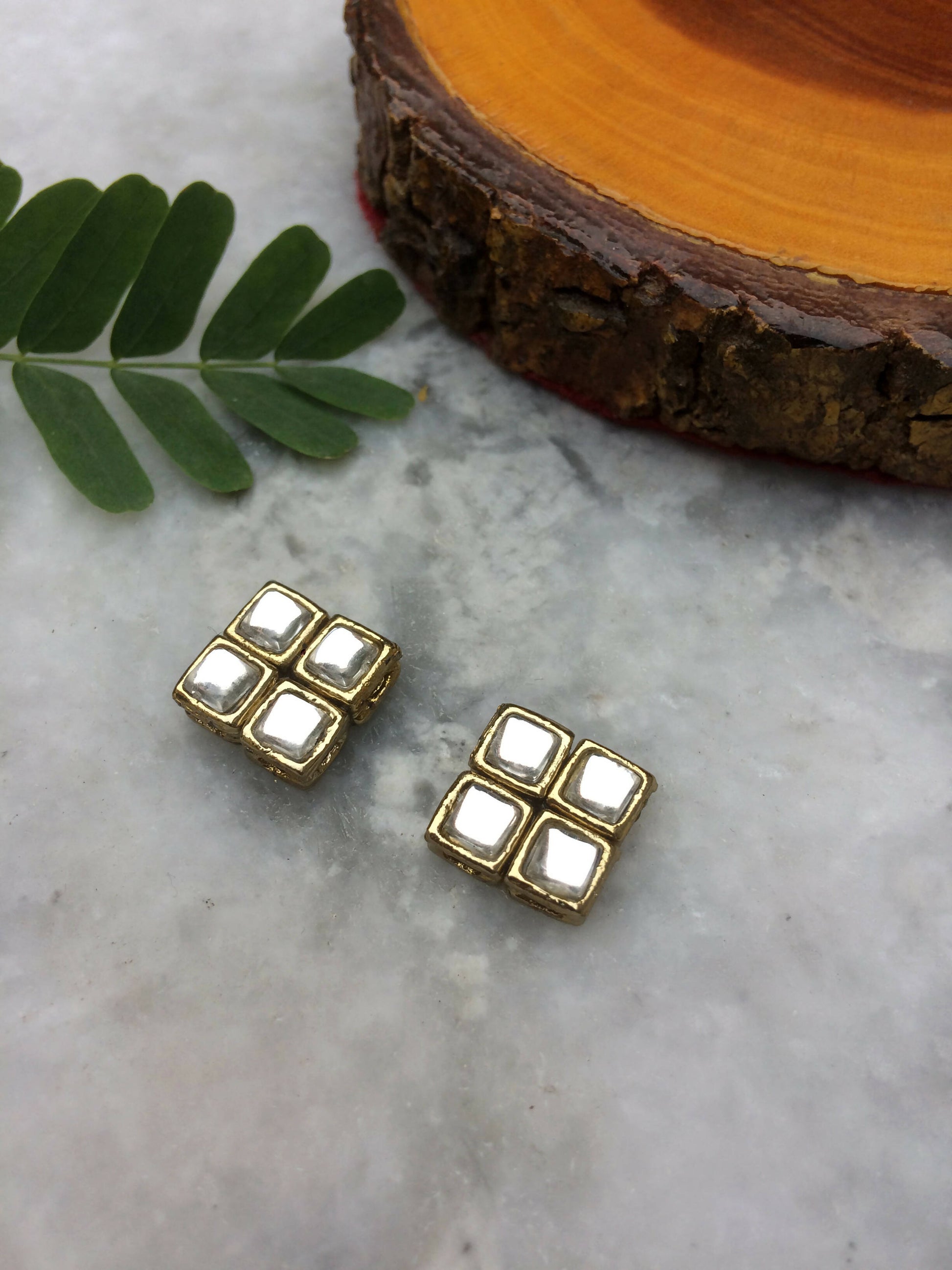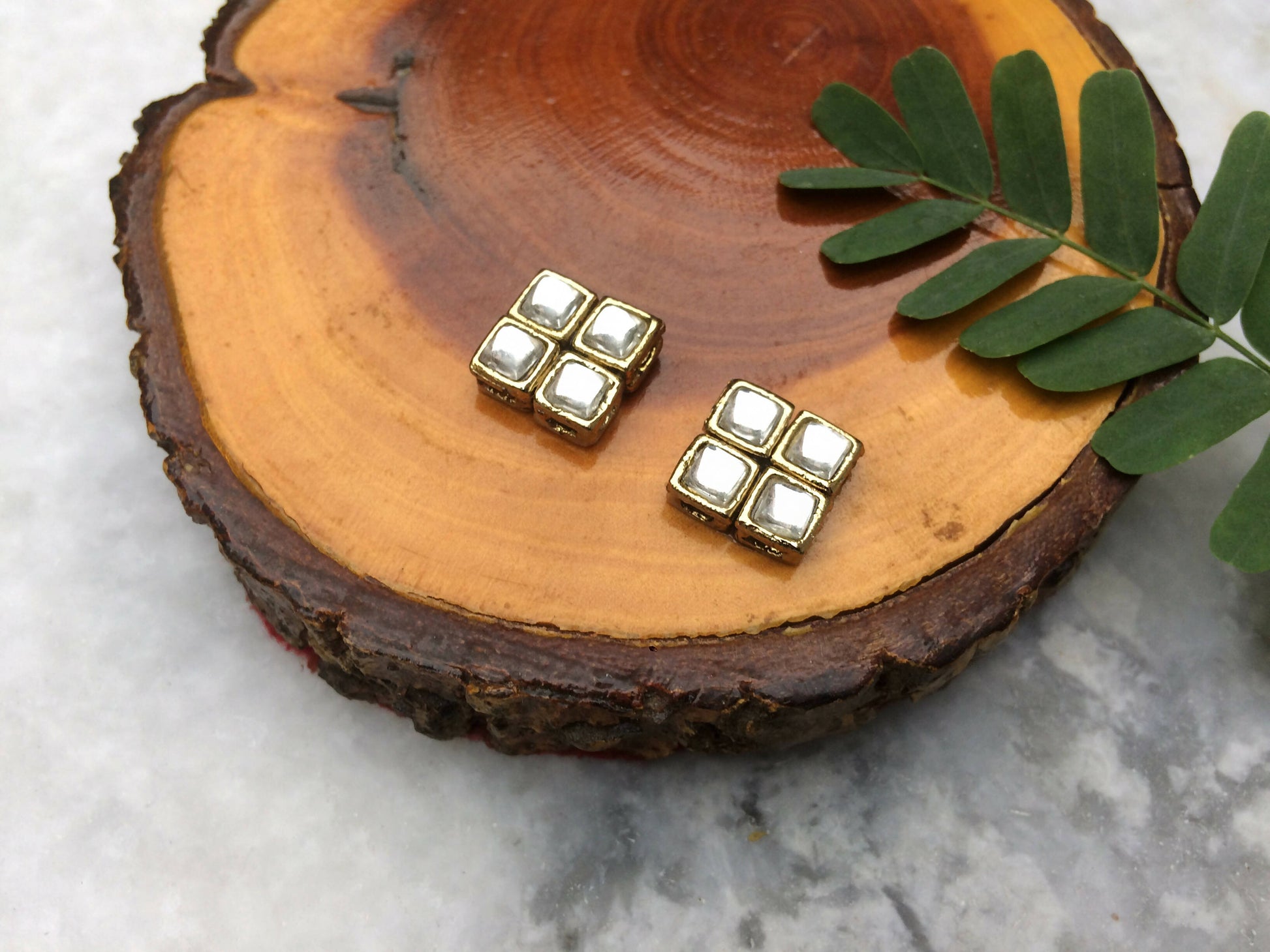 Add a touch of elegance to your everyday style with our Square Kundan Stud Earrings! These simple earrings have four square kundan stones, set in a metal gallery, connected together to complete the design.