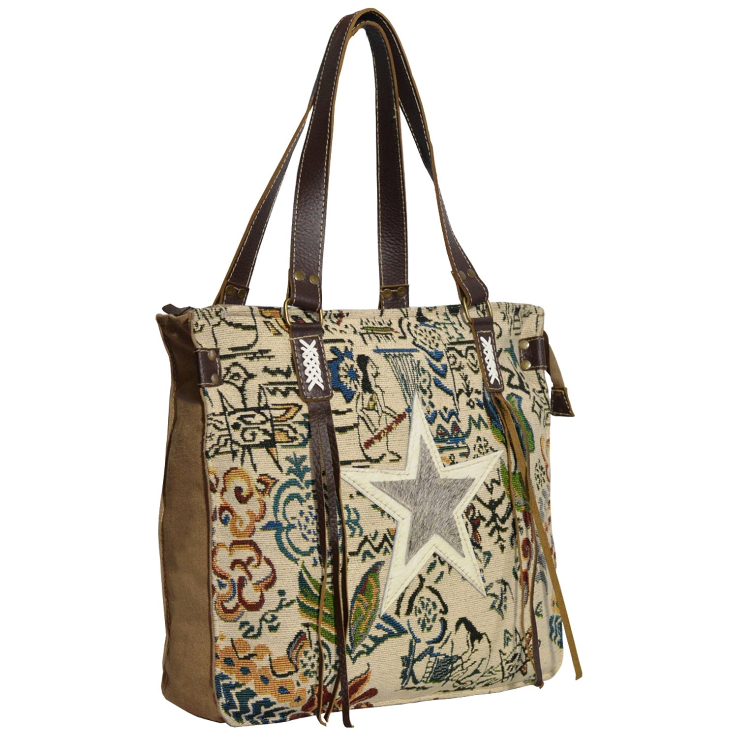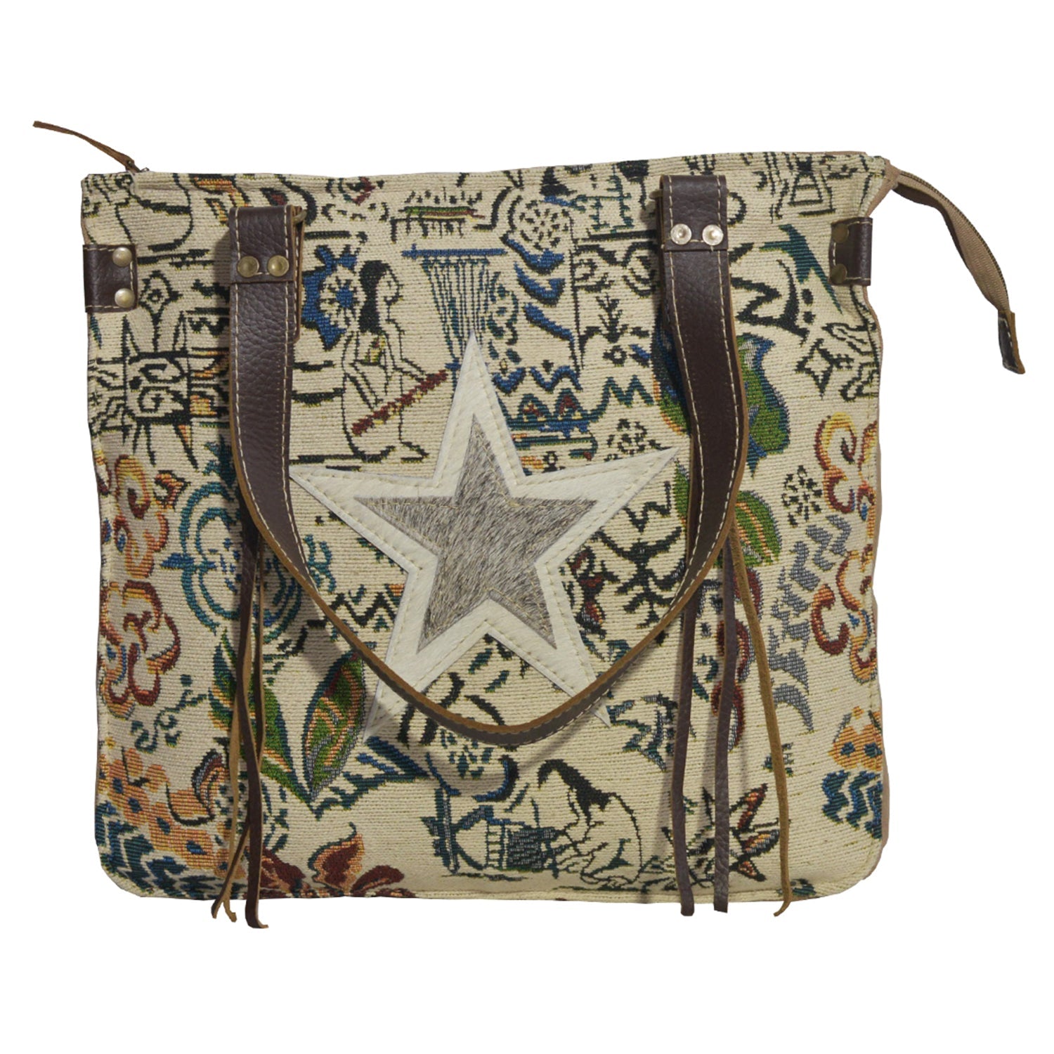 This is a Proudly Indian with a Floral pattern with a large structure that provides ample storage and includes various inner pockets. It has fringes add a refined crafty update bringing out the playful Vibe with stars.