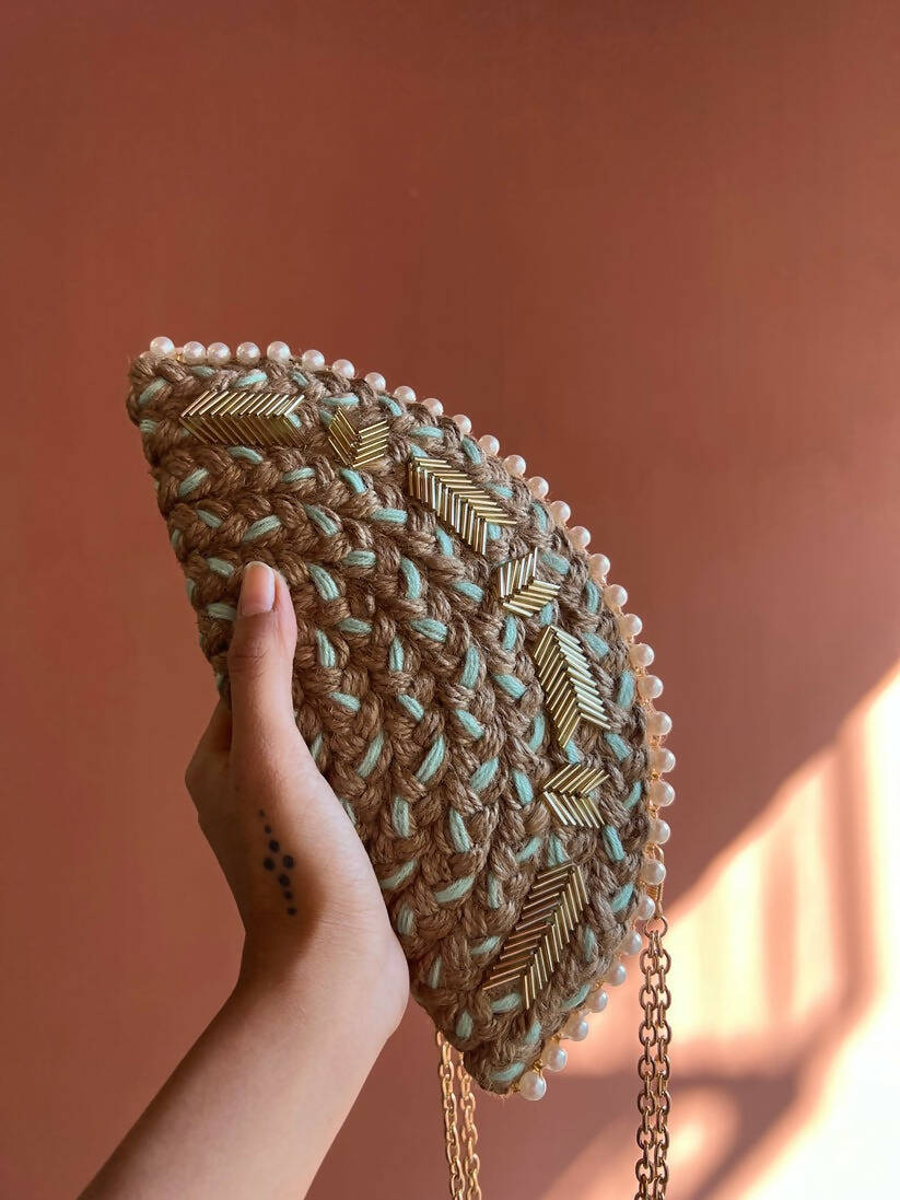 A true masterpiece skilfully crafted from natural jute and soft white wool. This elegant clutch is adorned with intricate bugle beads, adding a touch of starlight to your ensemble. As a tribute to our signature design, the Half Moon, this handcrafted bag is meticulously created from a single jute Dhaaga, showcasing the epitome of craftsmanship. It goes through 6 pairs of skilful hands to bring this special piece to life. Indulge in the uniqueness that every bag connoisseur deserves with this exceptional and honoured clutch.