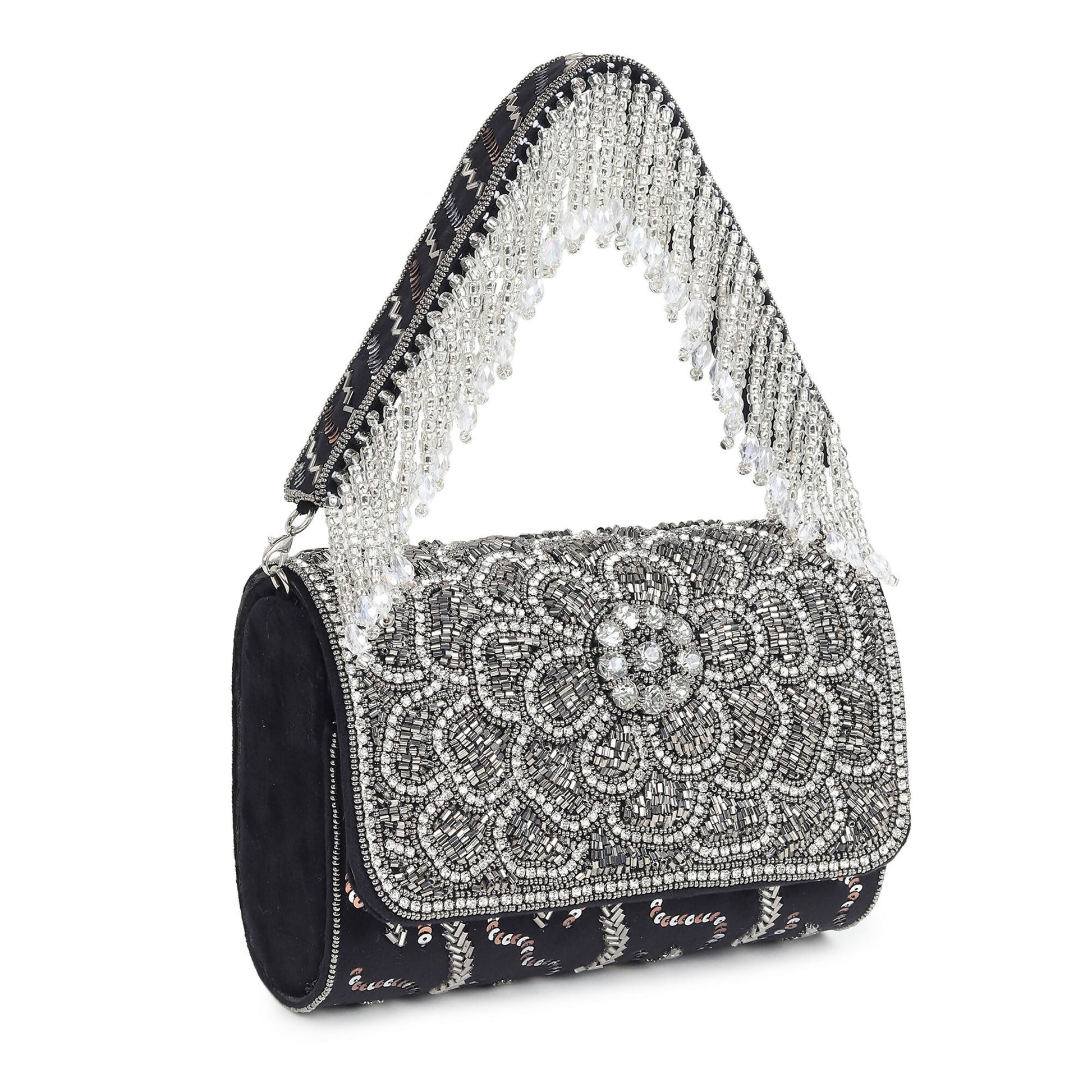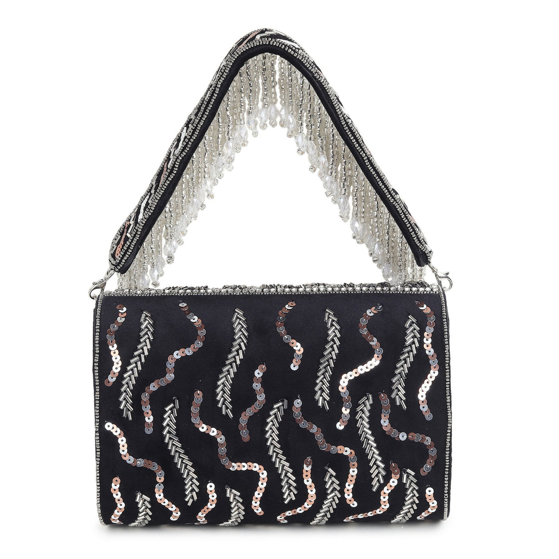 Introducing the Starlit Night Flap Bag a luxurious accessory crafted from premium black suede. Adorned with intricate silver cutdana work, it offers a captivating shimmer that exudes elegance. The chic short handle features stylish tassels, adding a playful touch to its sophisticated design. Perfect for any occasion, this bag effortlessly combines timeless beauty with contemporary flair.