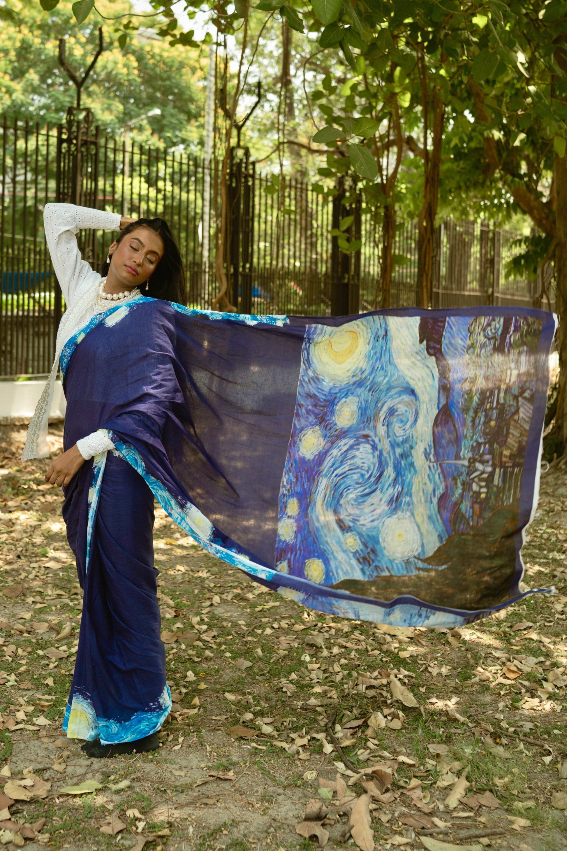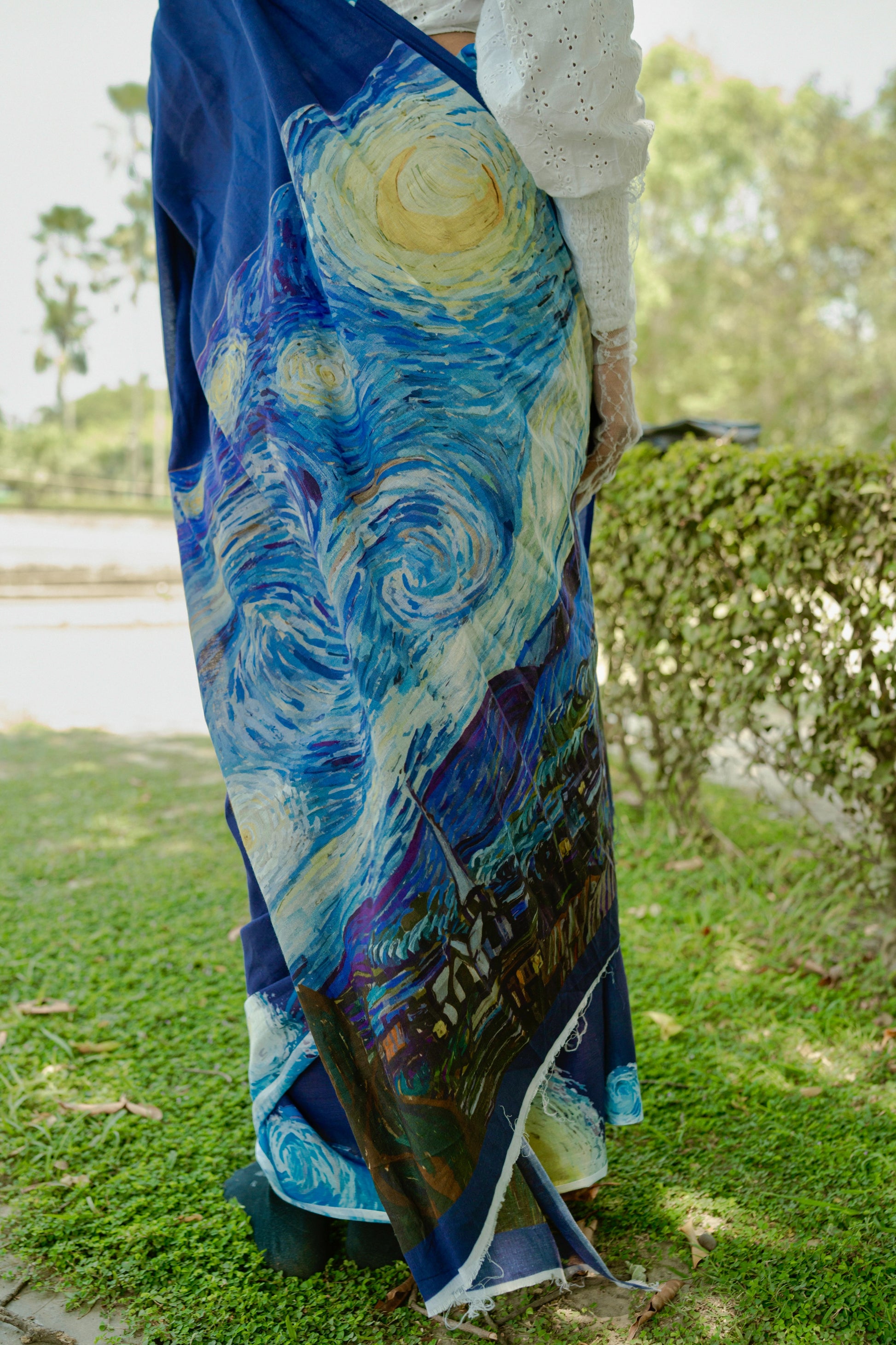 Large blossom branches like this against a blue sky were one of Van Gogh’s favourite subjects. Almond trees flower early in the spring making them a symbol of new life. Van Gogh borrowed the subject, the bold outlines and the positioning of the tree in the picture plane from Japanese printmaking. And here we have used this timeless art on mul cotton to create this piece.