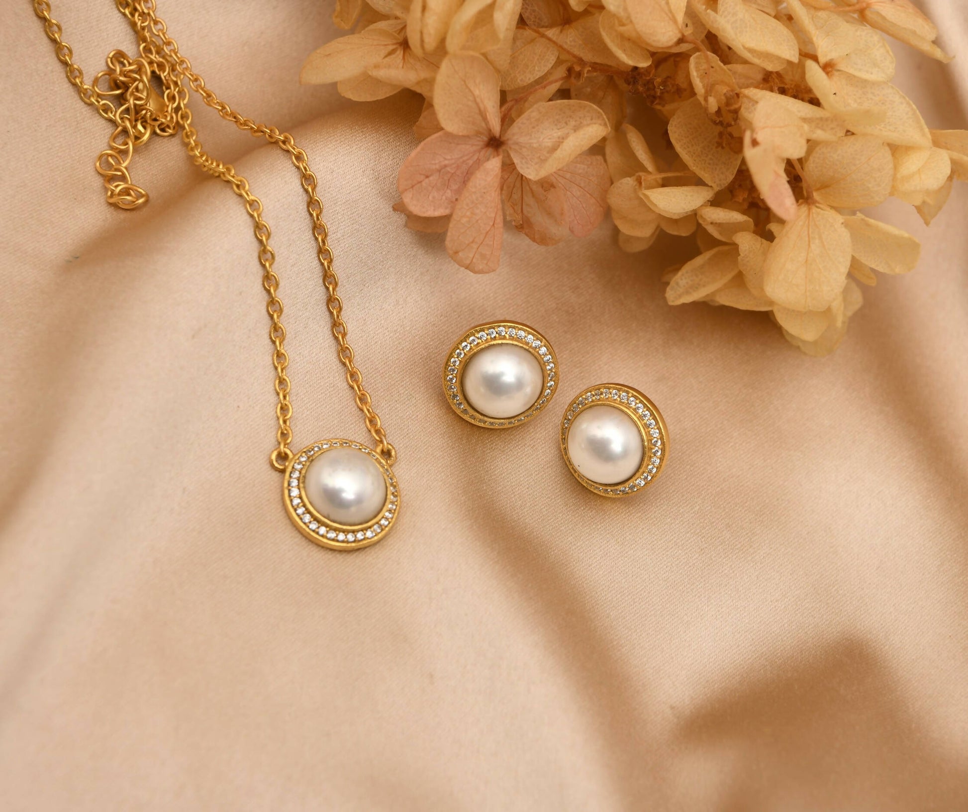 Glistening pearls set amidst premium zircon stones. A minimal and elegant jewel that surely deserves a places in your jewellery box!