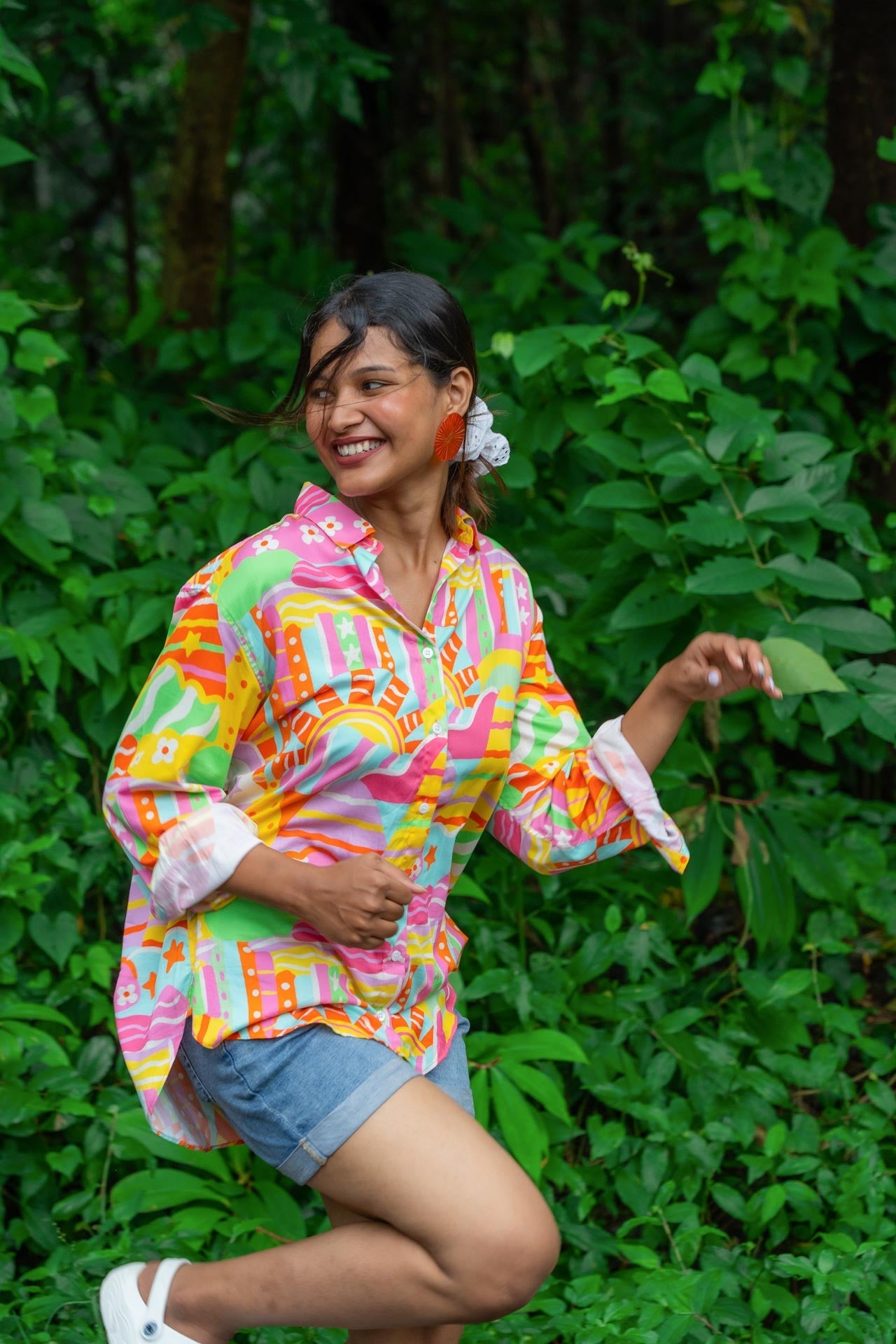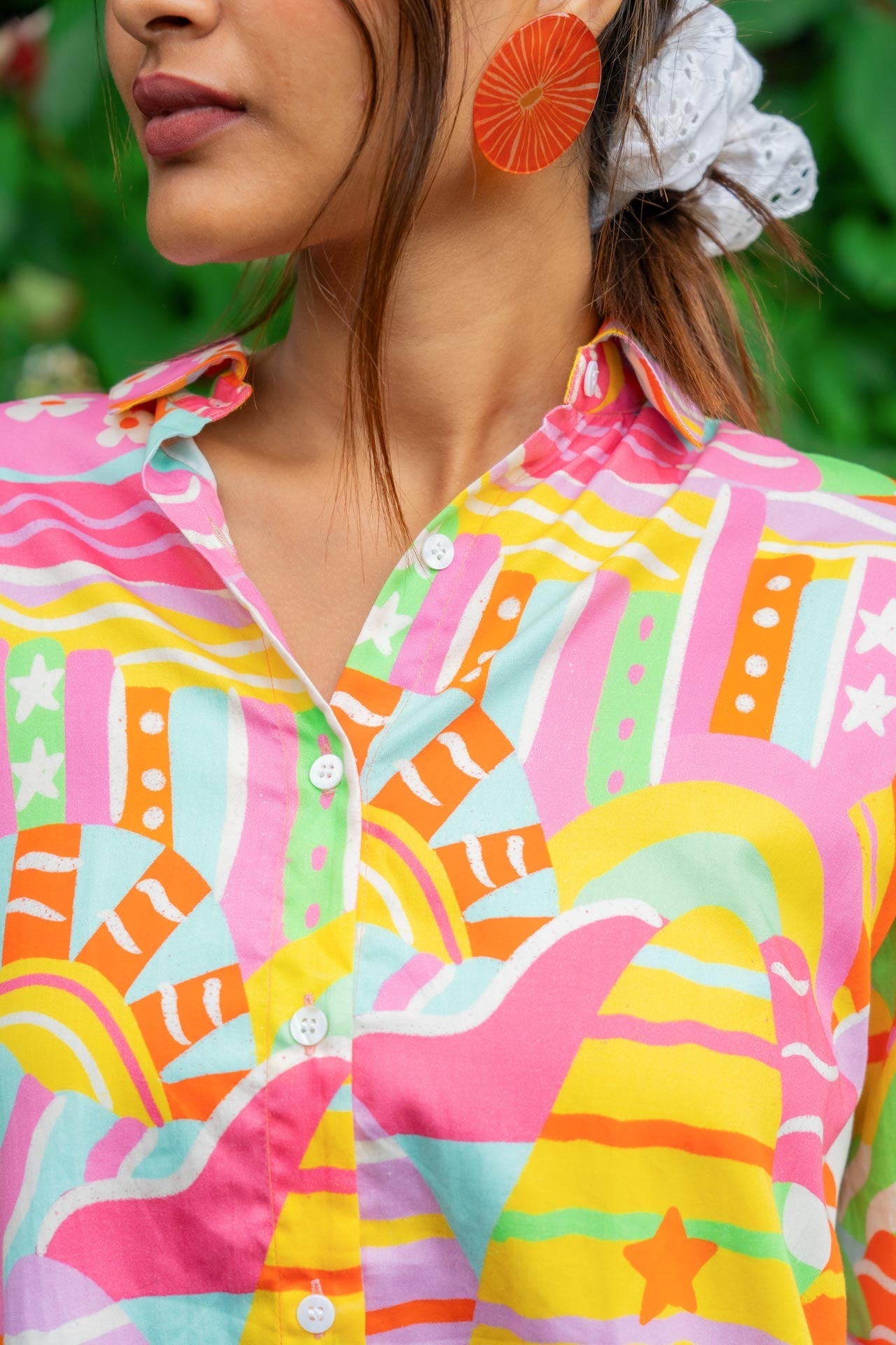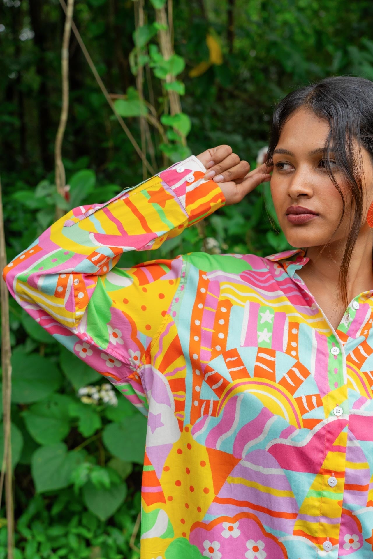 Crafted from 100% cotton, it drapes beautifully with dropped shoulders and luxurious mother of pearl buttons. Embrace the enchanting combination of stars and flowers, and let your inner rainbow unicorn shine! Made with care in Goa, this shirt is your ticket to effortless chic.