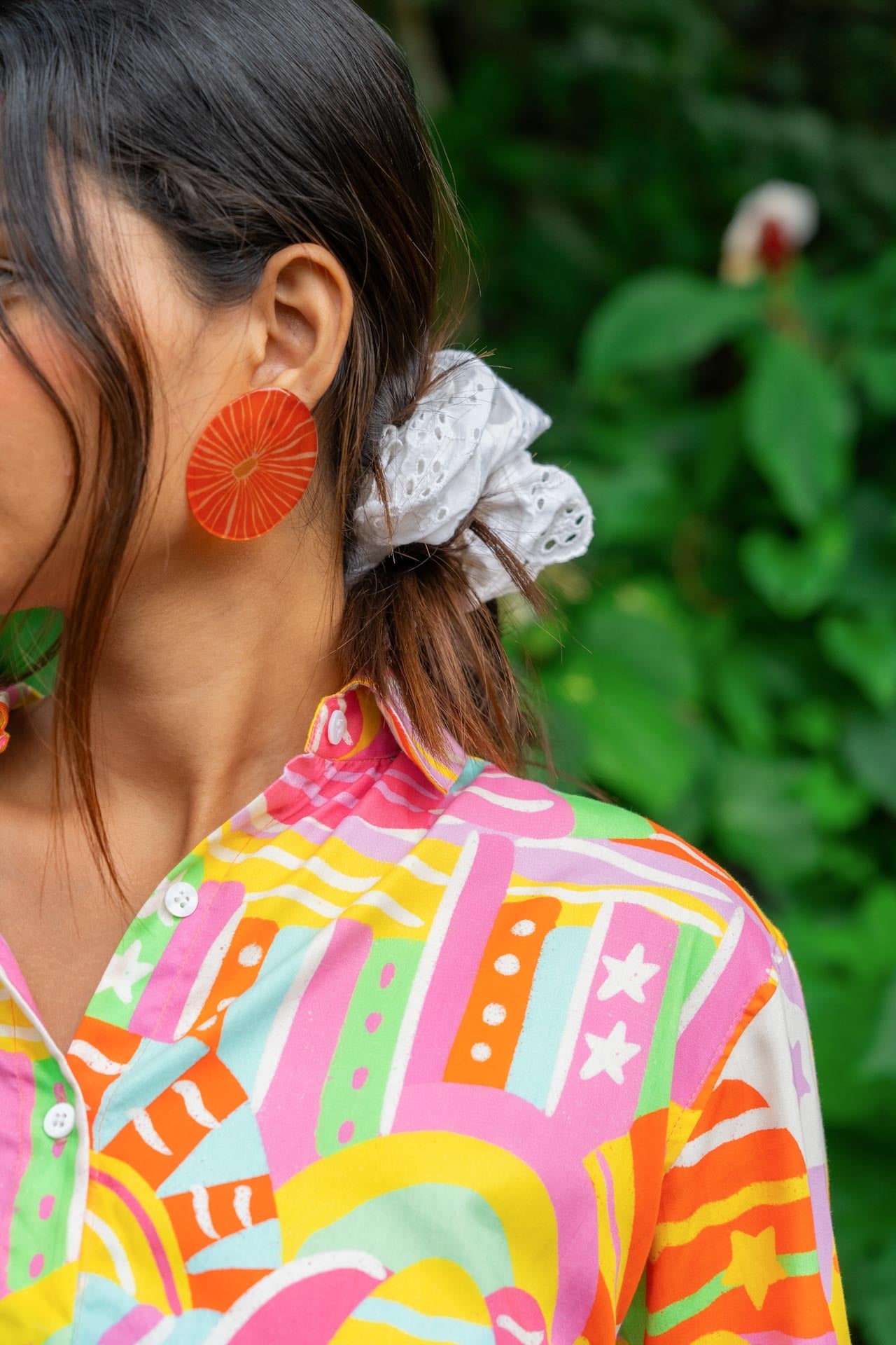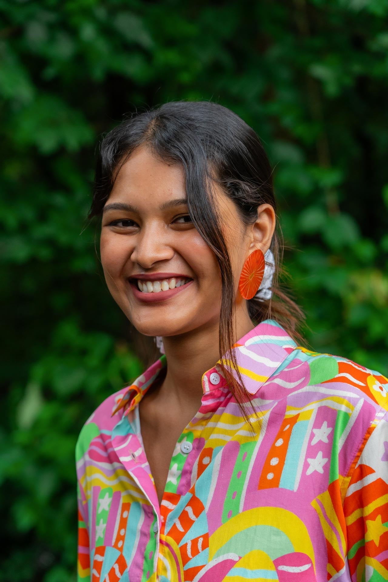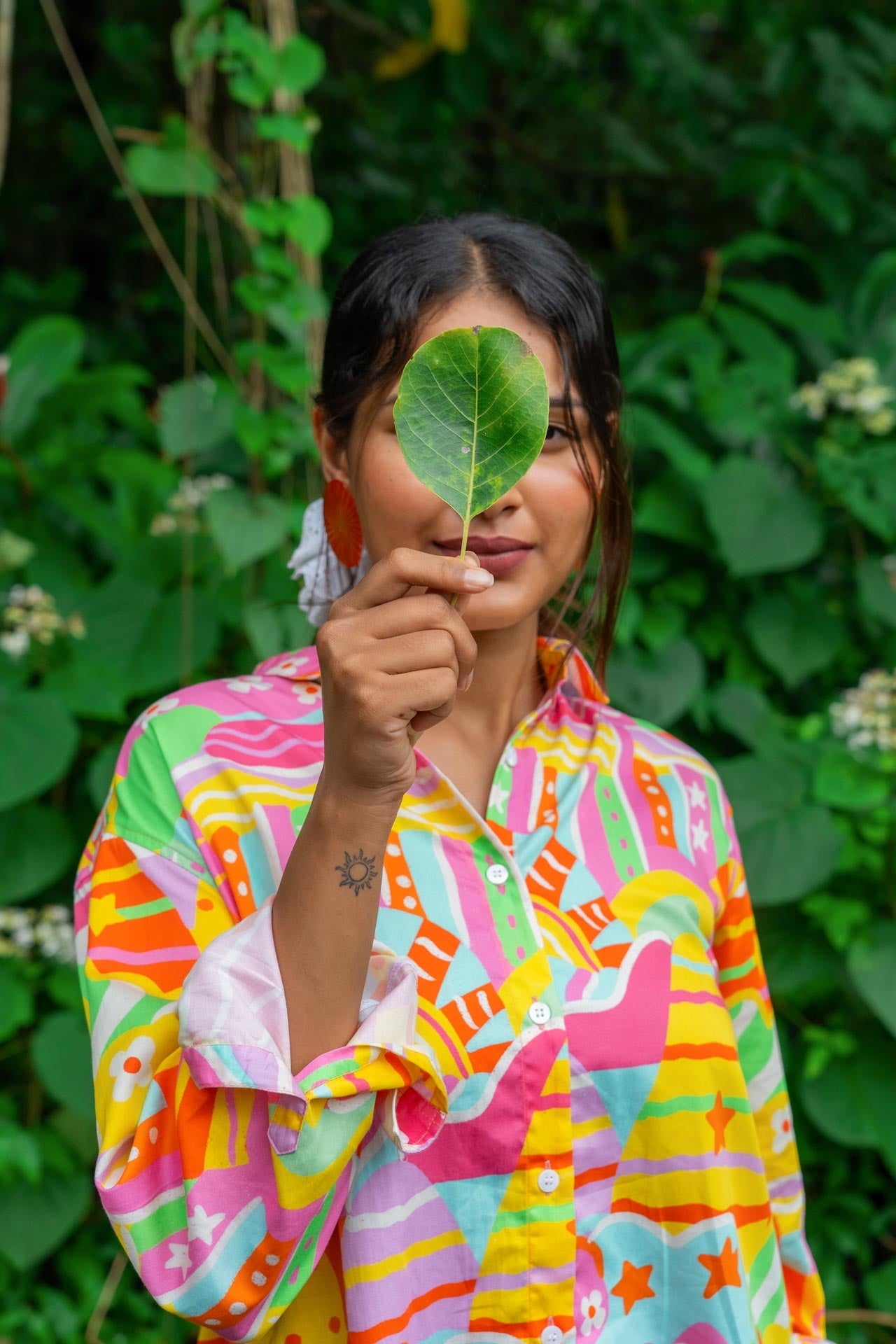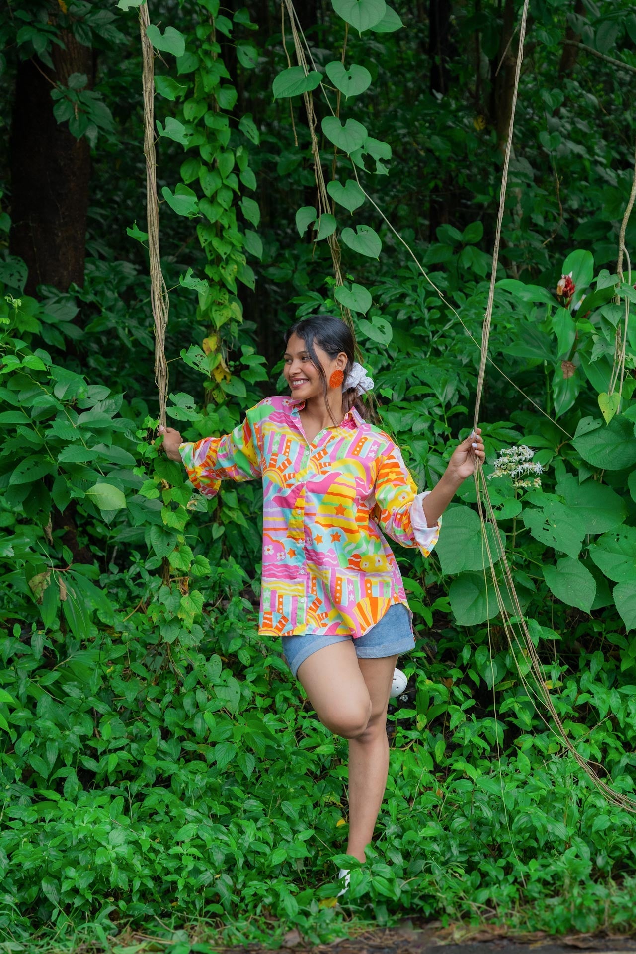 Crafted from 100% cotton, it drapes beautifully with dropped shoulders and luxurious mother of pearl buttons. Embrace the enchanting combination of stars and flowers, and let your inner rainbow unicorn shine! Made with care in Goa, this shirt is your ticket to effortless chic.