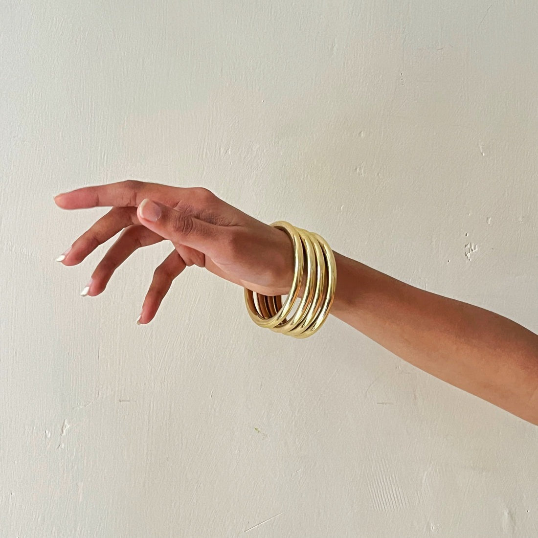 Set of 4 Gold Bangles with intricate geometric patterns and textured accents that command attention.