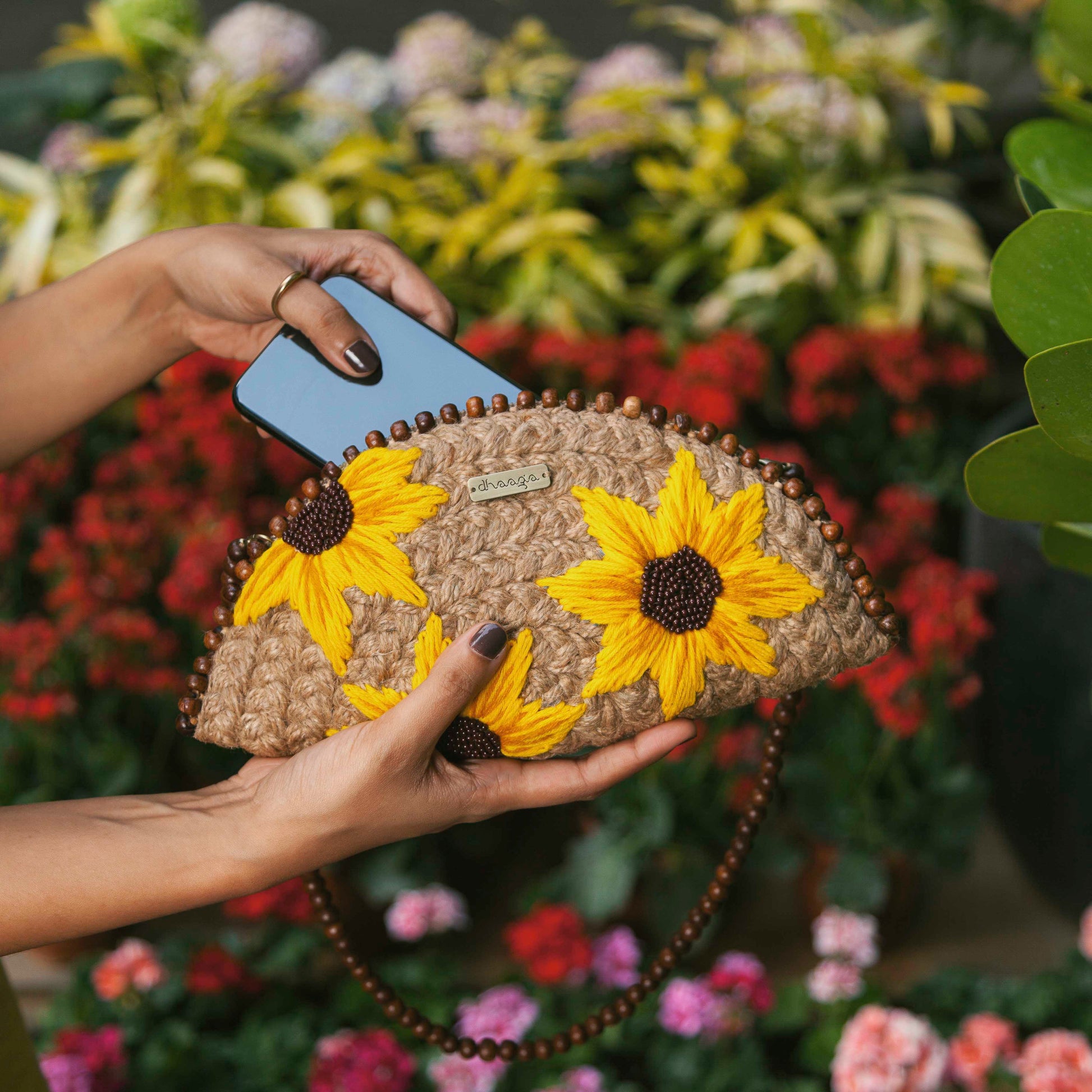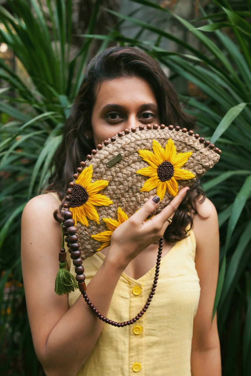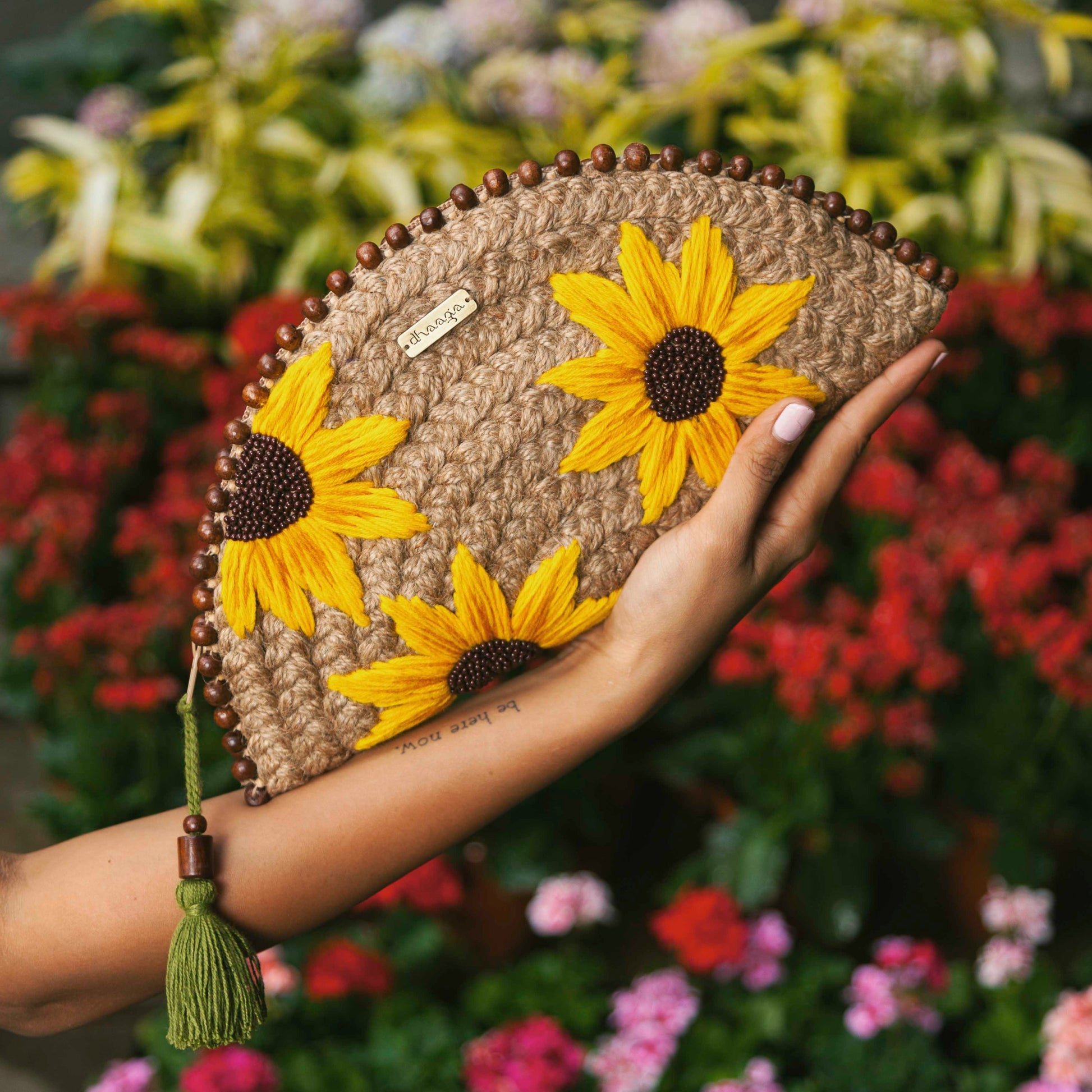 Your fresh spring and summer look with our Sunflower Meadow Clutch, a handcrafted masterpiece that embodies the essence of Sunflower Meadow half moon clutch bag, sunny days and blooming meadows. Adorned with vibrant sunflowers delicately embroidered on natural jute and lined with rustic wooden beads, this clutch radiates organic charm and natural beauty.