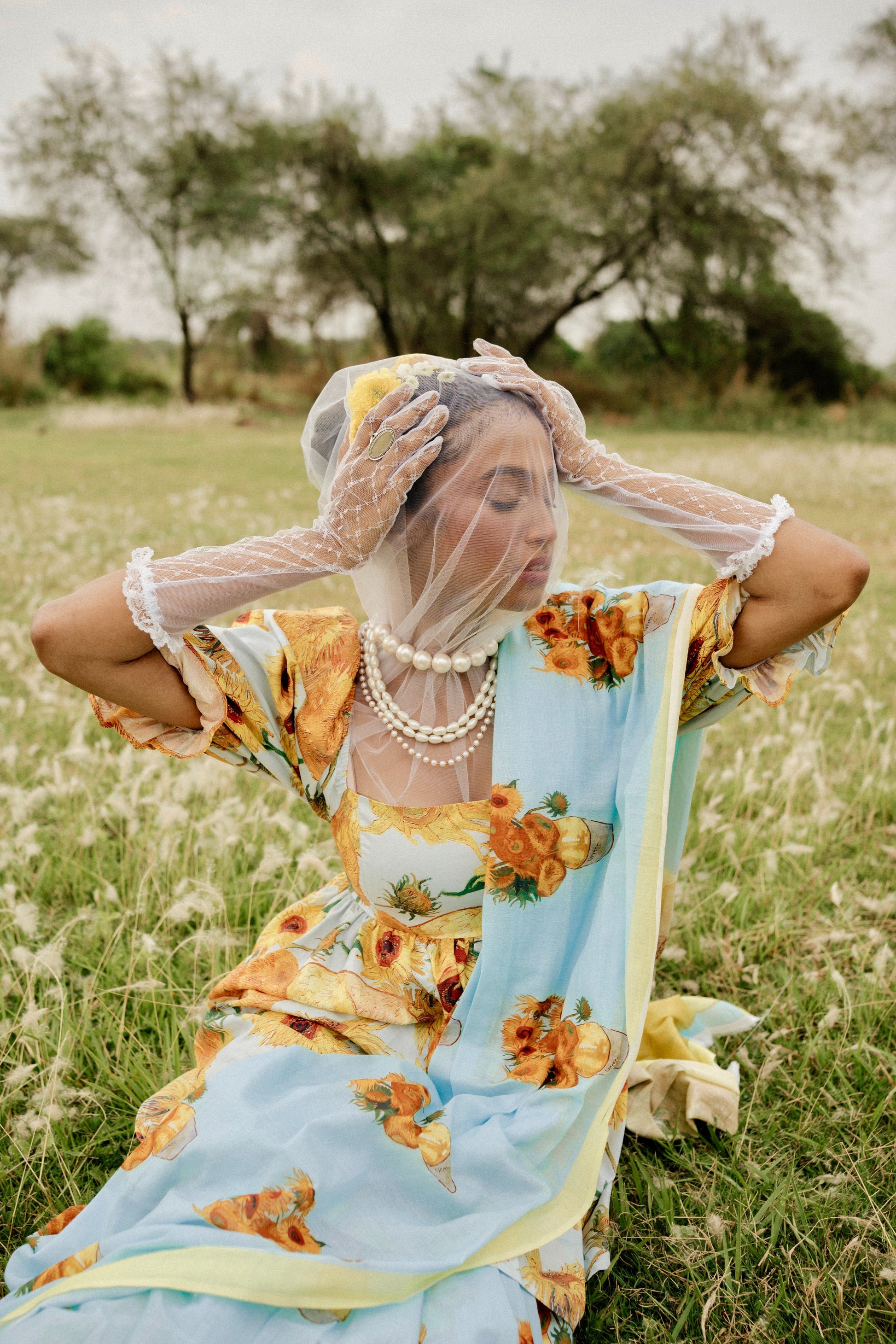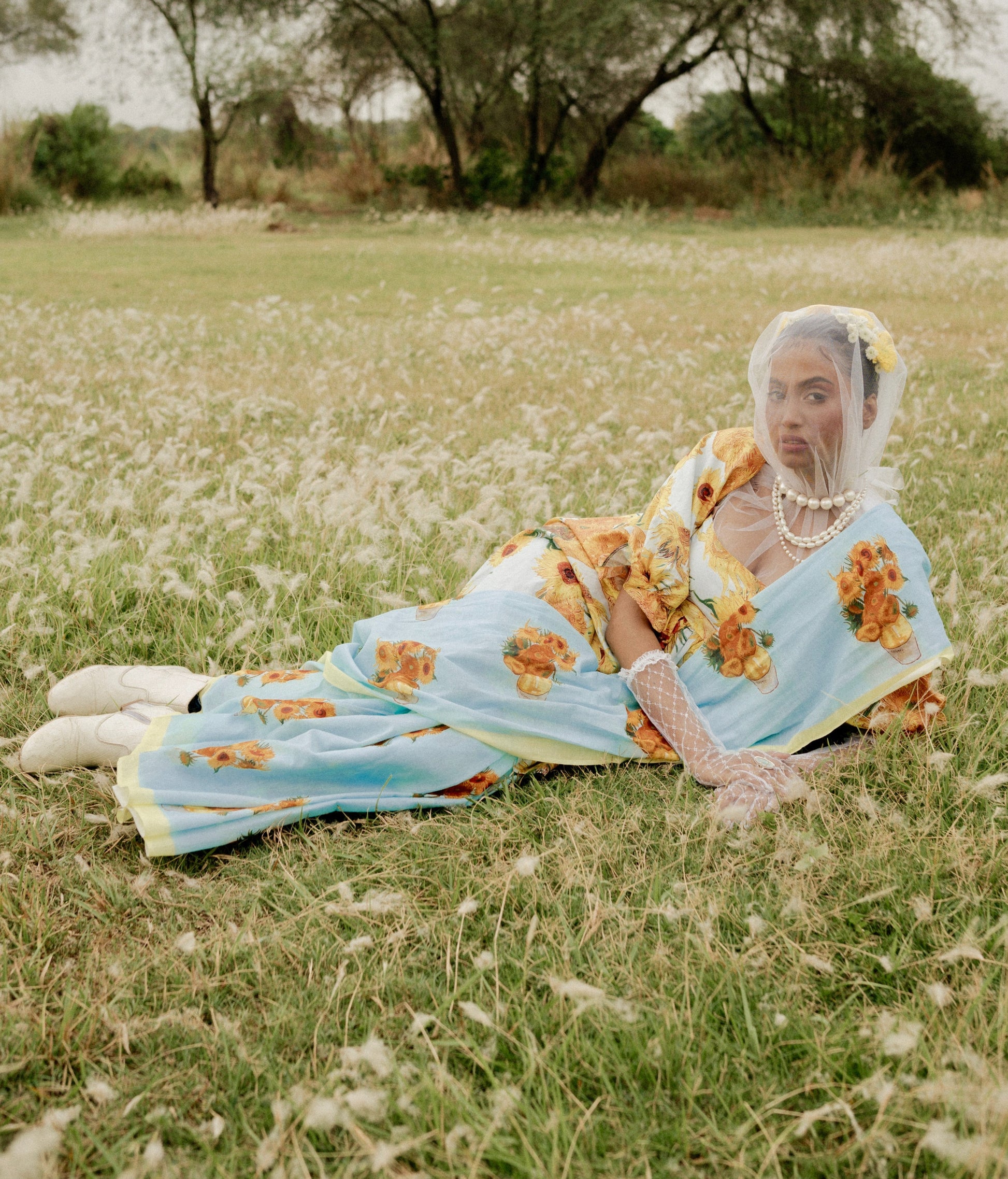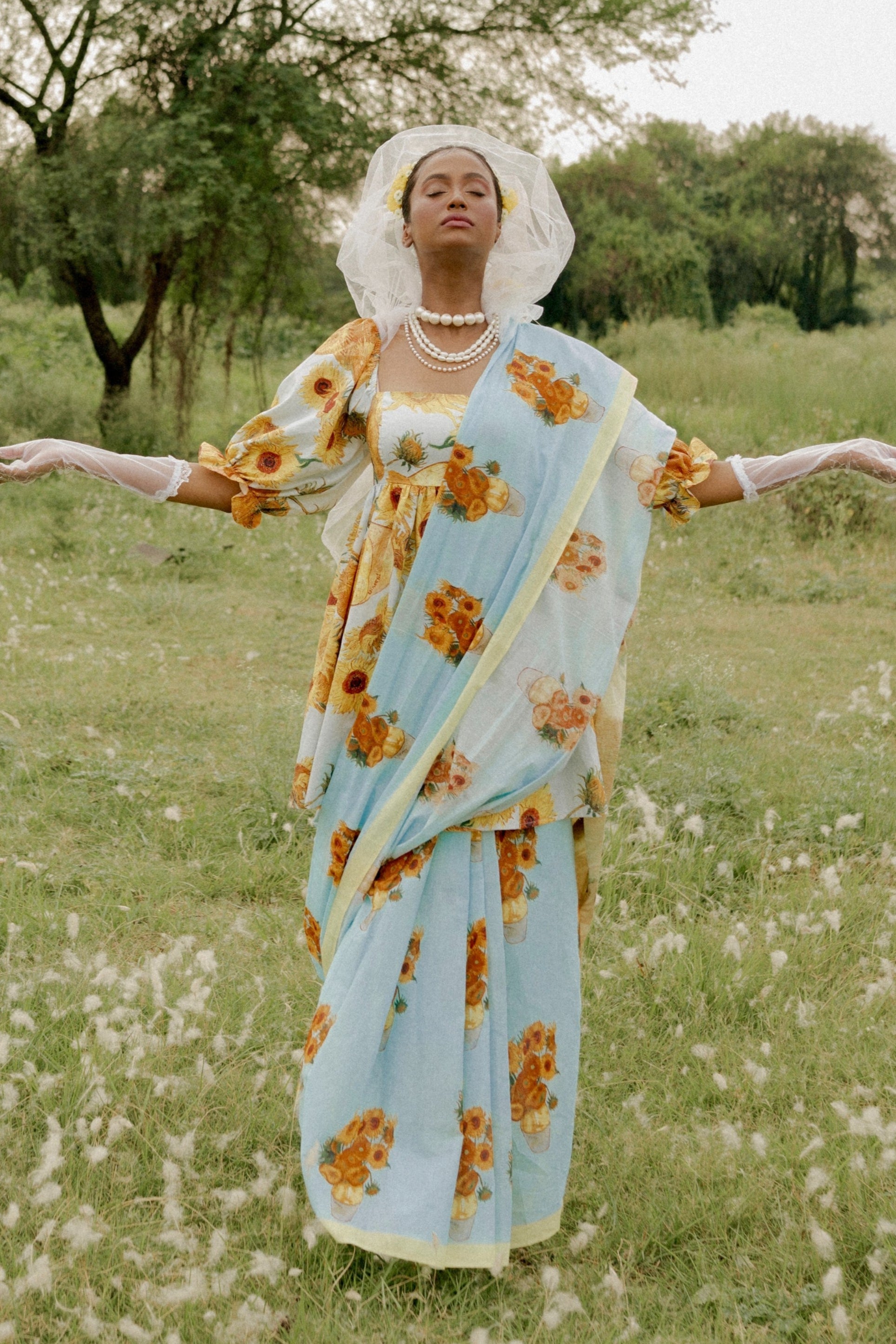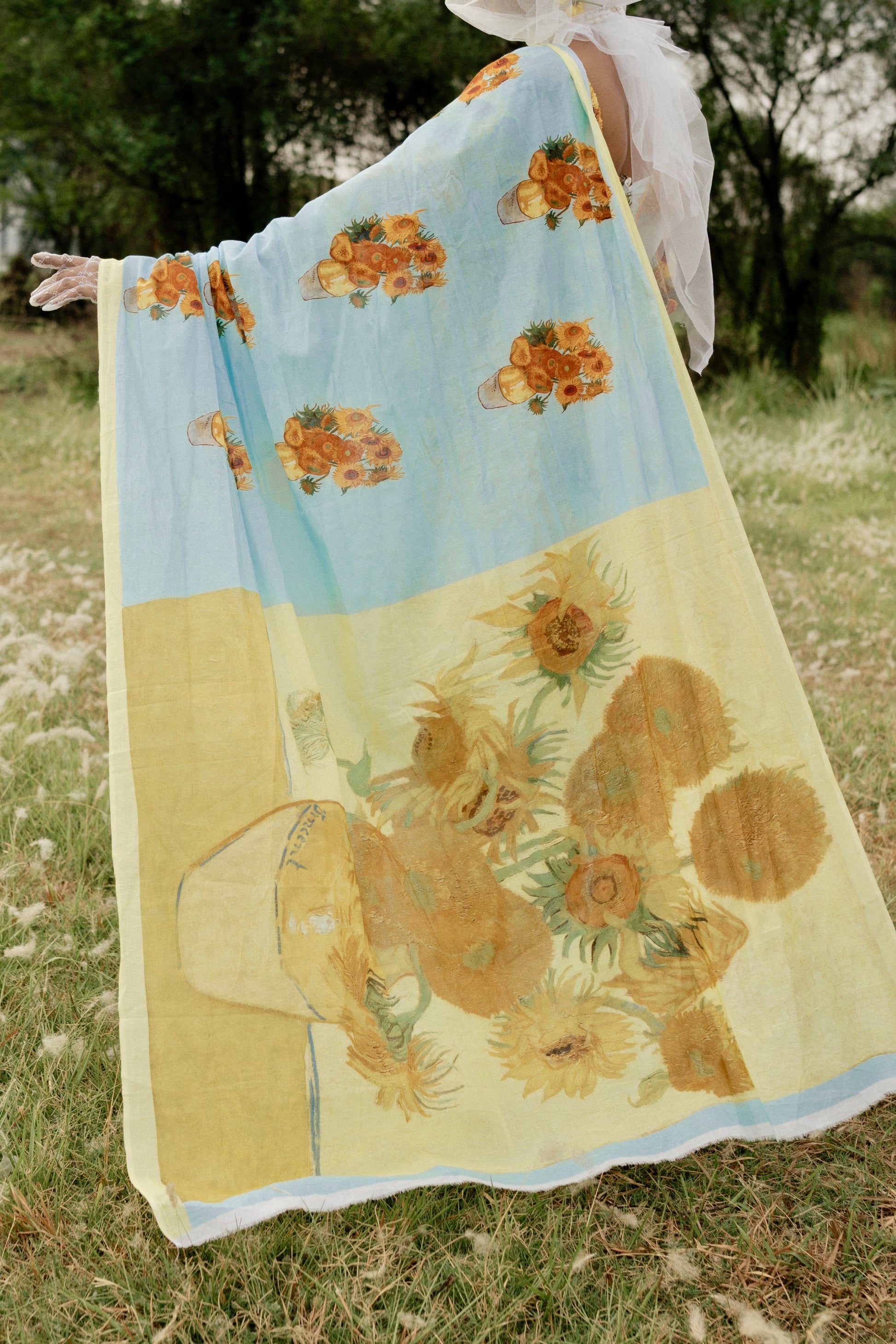 Van Gogh’s paintings of Sunflowers are among his most famous. He did them in Arles, in the south of France, in 1888 and 1889. Vincent painted a total of five large canvases with sunflowers in a vase, with three shades of yellow ‘and nothing else’. In this way, he demonstrated that it was possible to create an image with numerous variations of a single colour, without any loss of eloquence. And here we have used this timeless art on mul cotton to create this piece.