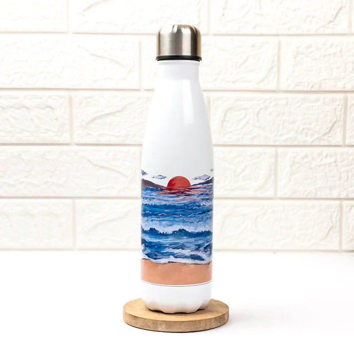 The Sunset Shores Steel bottle showcases a beautiful sunset at the sea exuding serene tranquility! This bottle is crafted with high quality 304 grade double walled stainless steel interior to keep hot drinks hot or cold drinks cold for hours. No wonder this is the most preferred choice when it comes to beautiful yet thoughtful gifting.