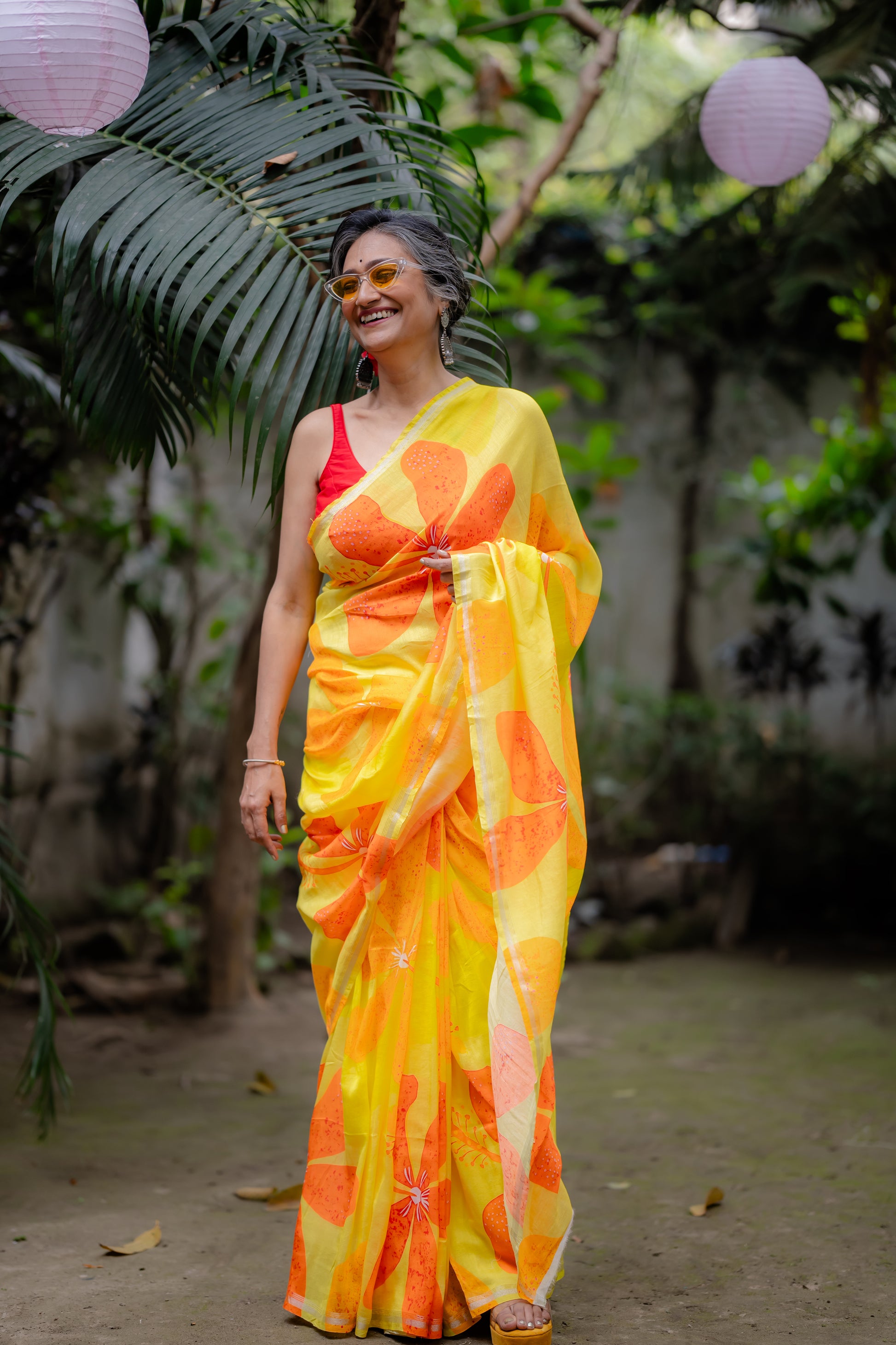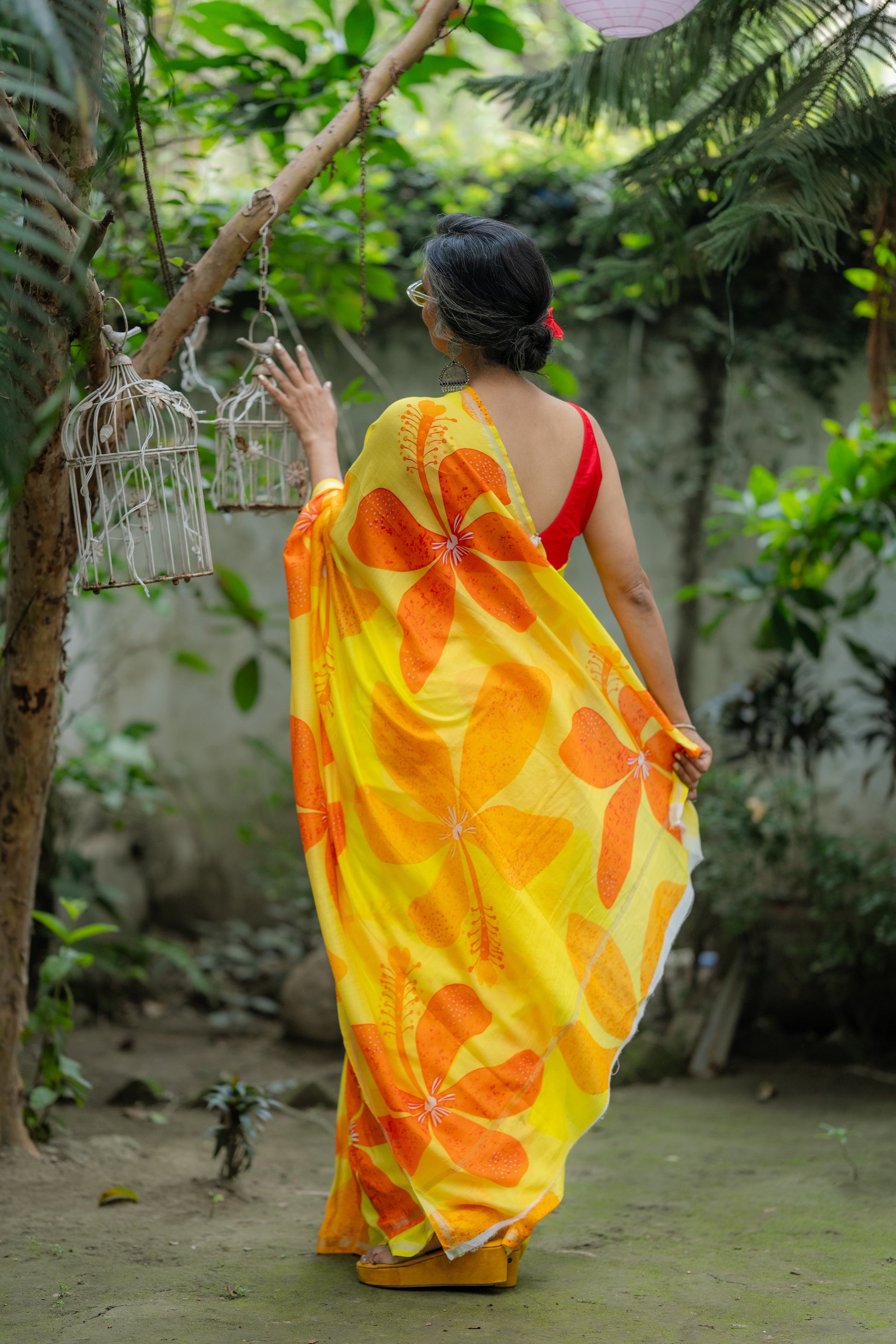 The vibrant yellow backdrop adds a sunny and cheerful touch to the ensemble, making it an ideal choice for brightening up any event or vacation. Whether you are lounging at a seaside or exploring the desert landscape or attending an elegant evening ballroom affair, the “Sunshine Hibiscus” saree is sure to turn heads and make a statement wherever you go.