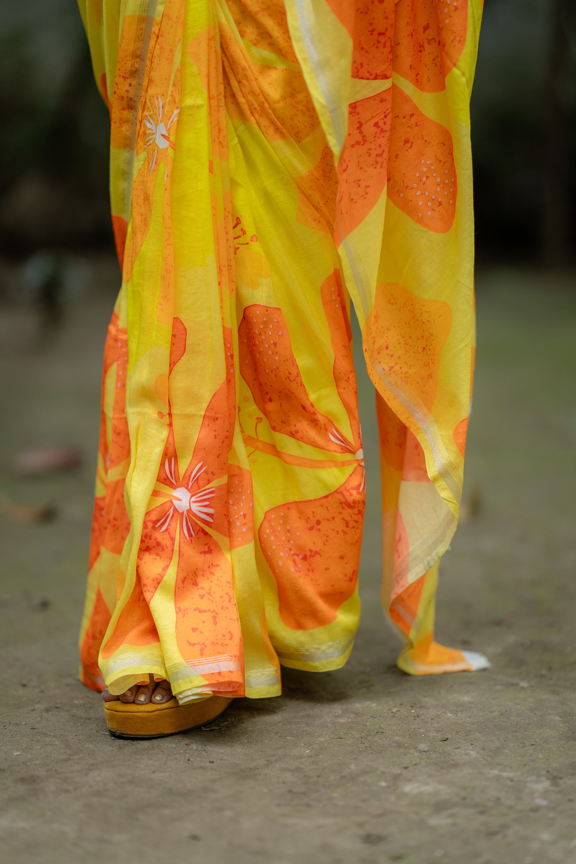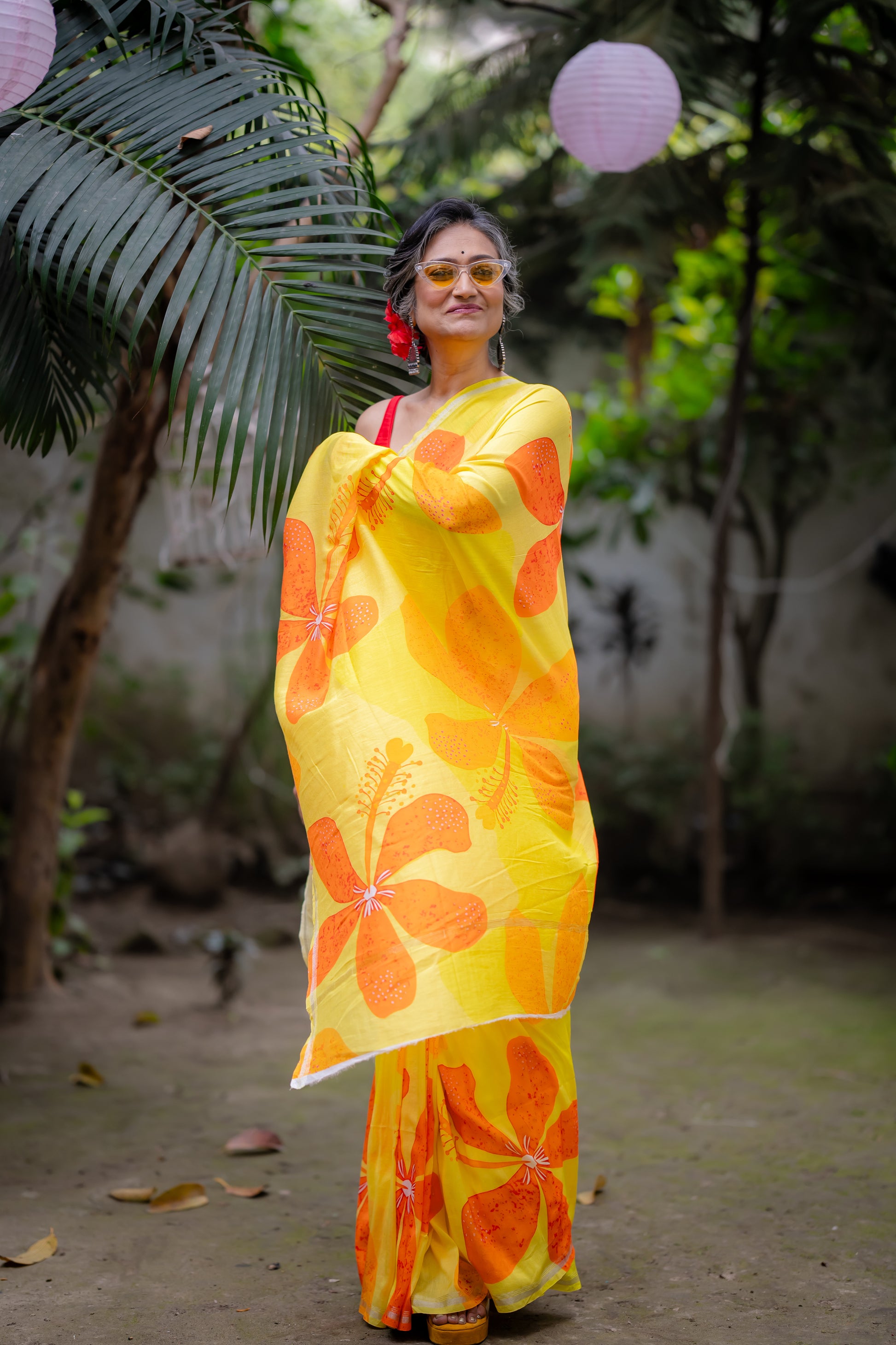 “Sunshine Hibiscus”, a stunning and vibrant ensemble that exudes the radiant beauty of summer blooms in full swing. Crafted on luxurious chanderi fabric, this saree features large hibiscus flowers printed on a bright yellow background, creating a striking and eye-catching design that is perfect for any occasion.While hibiscus flowers are often associated with religious functions, the “Sunshine Hibiscus” saree reimagines them as a symbol of summer vitality and joy.