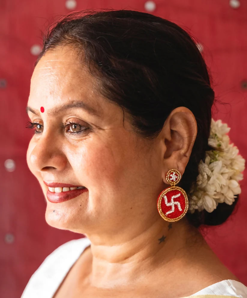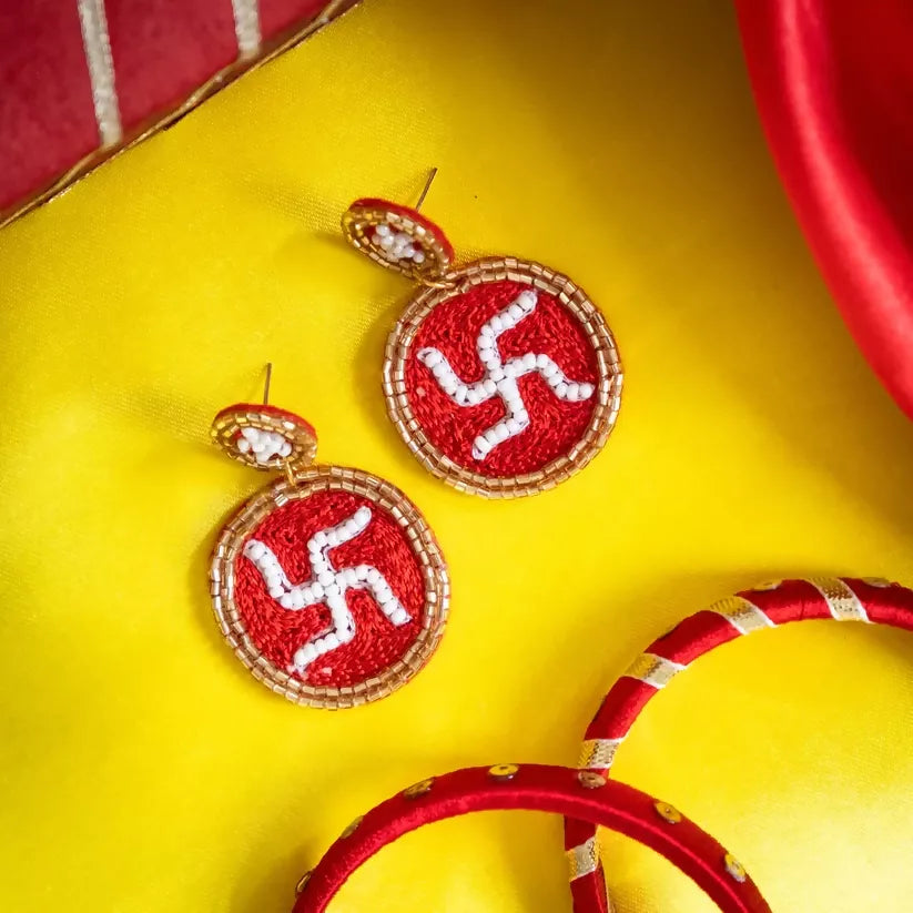 Celebrate in style with these elegant red earrings adorned with a delicate swastika motif. The rich red hue symbolizes prosperity and good fortune, adding a touch of auspiciousness to your celebrations.