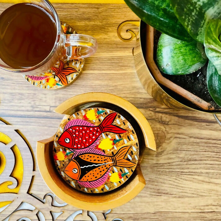 The wooden coasters capture two incredible artworks of India. Mirroring the woodwork of Saharanpur, the coaster is a depiction of excellent craftsmanship. The embellishment done with Pattachitra motifs perfectly holds the intricate hand movements of Pattachitra artists.Carved from native mango wood, the handcrafted wooden coasters, completely plastic-free and metal-free, give a sustainable and artistic twist to your personal space