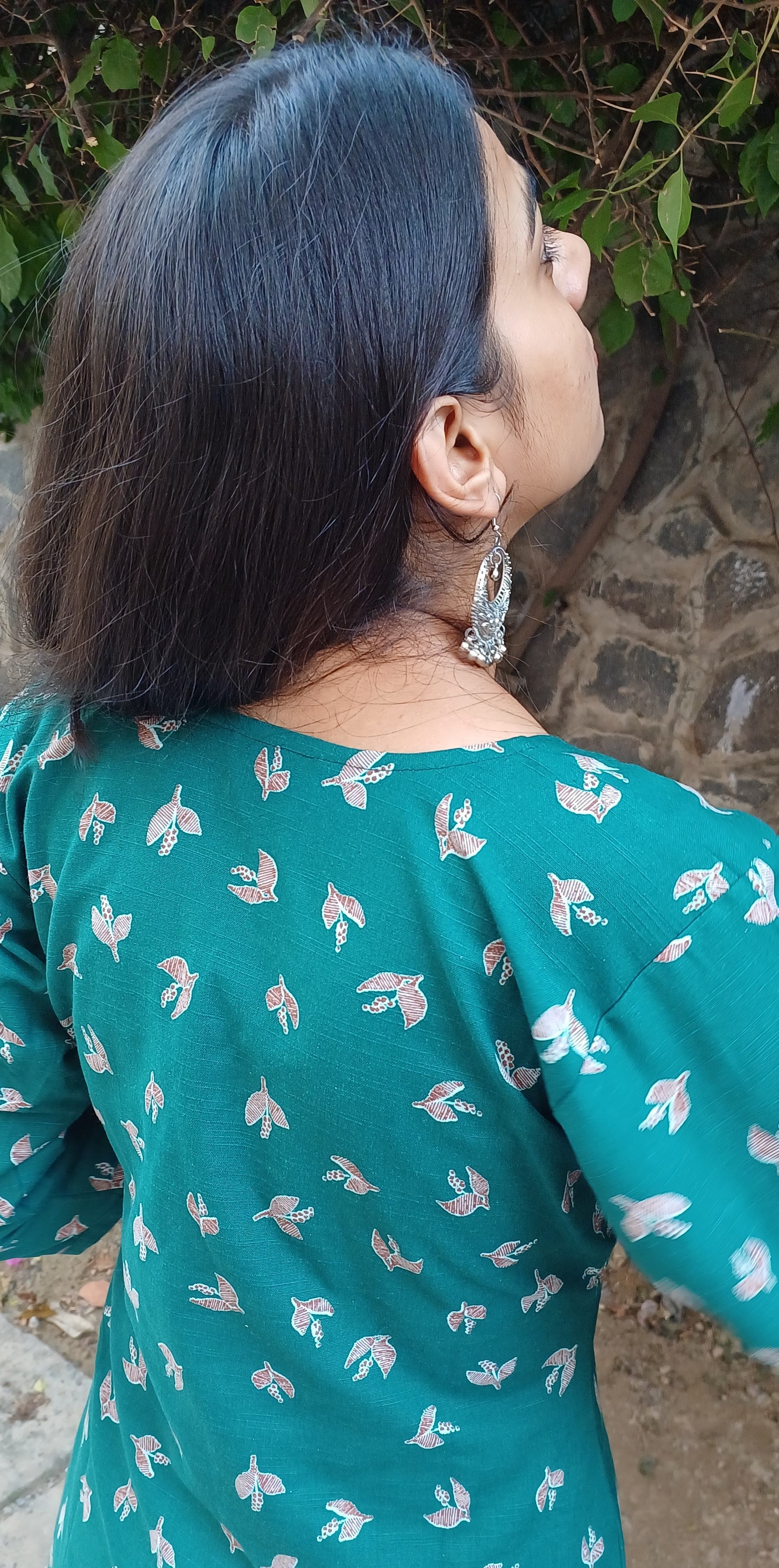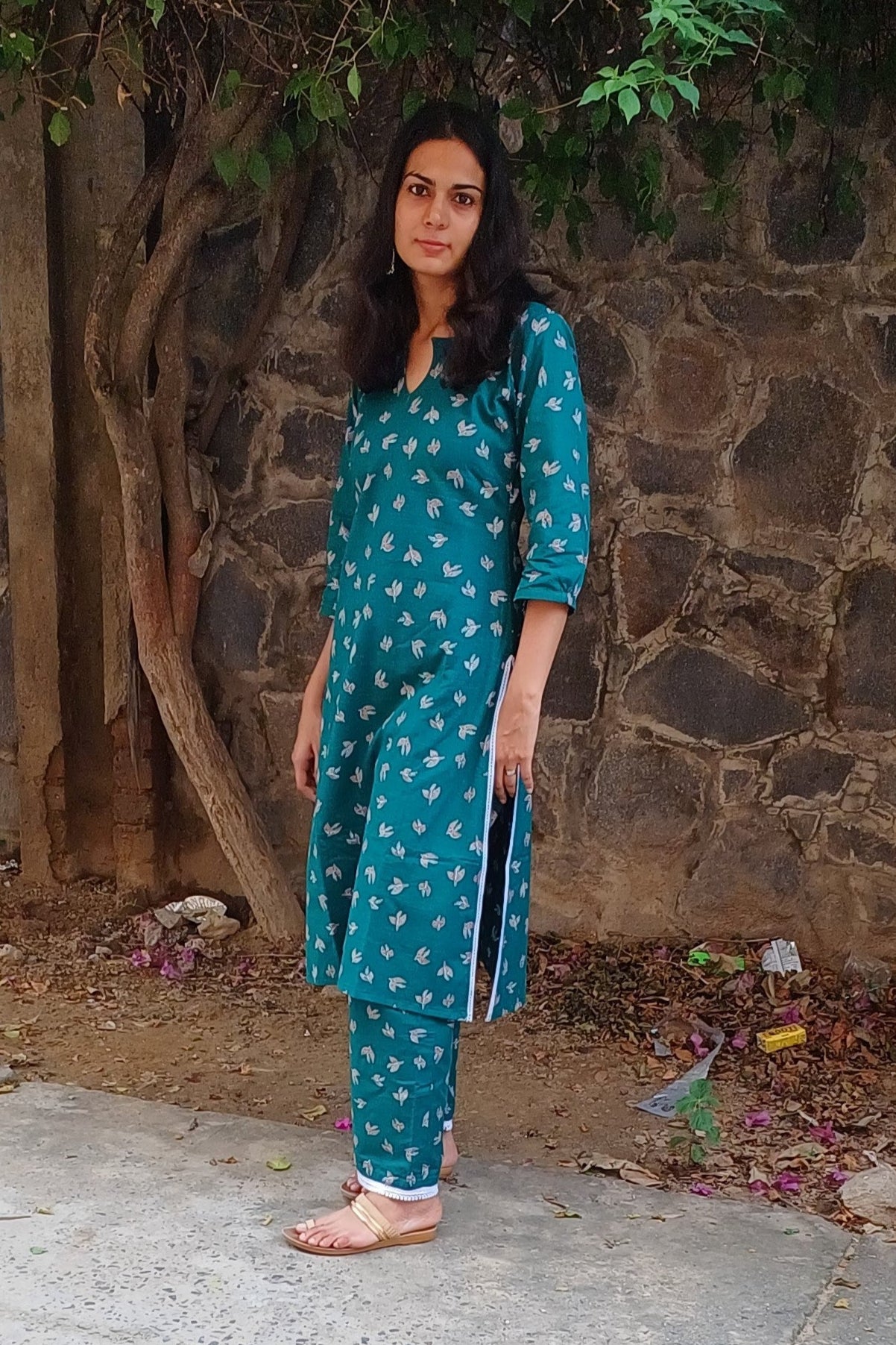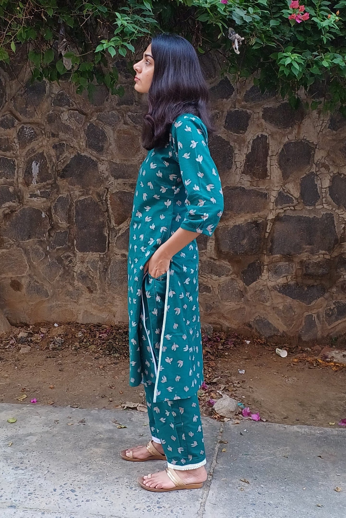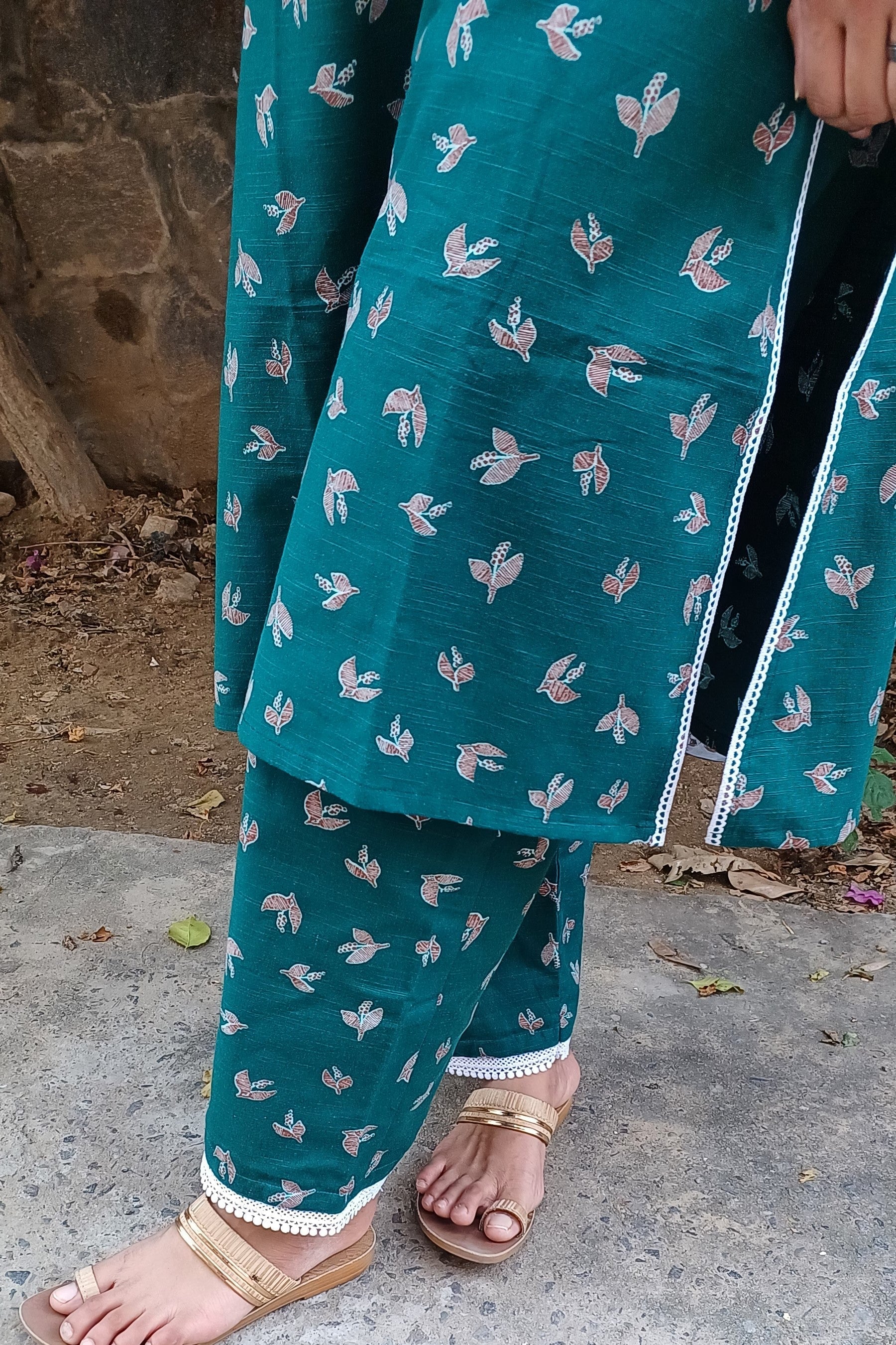 Discover the charm of the Teal Blue Bird Kurta Set, handcrafted with exquisite brown bird prints. Featuring a classic kali kurta design with convenient pockets, this set offers a perfect fusion of artistic craftsmanship and modern functionality, making it an ideal choice for a stylish, effortless look.
