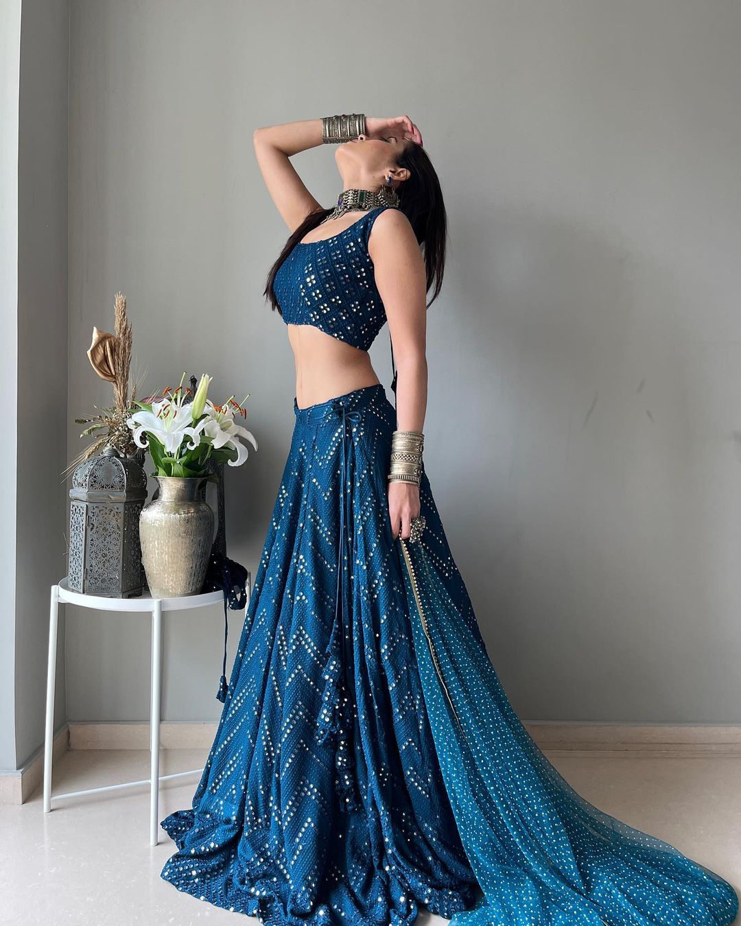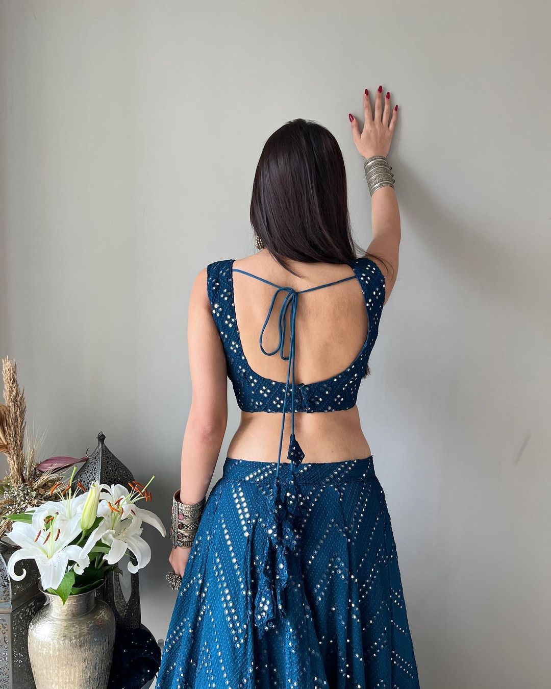 - Lehenga: Pure Georgette fabric with artificial mirror work and resham work anf the lehenga has can can