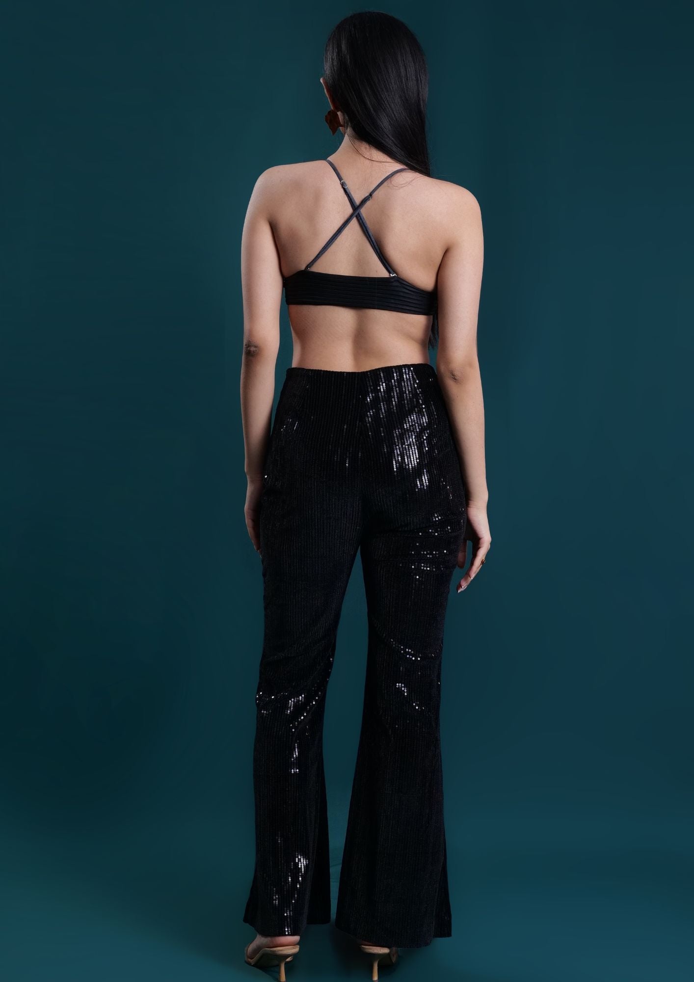 High waist bell bottoms made of a stretchable sequin corduroy. Featuring side zipper opening.