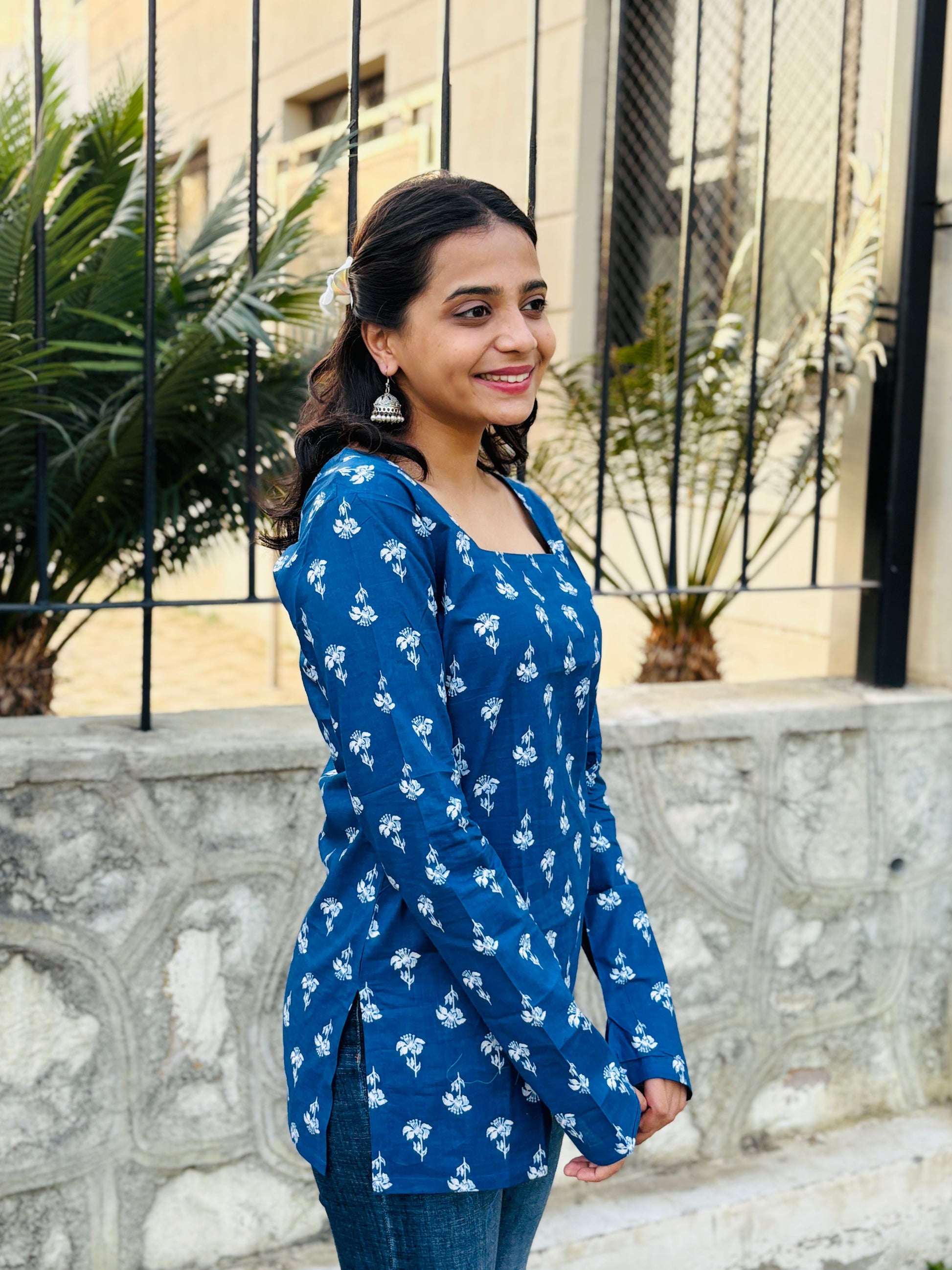 Bold, striking, this royal blue kurti with intricate white block prints is made for the ones who like to keep it classy with a touch of rebellion. The structured fit, elegant neckline, and dramatic sleeves make it the perfect mix of vintage charm and modern sass. Throw on silver jhumkas, loose waves, and a confident smile you're ready to steal the spotlight.