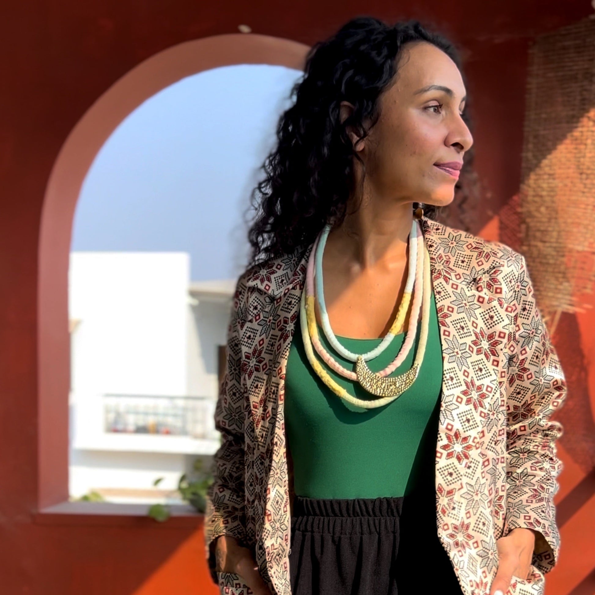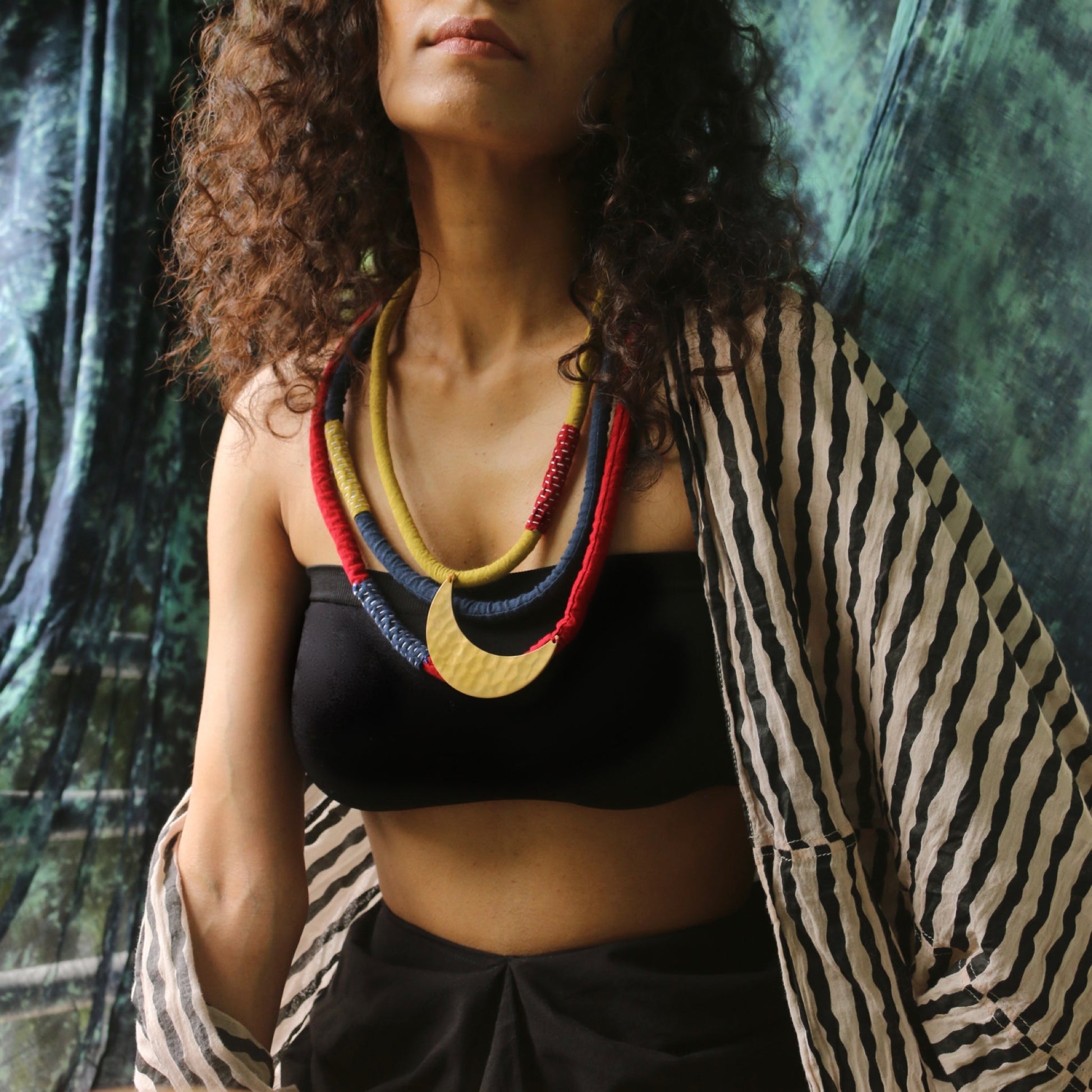This stunning three-layered textile necklace features a hand-hammered brass pendant in a crescent moon shape. With its adjustable design, it offers both elegance and versatility, making it the perfect statement piece to elevate any outfit with a touch of artisanal craftsmanship.