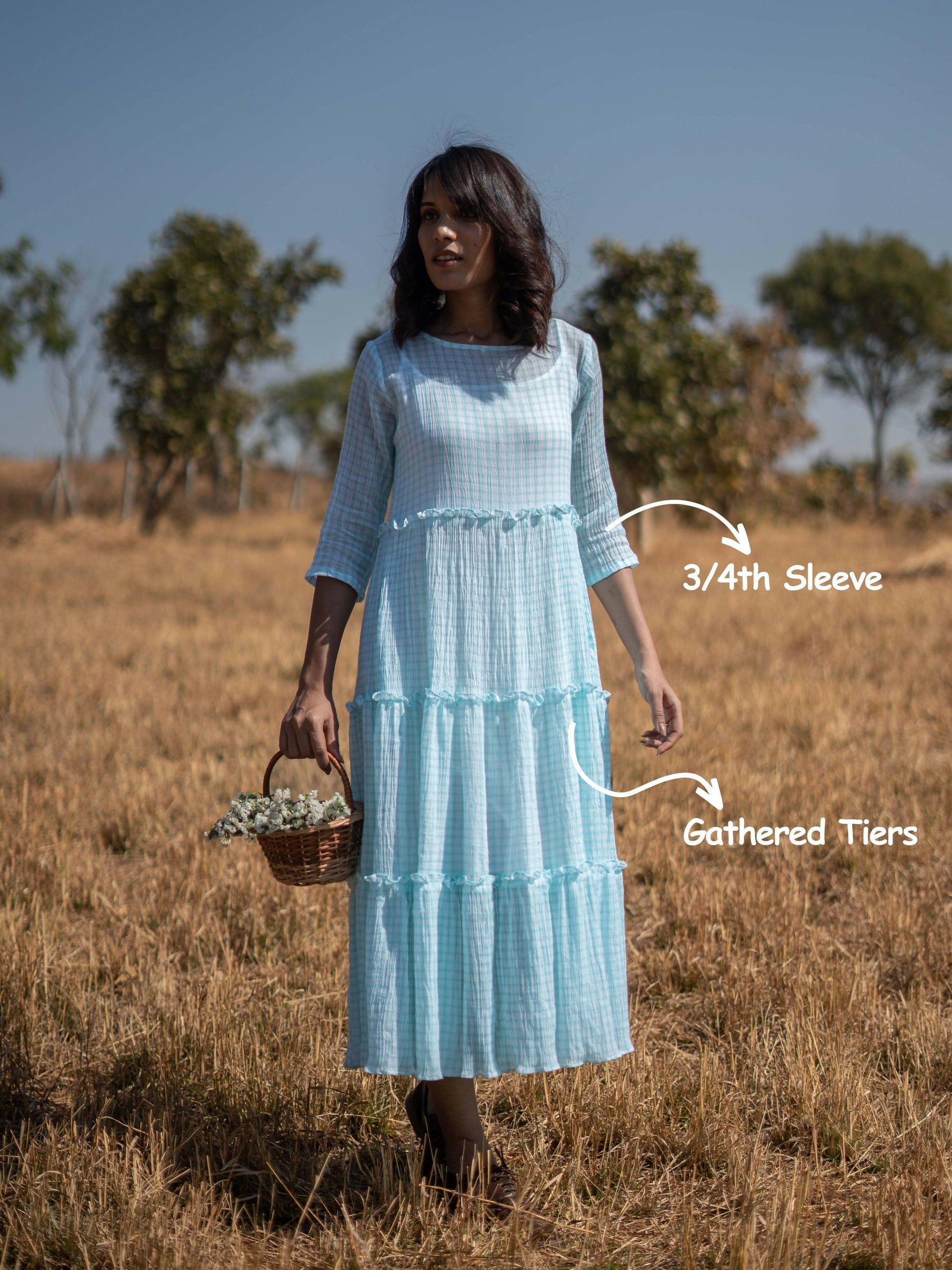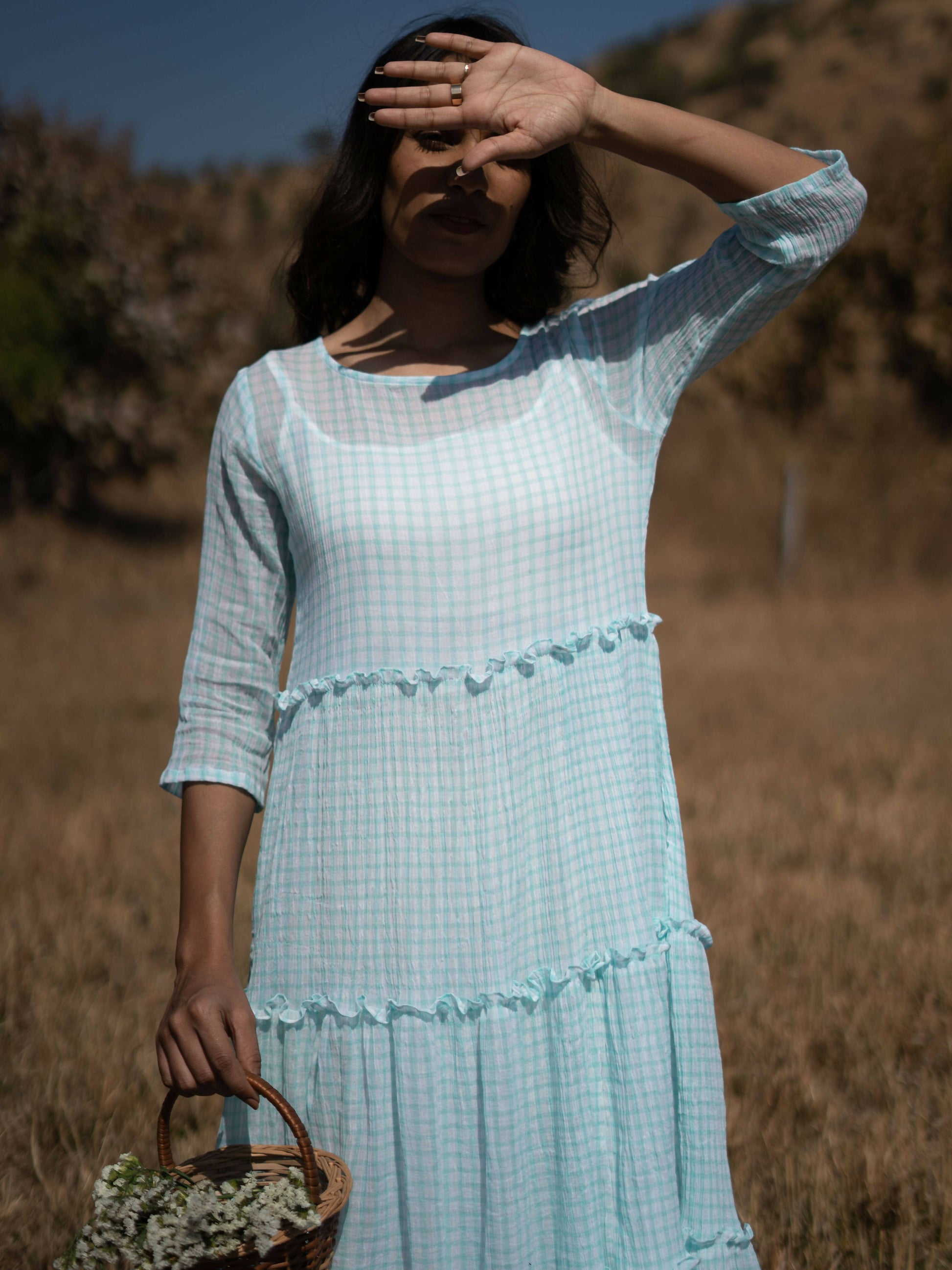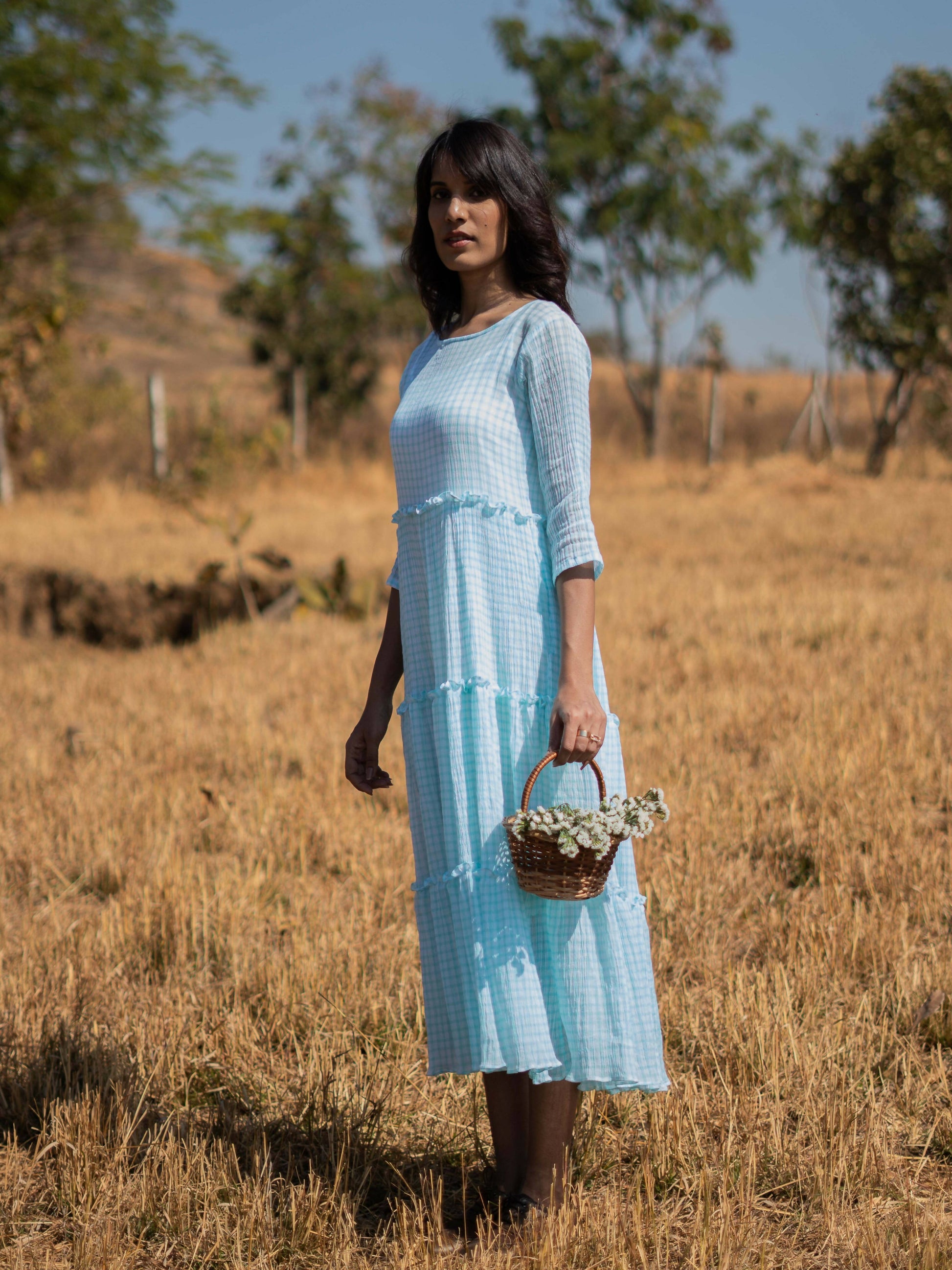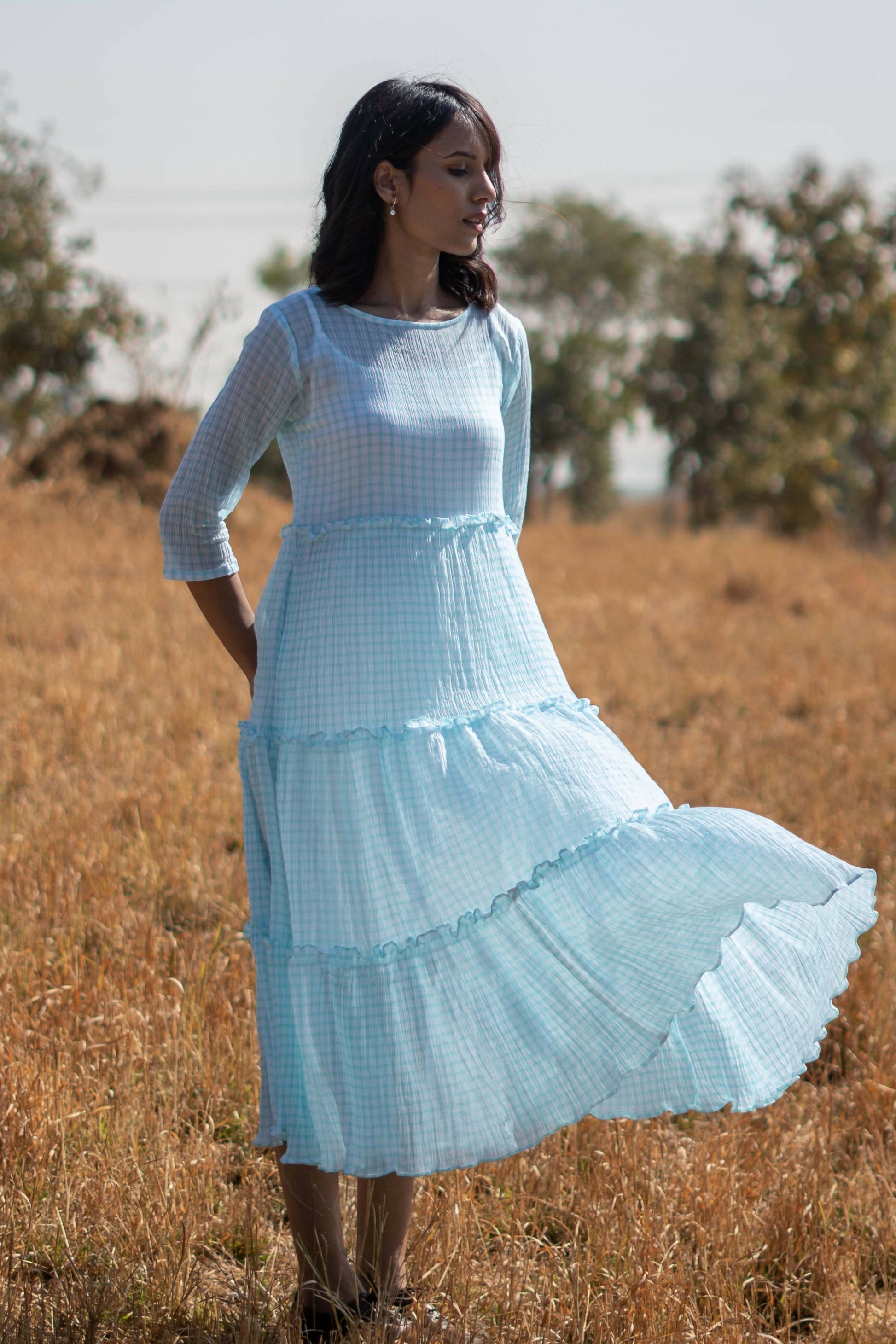 White - Blue checkered mid-calf length Tiered Dress in wrinkled fabric. The dress has inseam pockets. The Dress comes with a Slip.