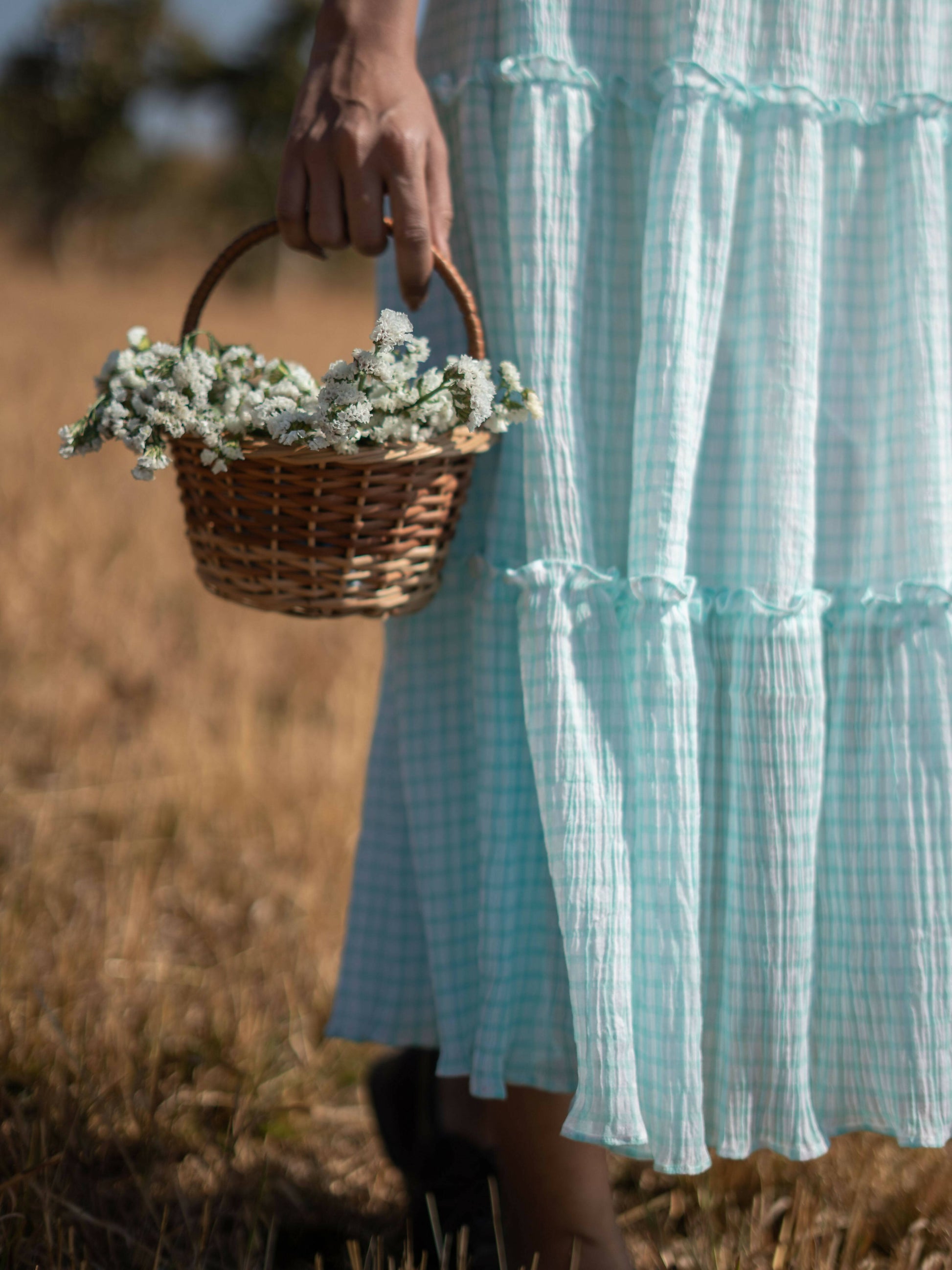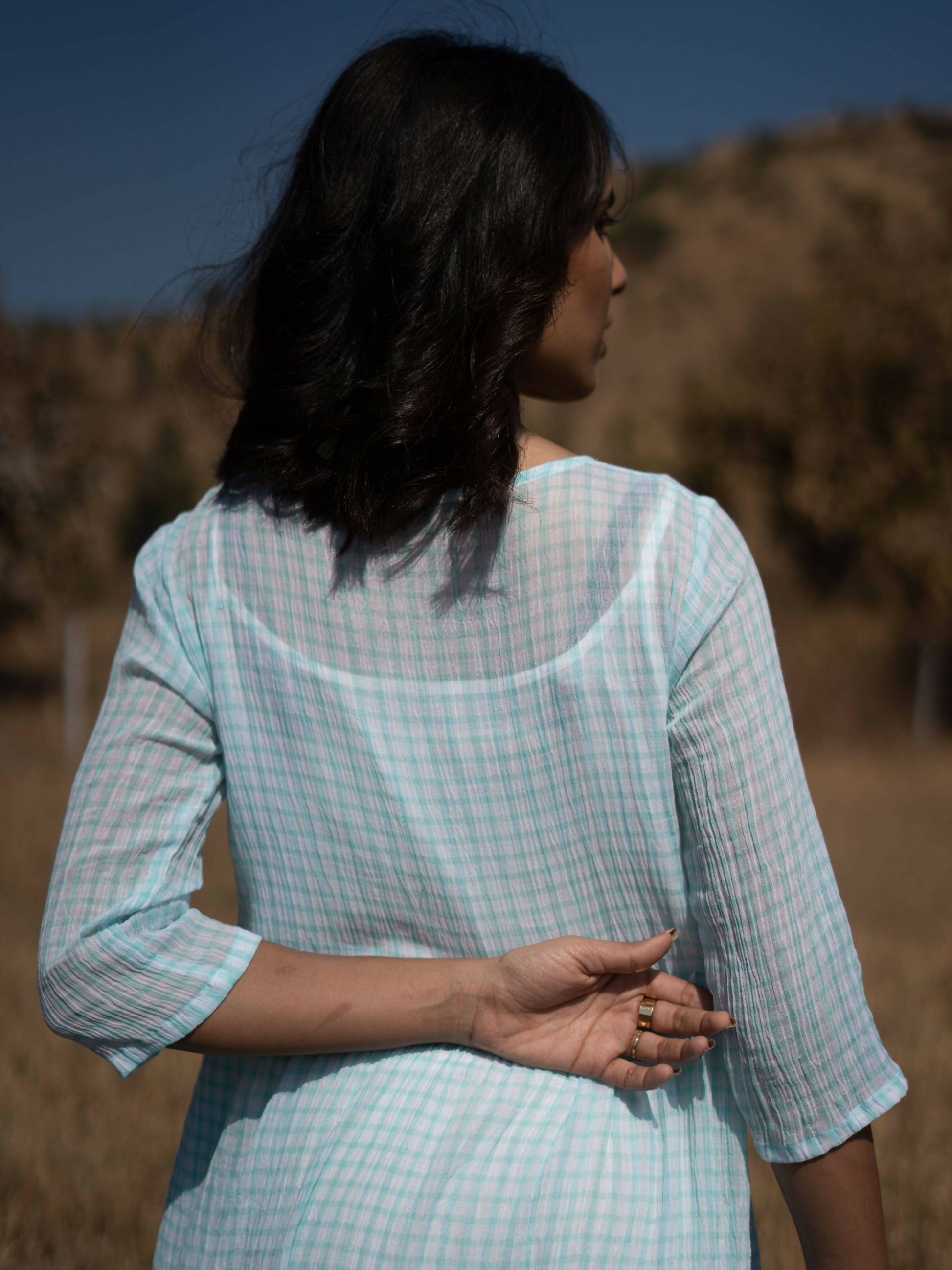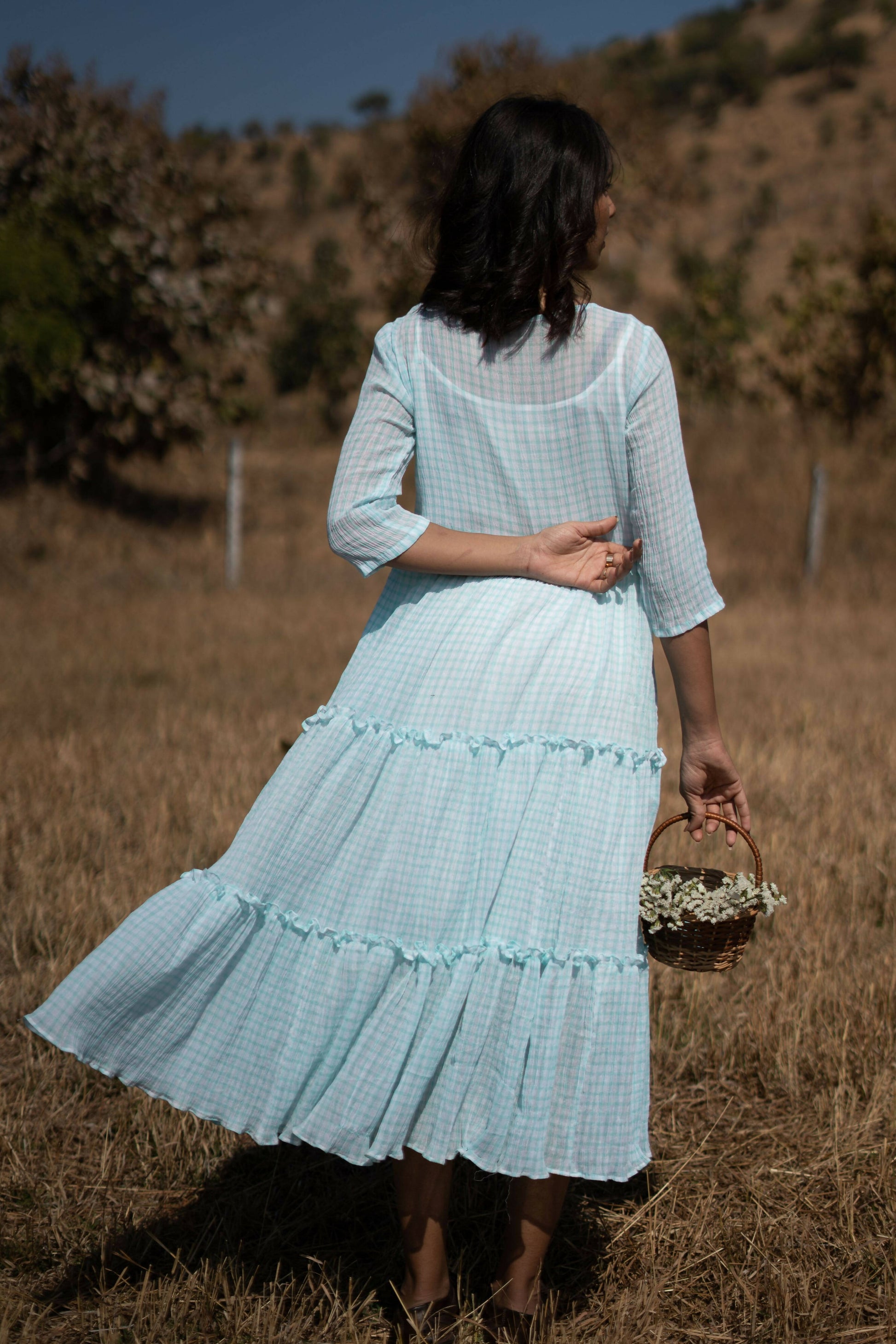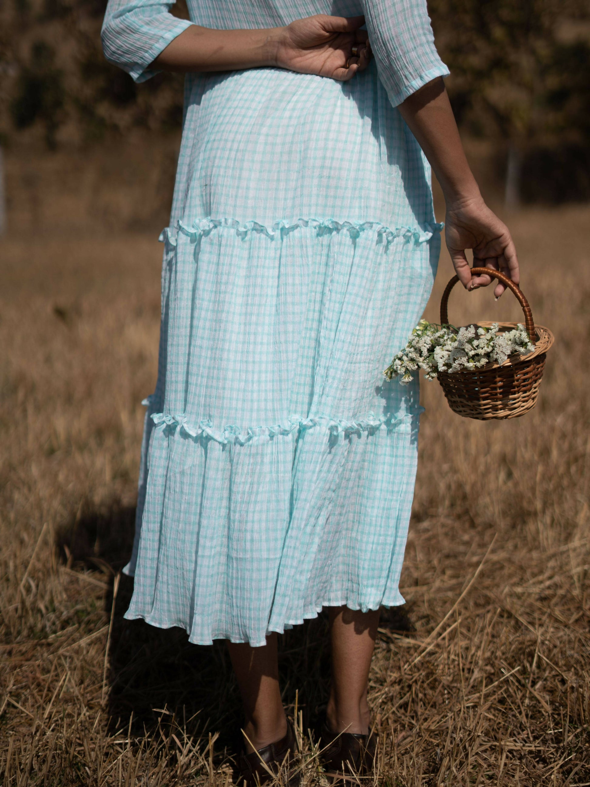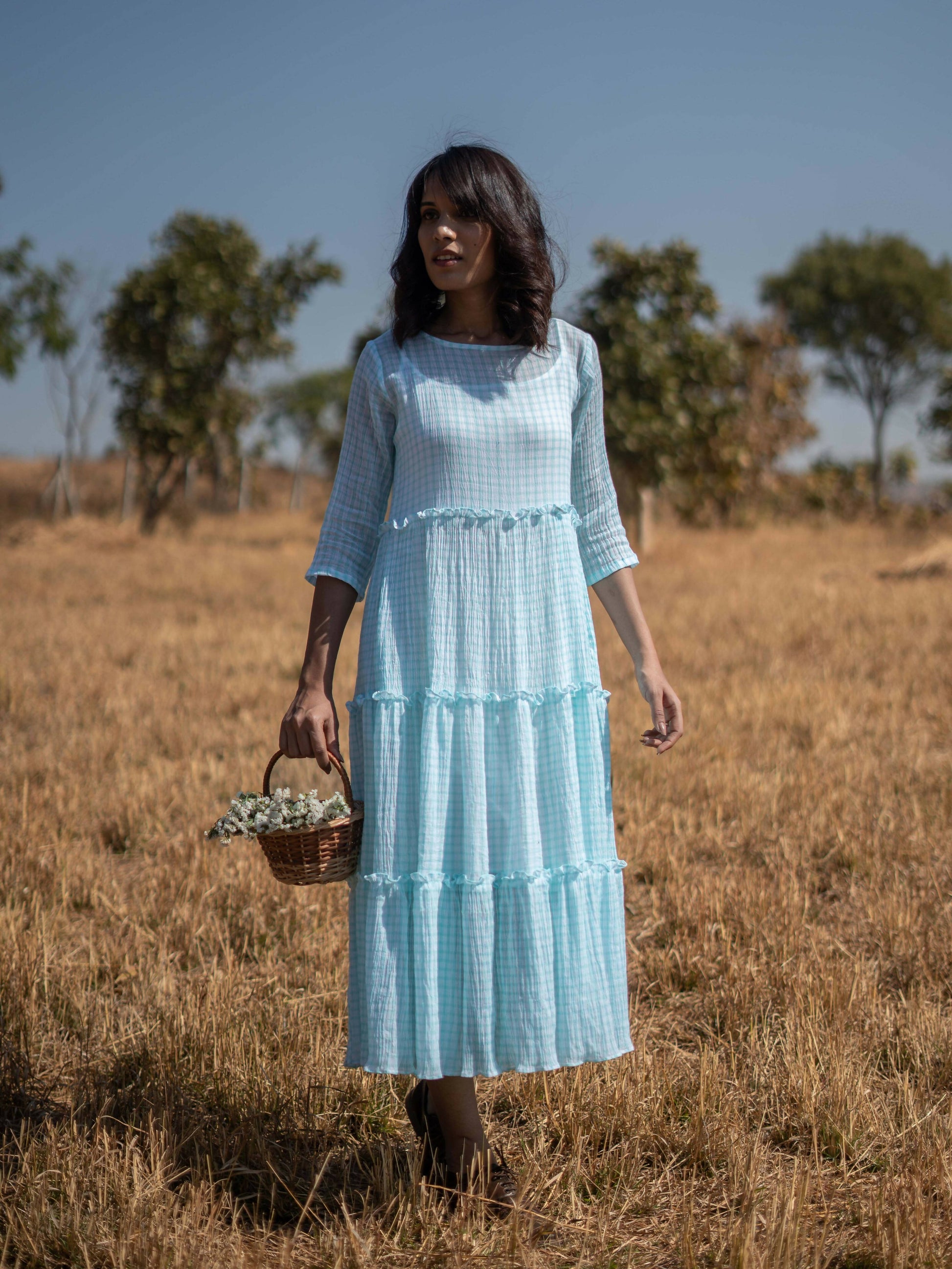 White - Blue checkered mid-calf length Tiered Dress in wrinkled fabric. The dress has inseam pockets. The Dress comes with a Slip.