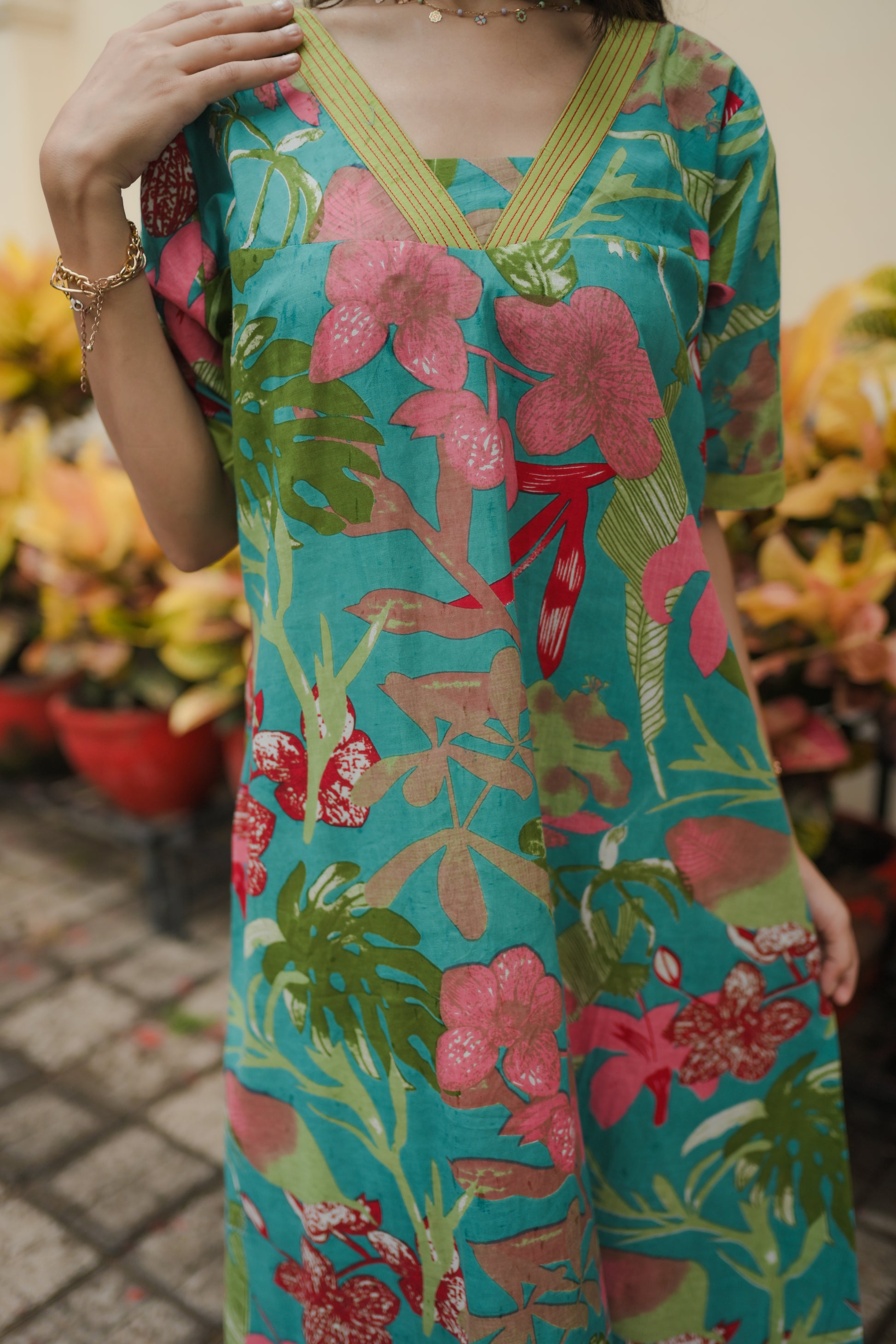Wake up in color with the Tropical Daydream Night Dress—featuring a splashy turquoise base, vibrant tropical florals, and a relaxed A-line silhouette in breathable cotton. With pockets, contrast detailing, and breezy coverage, it’s your go-to for laid-back luxury.