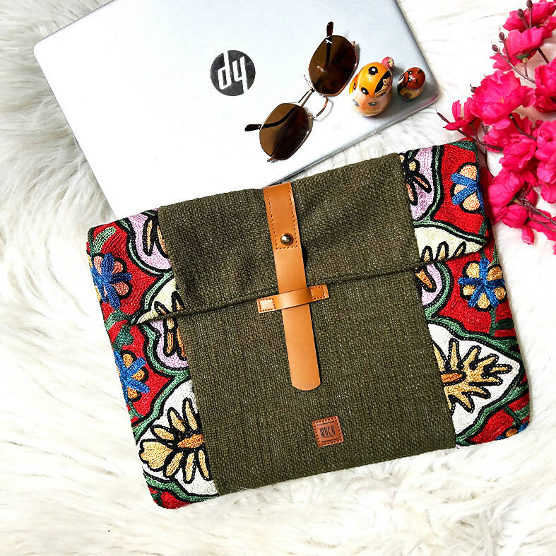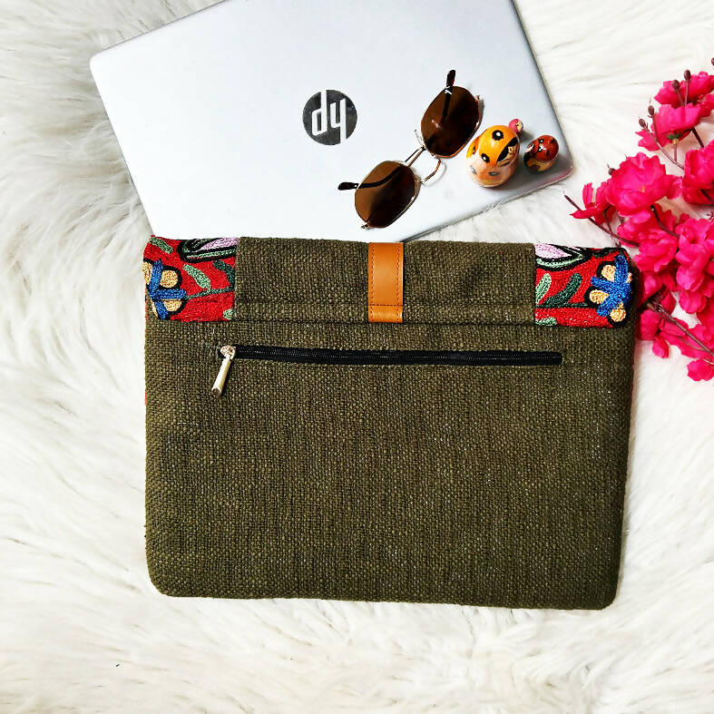 This hand embroidered tulip laptop sleeve, carefully crafted sleek exterior to compliment your work attire. It has one main padded compartment that can fit up to 14 inches laptop. It also has a back easy zipper pocket to keep your essentials. It has a flap closure.