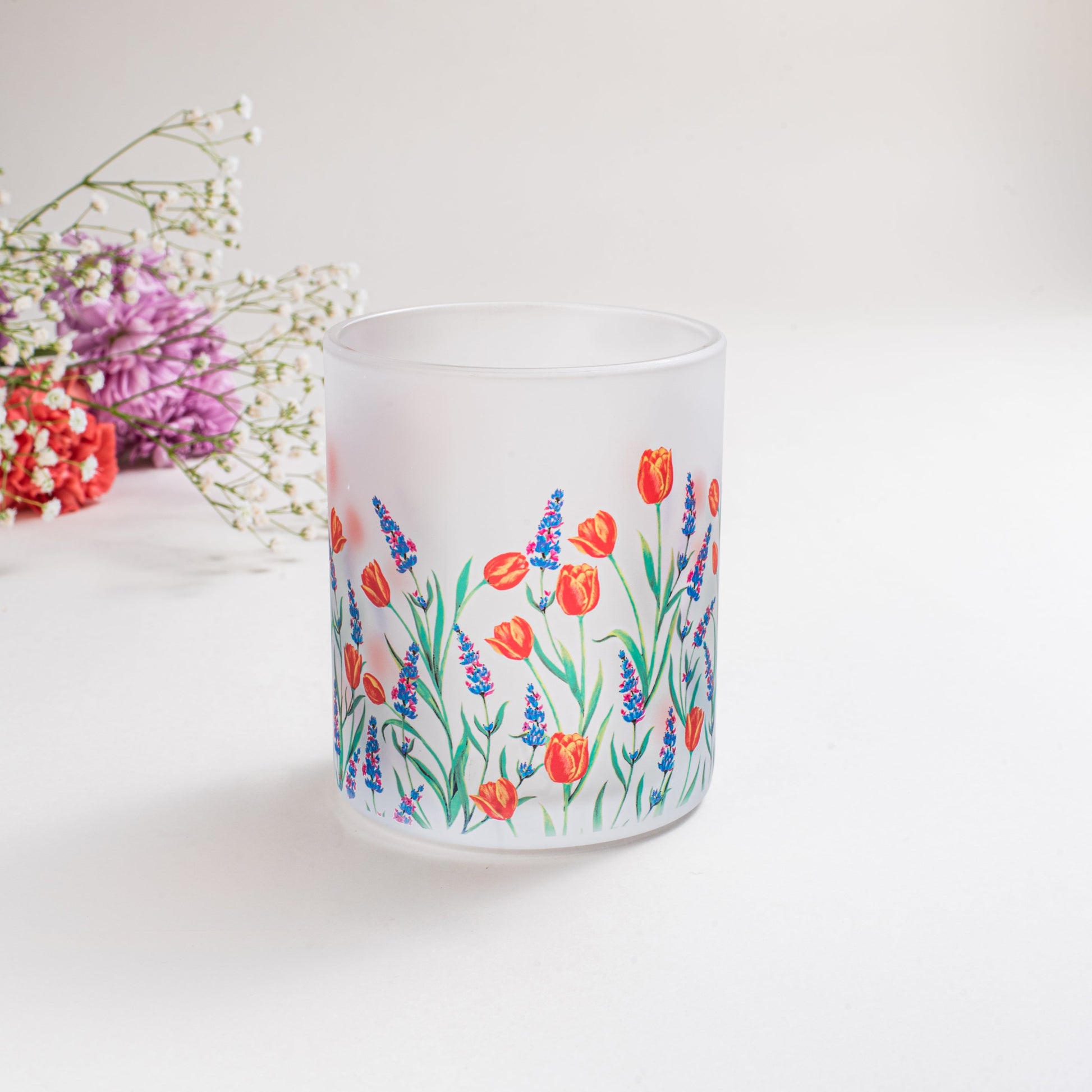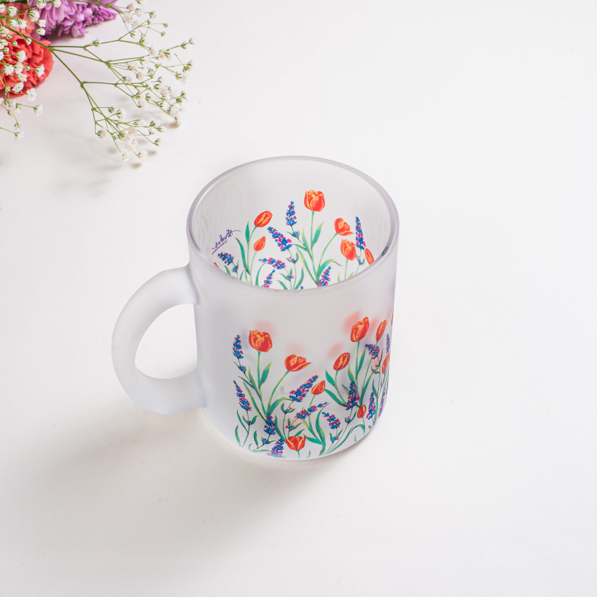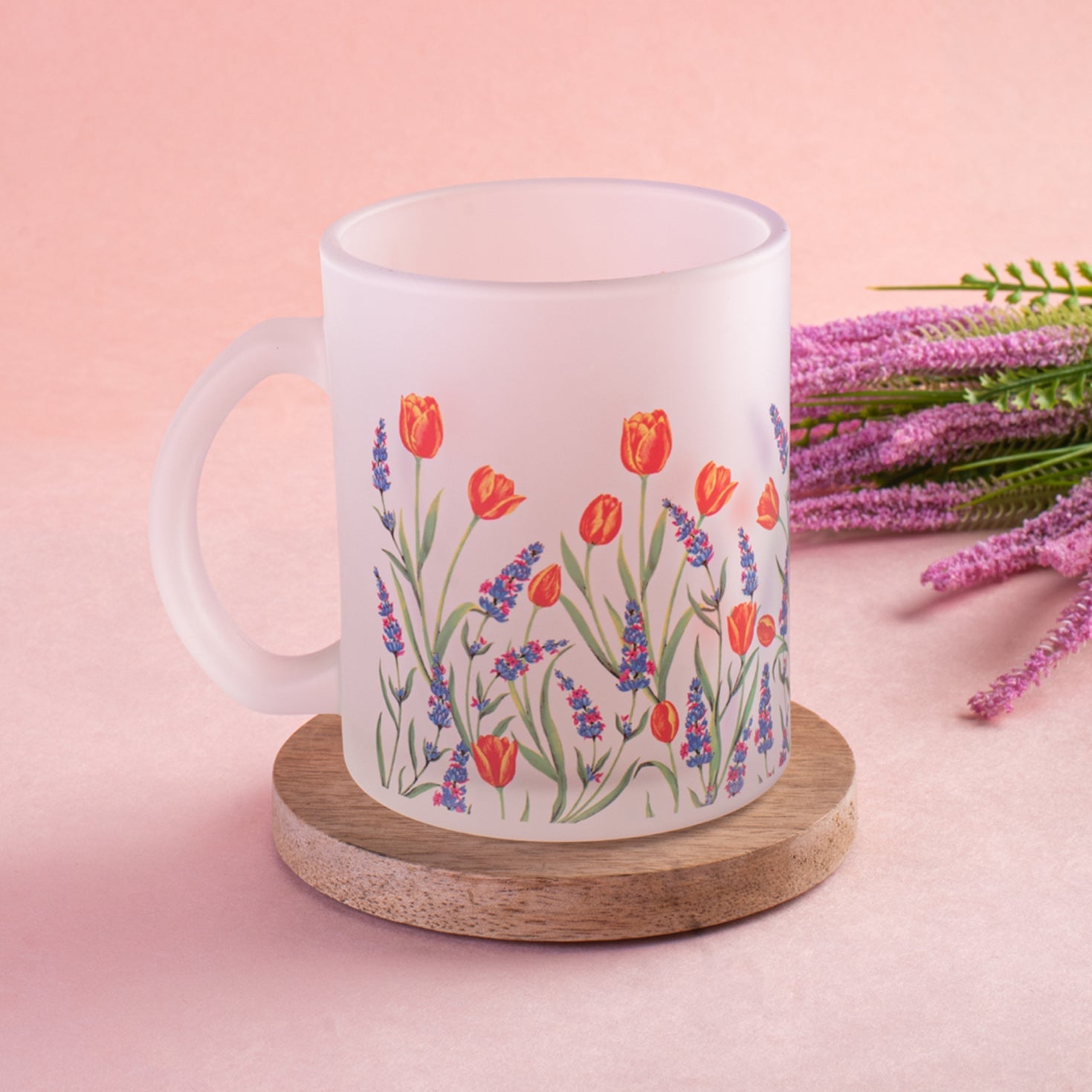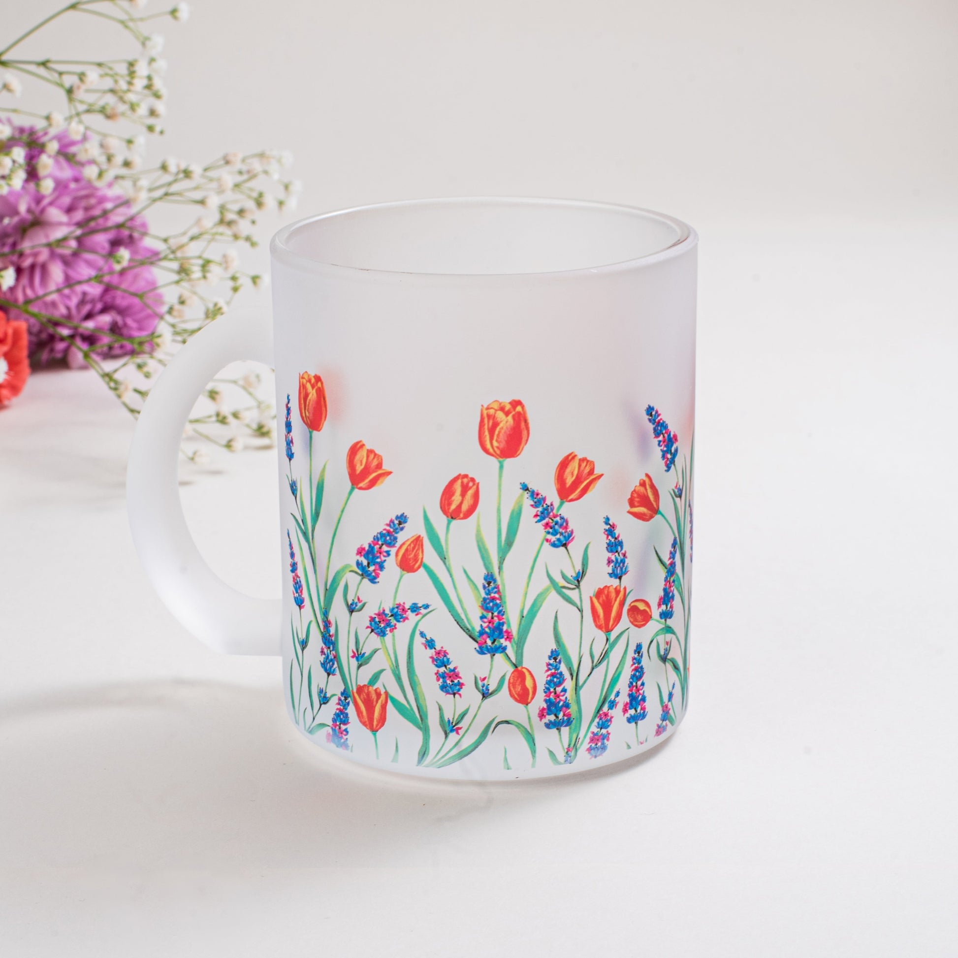The Tulips and Lavender Frosted Glass Mug is one of our newest designs with refreshing tulip and lavender illustrations. This unique coffee mug can make a wonderful gift for your loved ones or a beautiful addition to your own collection.