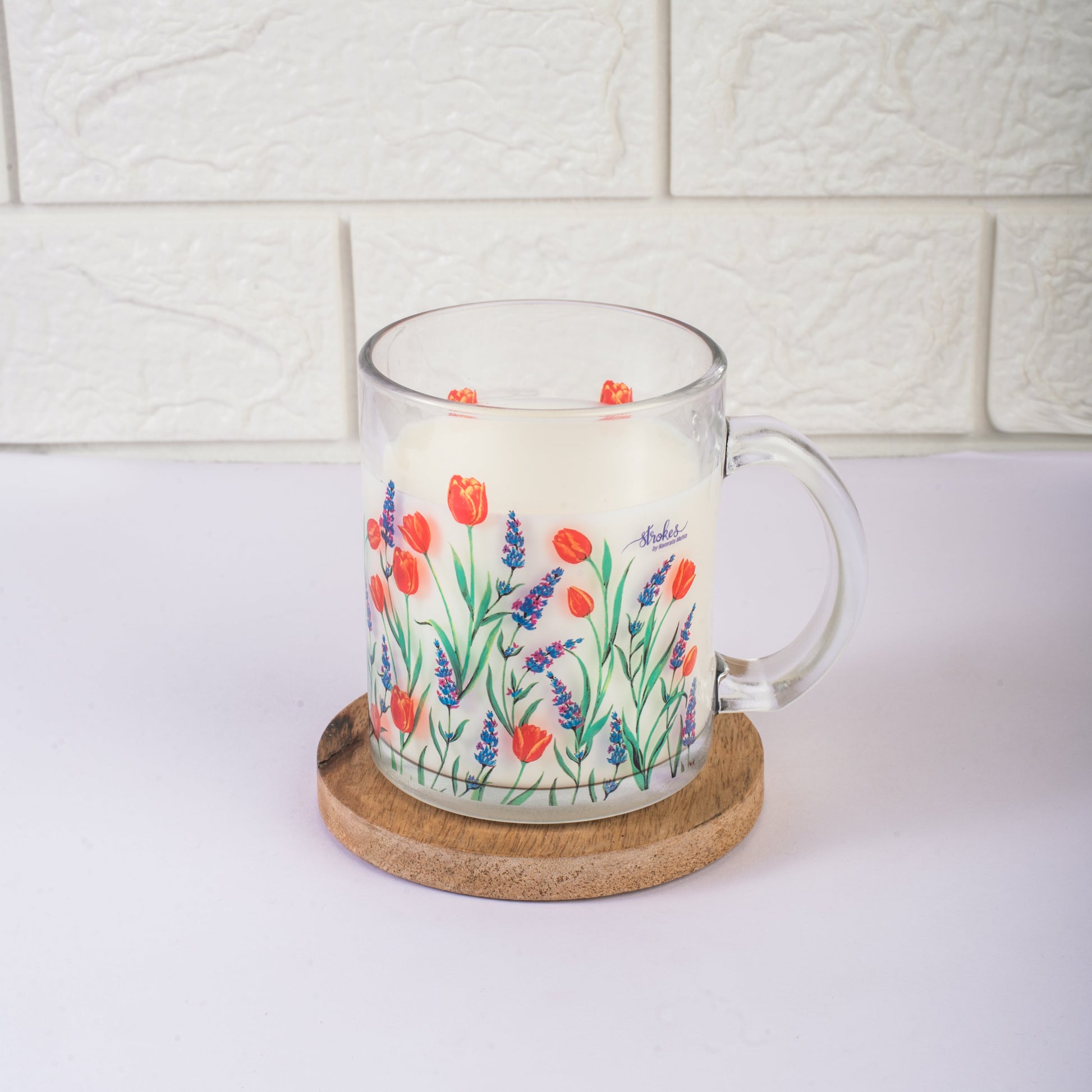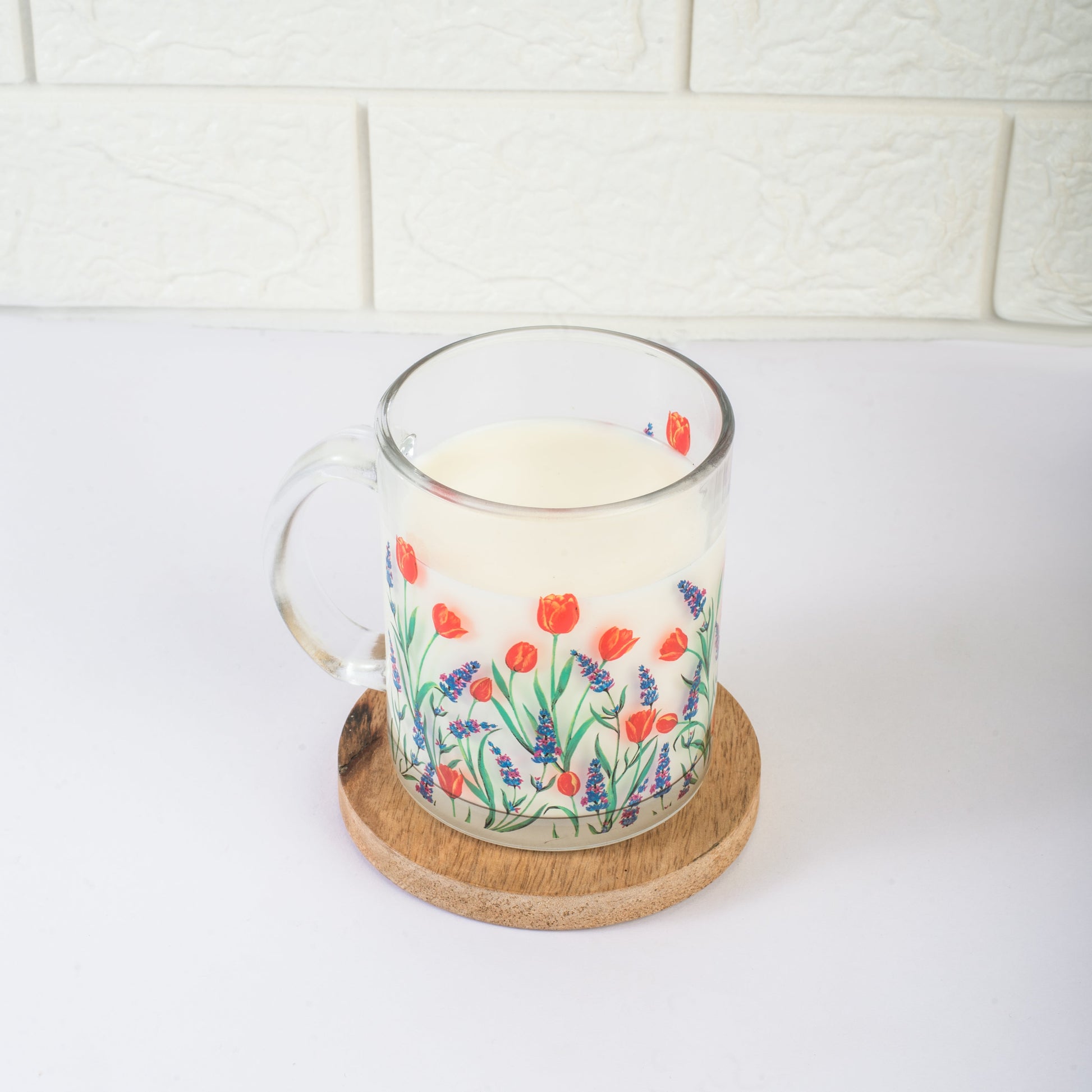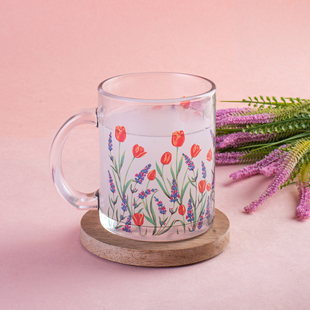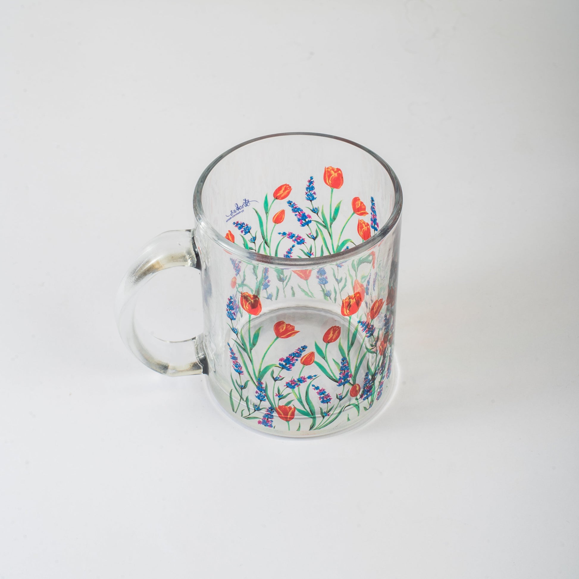 The Tulips and Lavender Frosted Glass Mug is one of our newest designs with refreshing tulip and lavender illustrations. This unique coffee mug can make a wonderful gift for your loved ones or a beautiful addition to your own collection.
