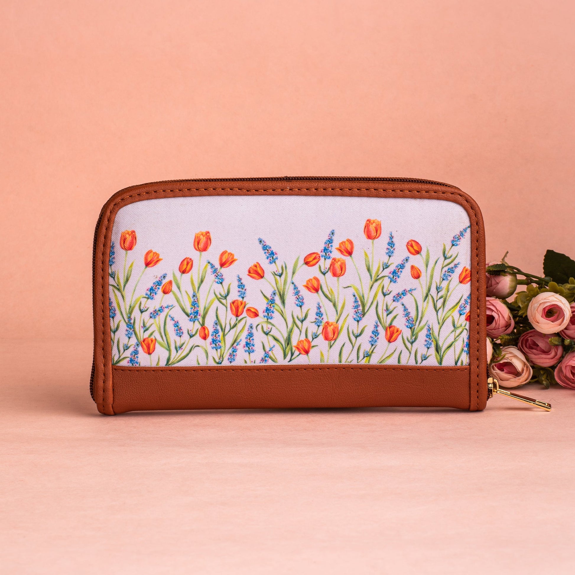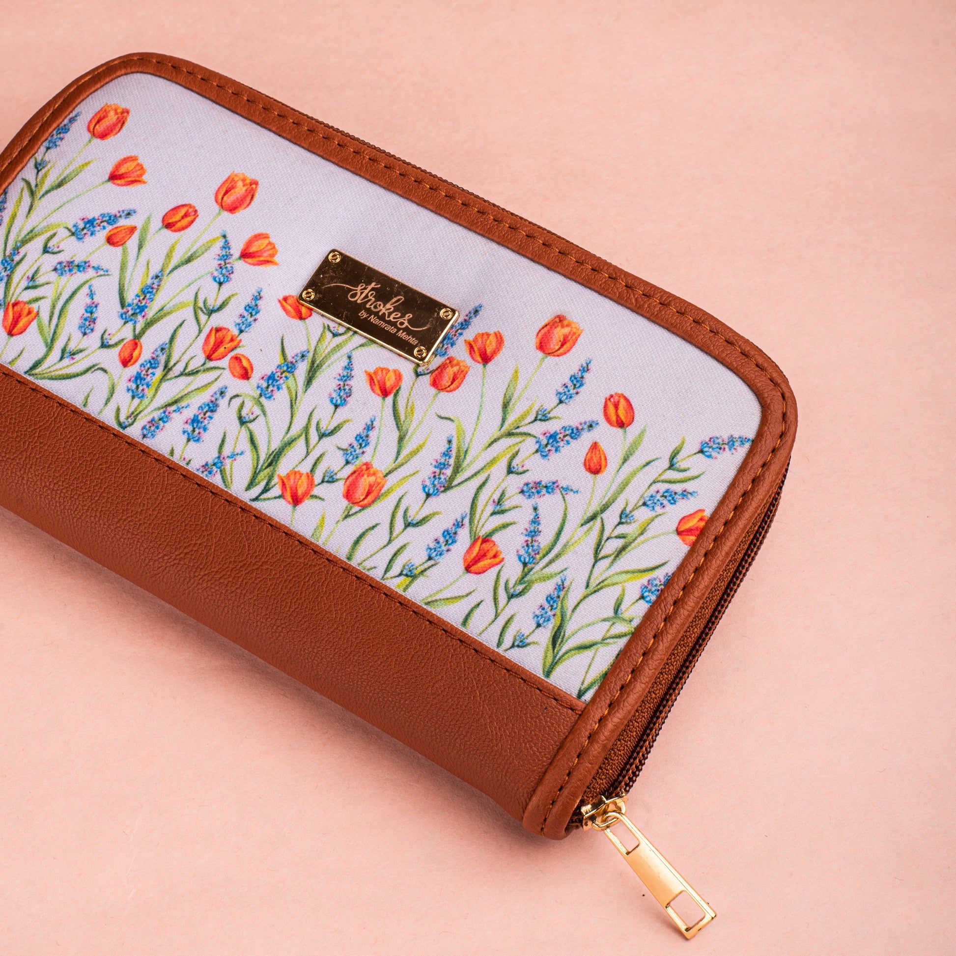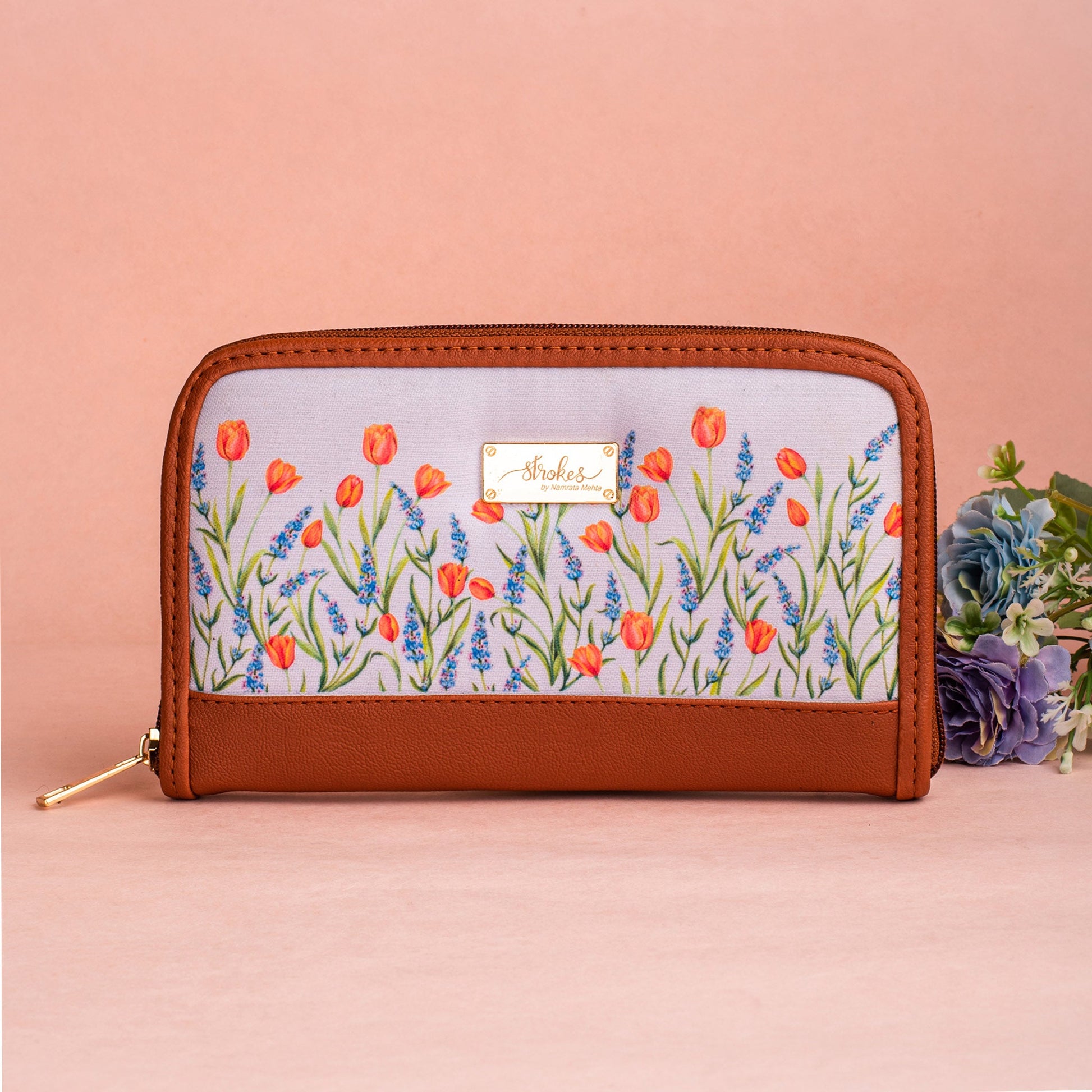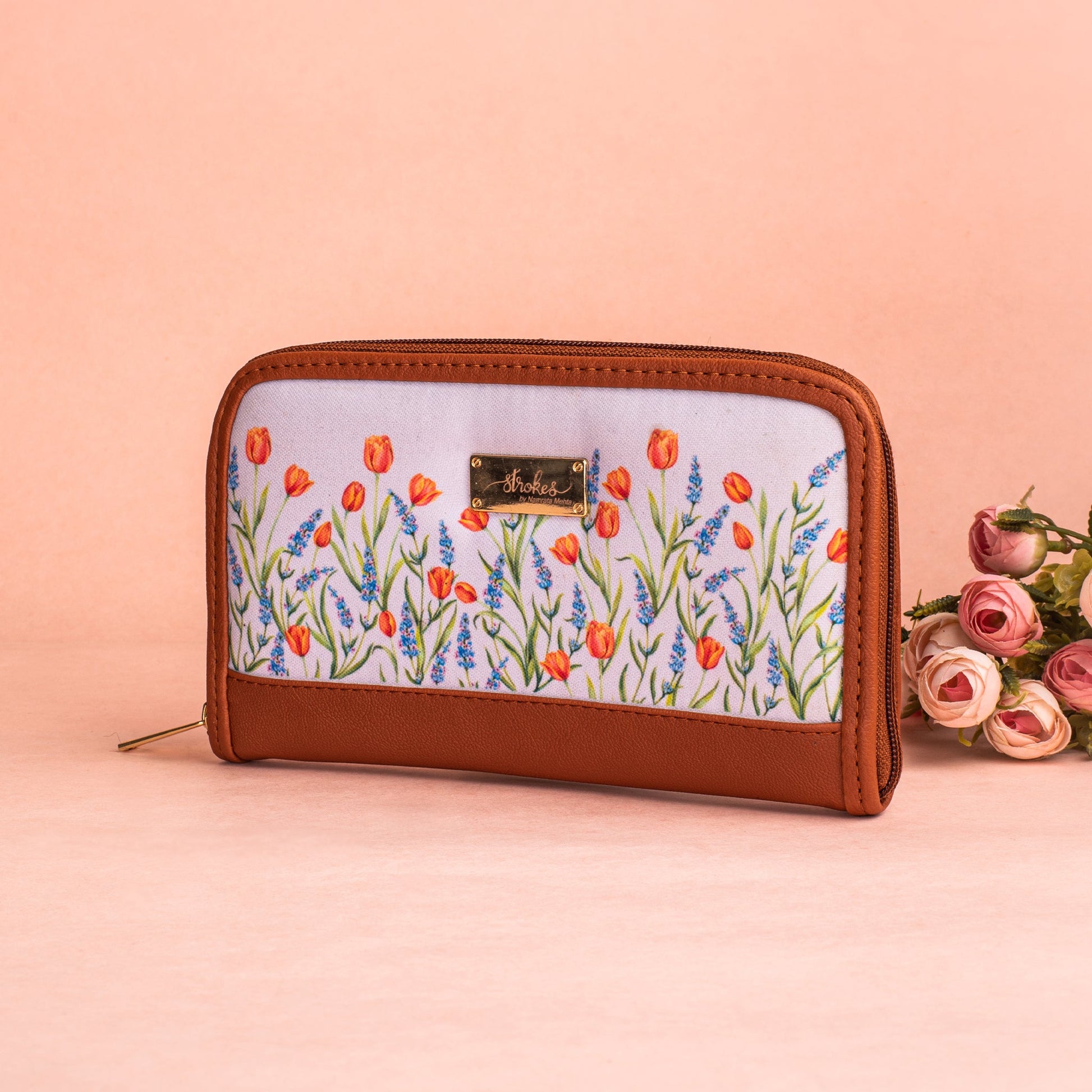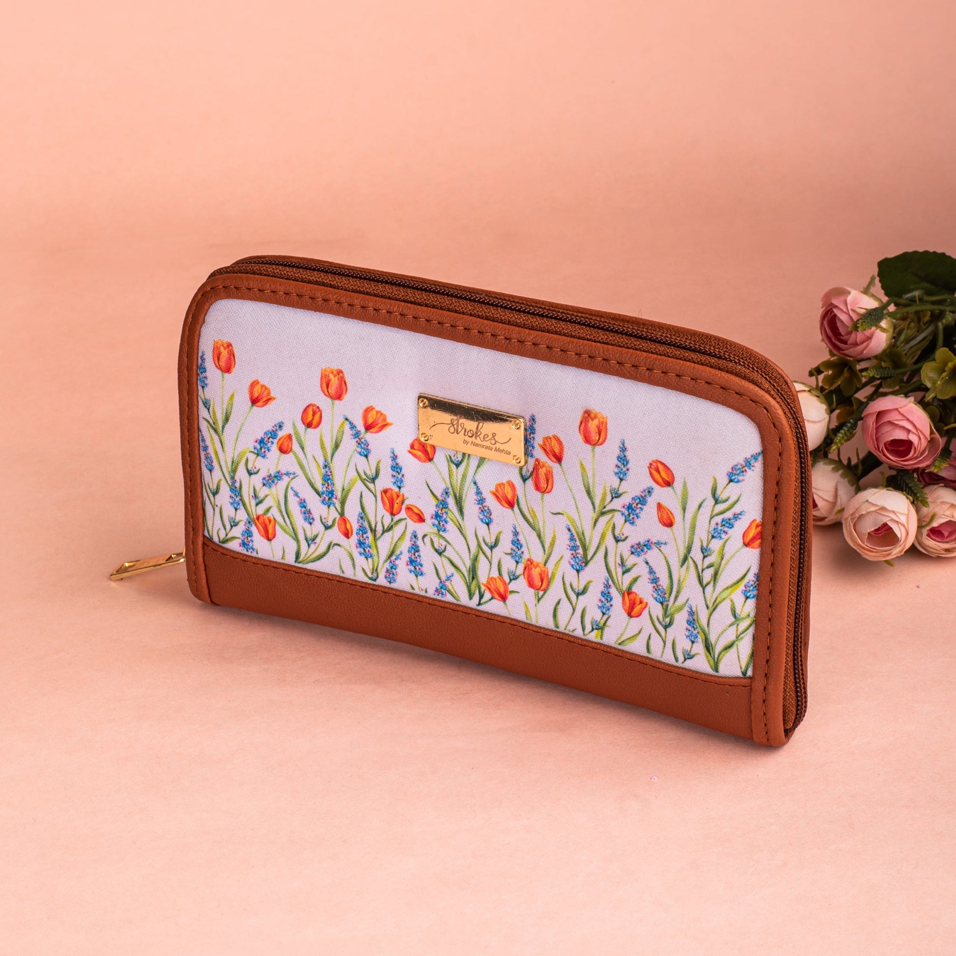An alluring illustration of the stunning tulip and lavender flowers on a lavender cotton canvas, this wallet is spacious, convenient and most importantly, gorgeous. It also makes a perfect gift for your loved ones.