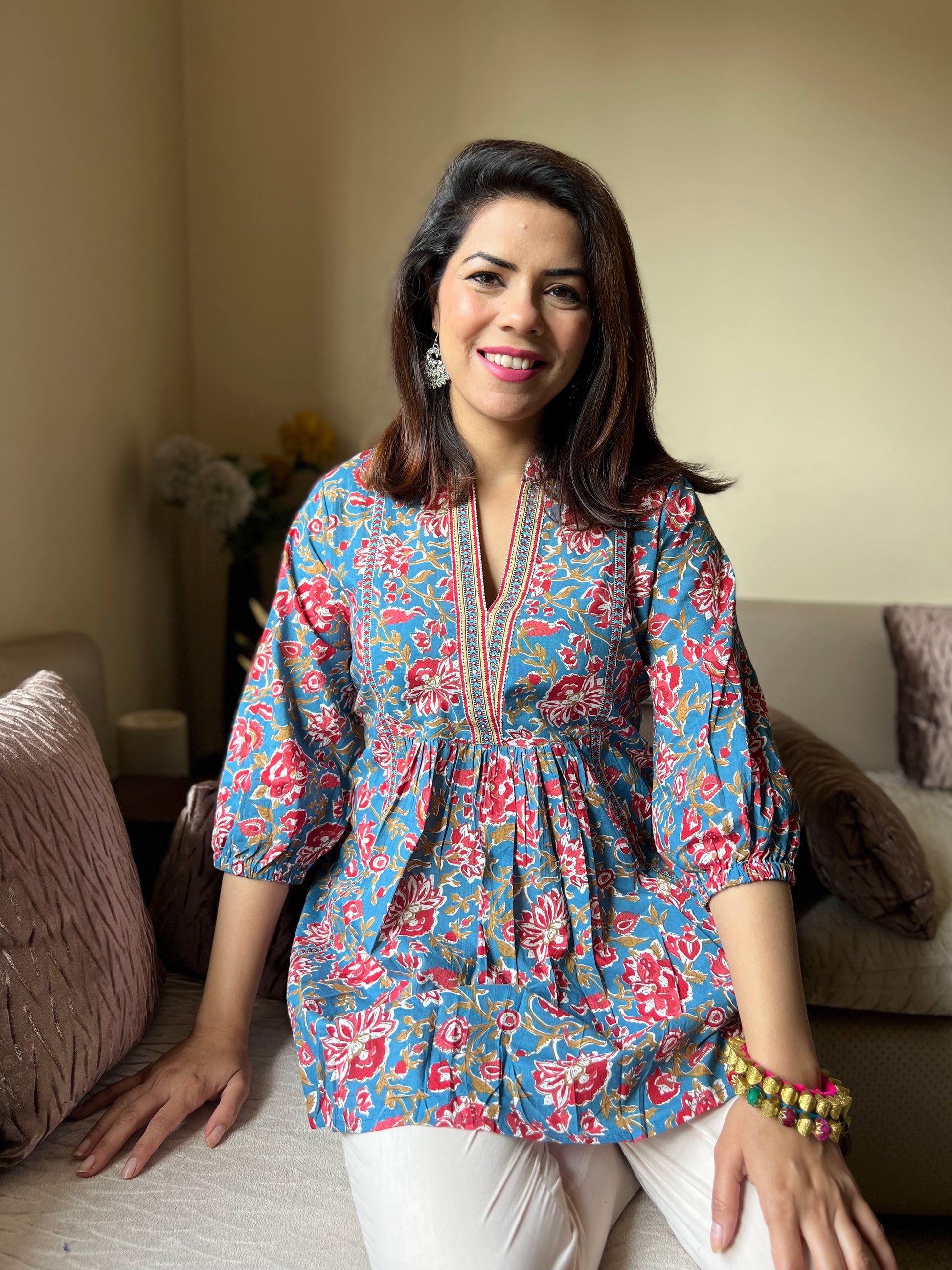 Turquoise Floral Print Pure Cotton Cinched Waist Top