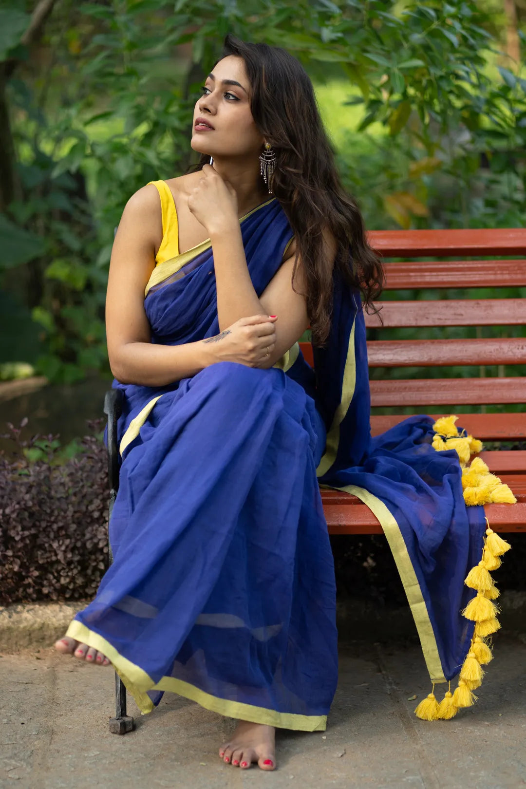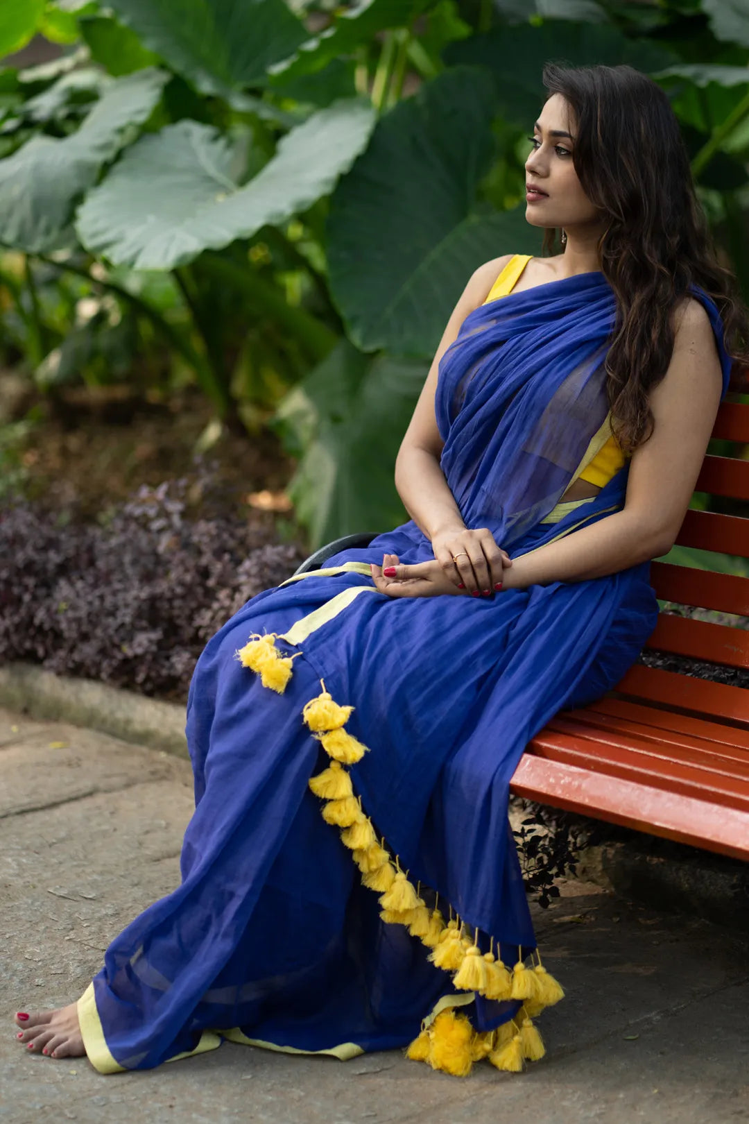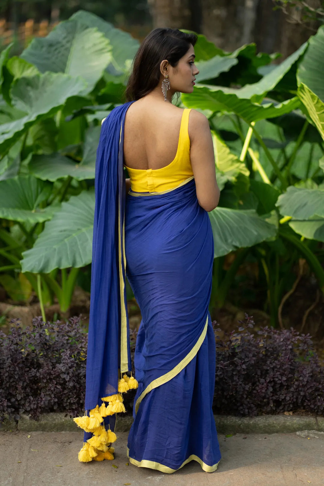 Before creating this saree, we never knew the fusion of blue and yellow would make such a masterpiece! Explore your experimental side with a saree that's accentuated with oversized yellow tassels and a contrasting border. Unleash your bold self and have some fun with this blue and yellow showstopper!