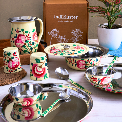 Elevate your dining with our Hand-Painted Thali and Bowls Set – a duo of artistry and functionality. Crafted by skilled artisans, each piece is a vibrant canvas of tradition and culture. The durable, glossy finish enhances both aesthetics and easy maintenance. Versatile and eco-friendly, the set is perfect for daily meals or special occasions.