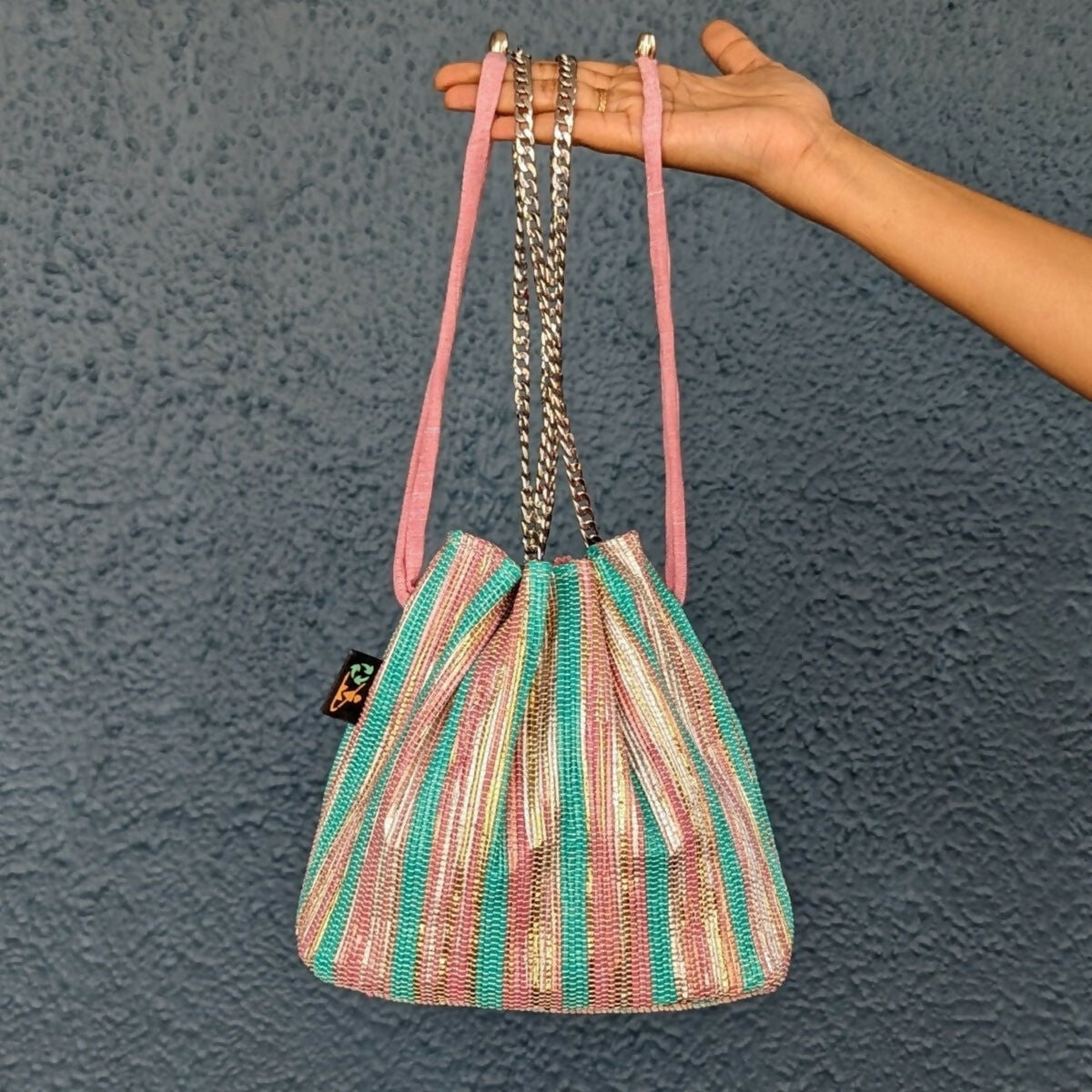 Girija's Potli Sling is yet another addition to our Potli collection, but with a modern twist. Although it's drawstring closure and pattern remain the same, we gave this one an elliptical shape from the base. What makes this one a sling is a shiny metal sling chain thus making it extremely easy to carry.