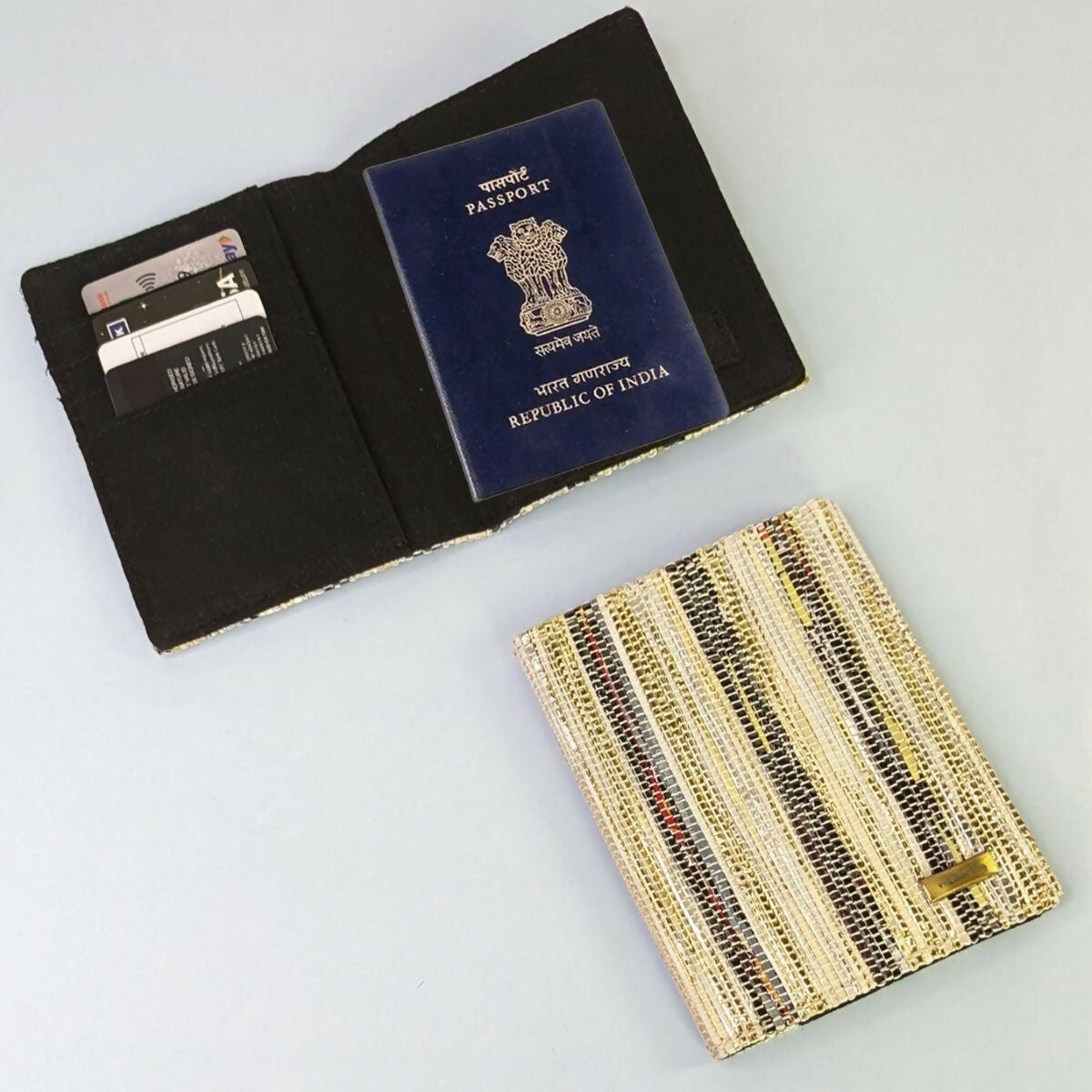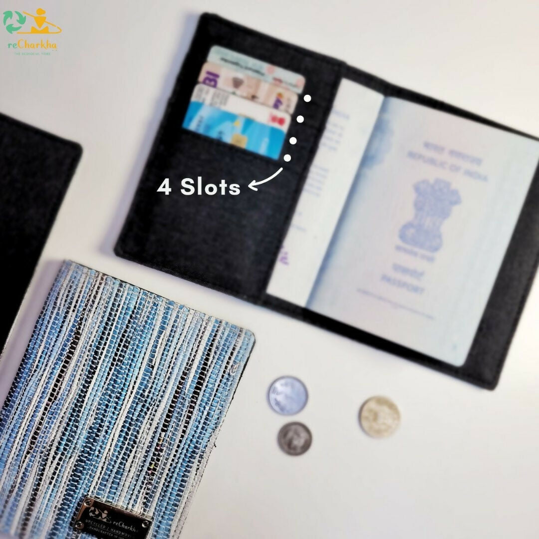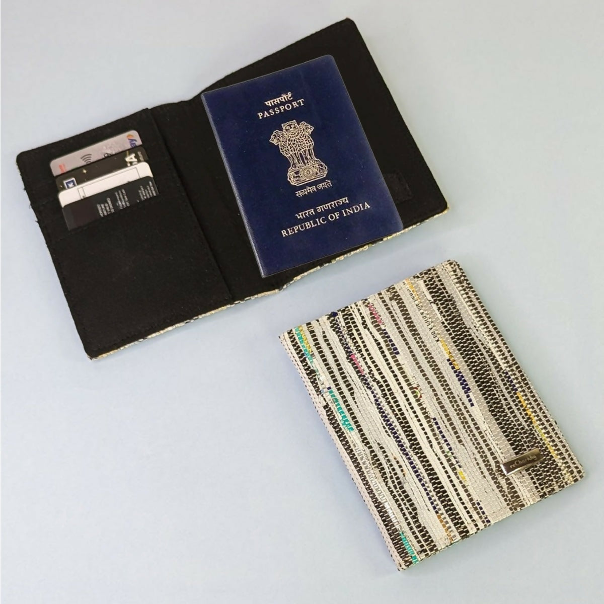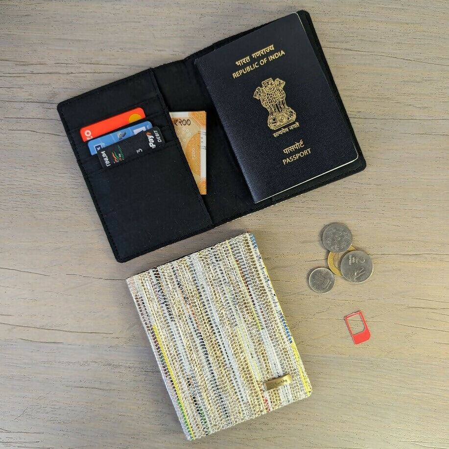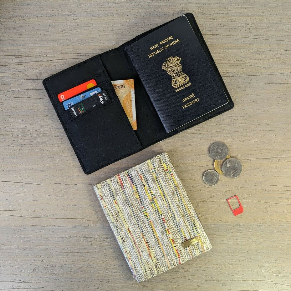reCharkha's eye catching UPCYCLED HANDWOVEN Passport cover is a fun and handy accessory to secure your passport and store your important cards.