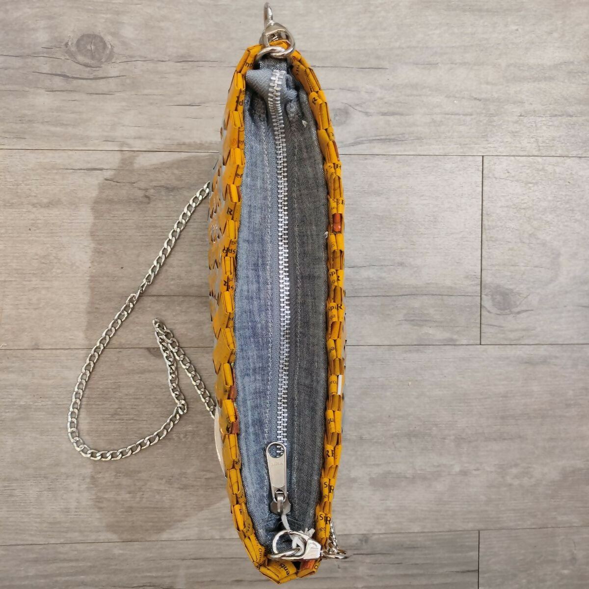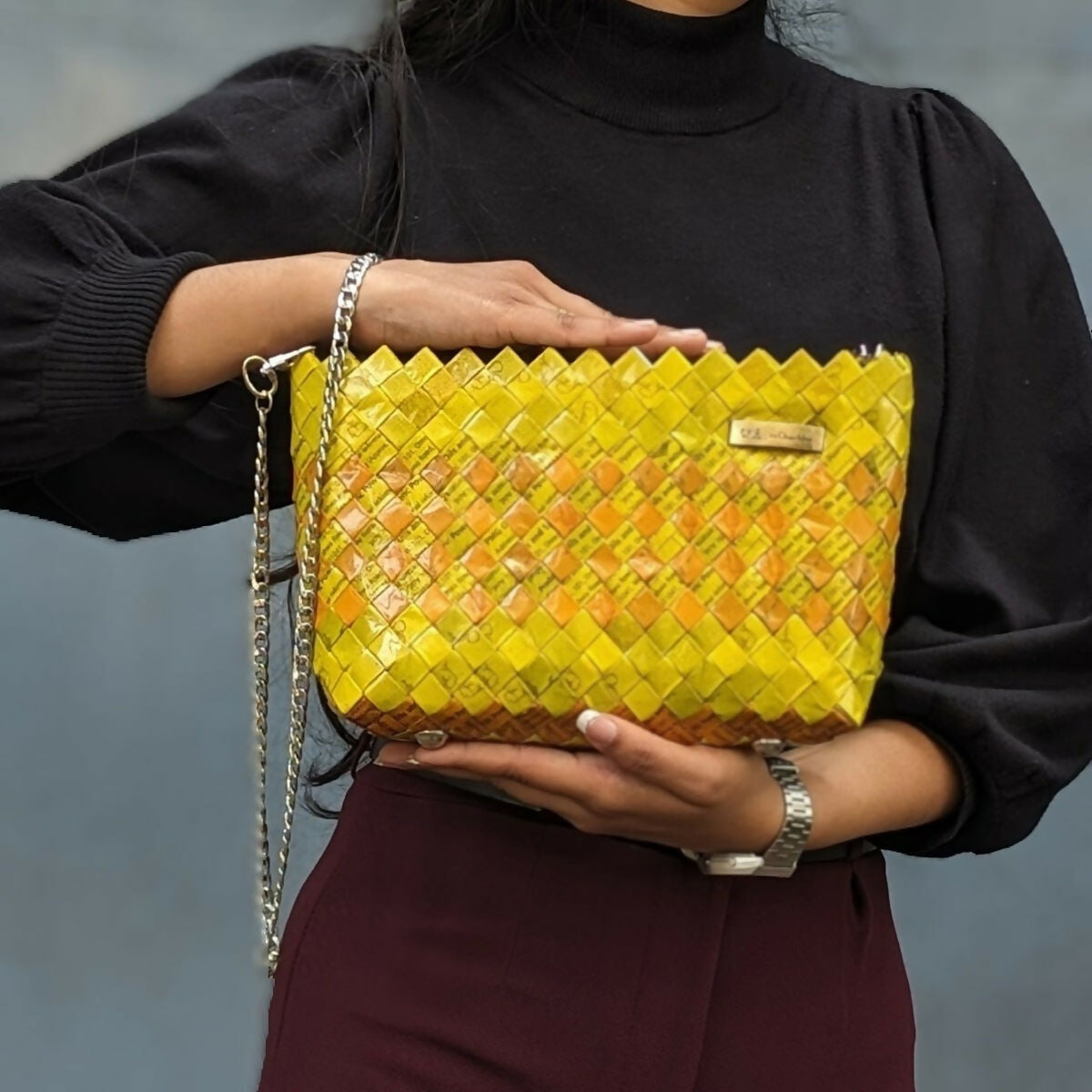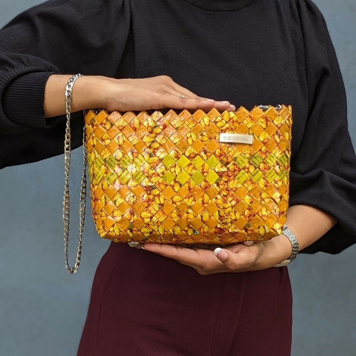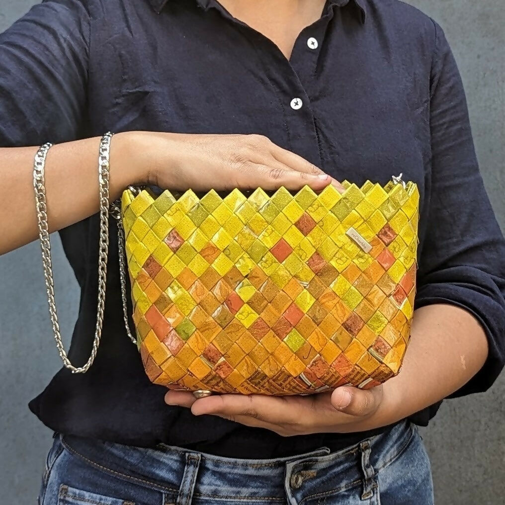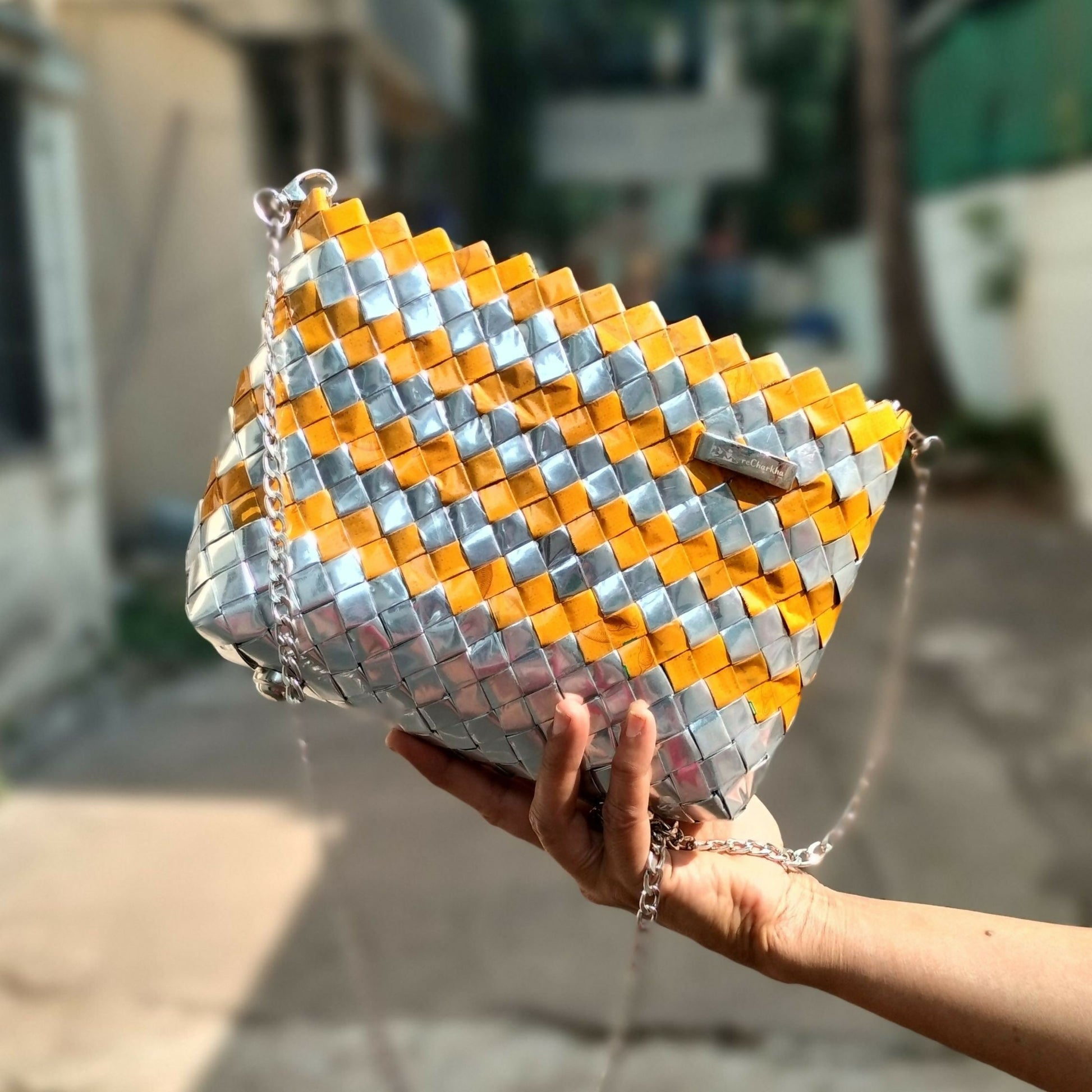 reCharkha’s Upcycled Hand-Stitched Origami Basket Sling Bag is stacked with Multi color waste plastic wrappers! This Playful vibrant UPCYCLED crossbody bag is the trend setter!