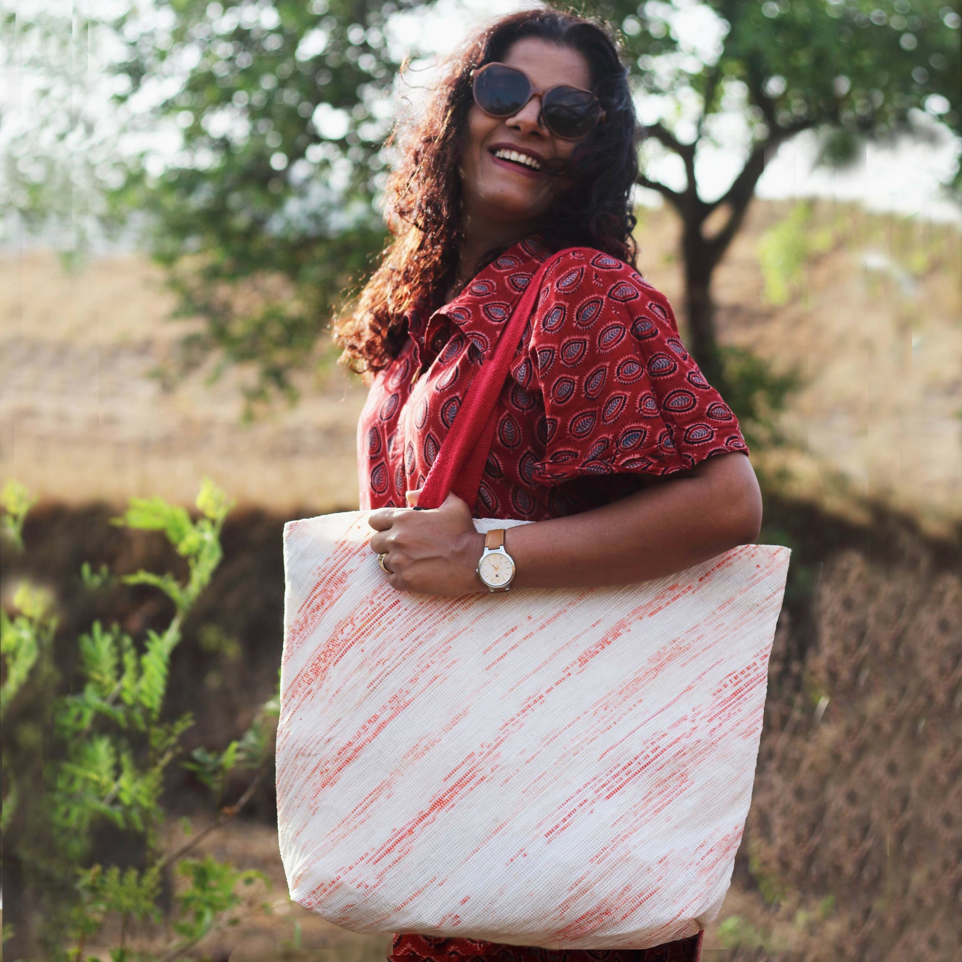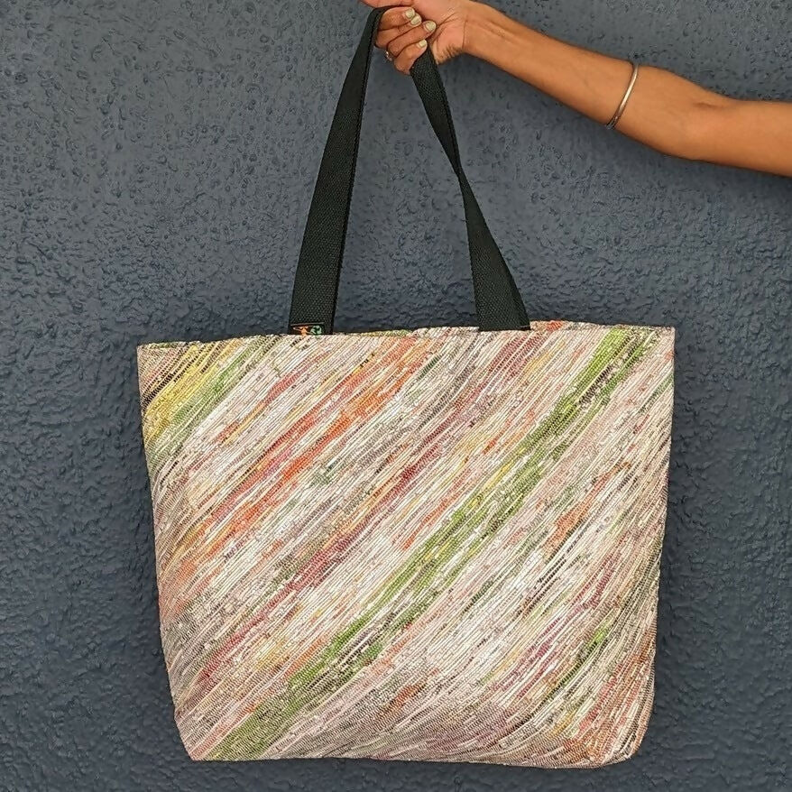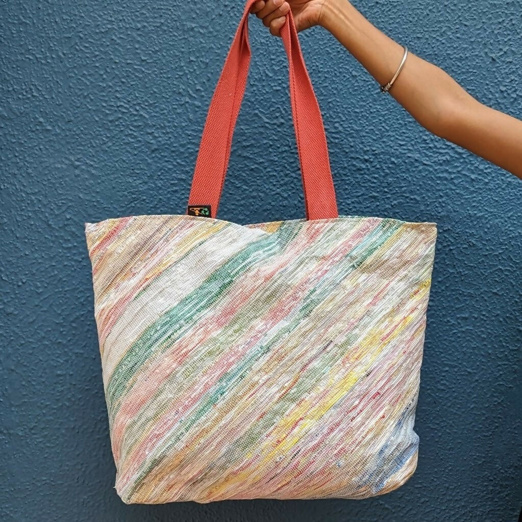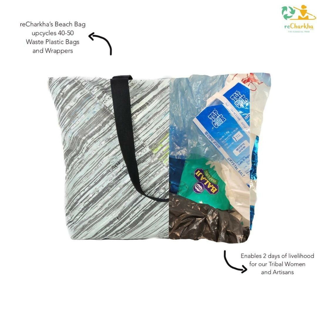 One-of-Our most popular bags, reCharkha's UPCYCLED HANDWOVEN Beach Bag is the ultimate weekend bag you need to flaunt on your beach vacations, road trips and weekend escapes. It could also be used if you are out a BIG shopping expedition and avoid taking plastic or paper bags from shop-keepers! This bag is your Big Saviour with Big enough space to hold all your must-haves in Style!.