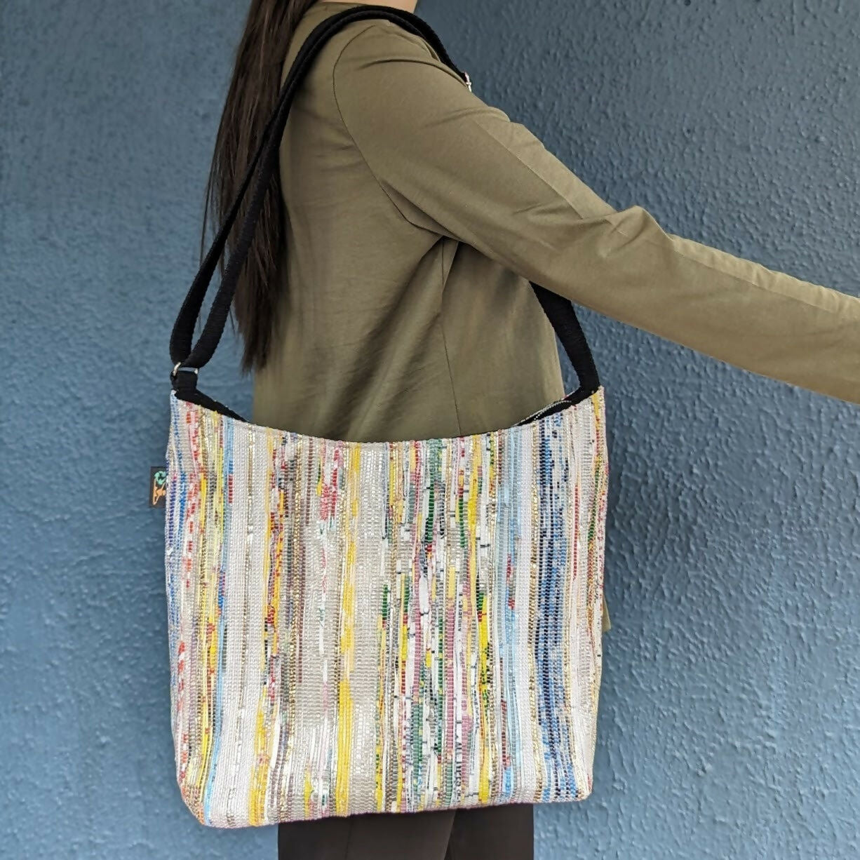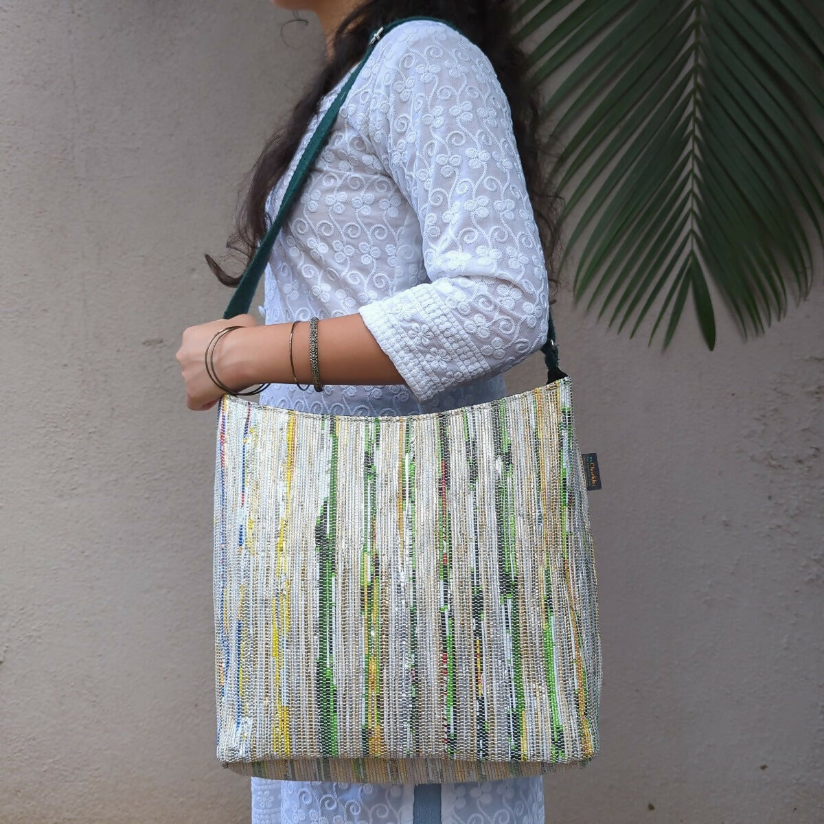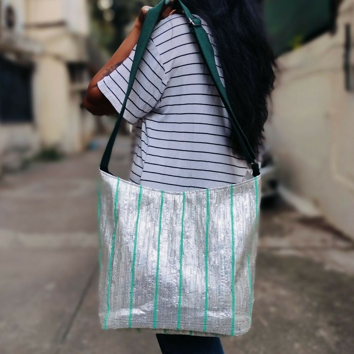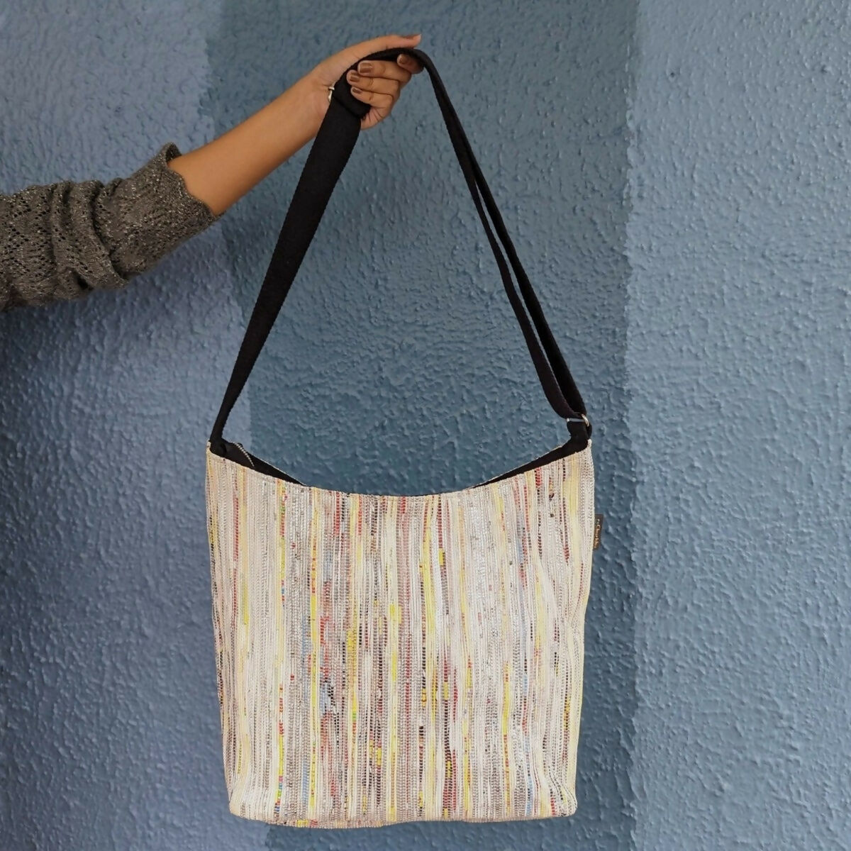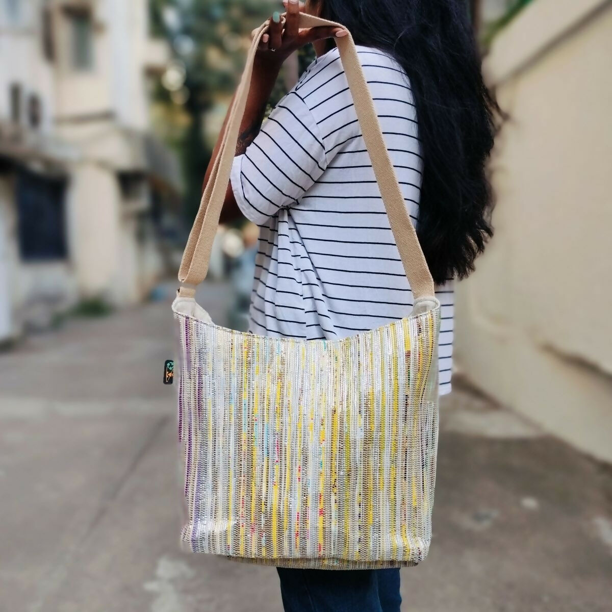 UPCYCLED HANDWOVEN Eclipse Tote is a much needed Face Lift of our head turning Jholas! A very spacious bag, it can be used as an everyday bag, for picnics or huge shopping sprees and so much more.It can be used not just as a sling bag, but also as a purse, because of its adjustable handle! This Jhola is our one-of-a-kind creation. Well, totally worth the buy!