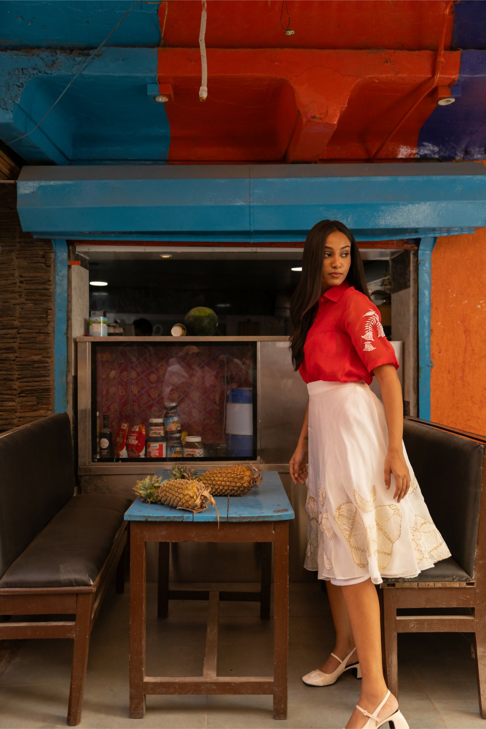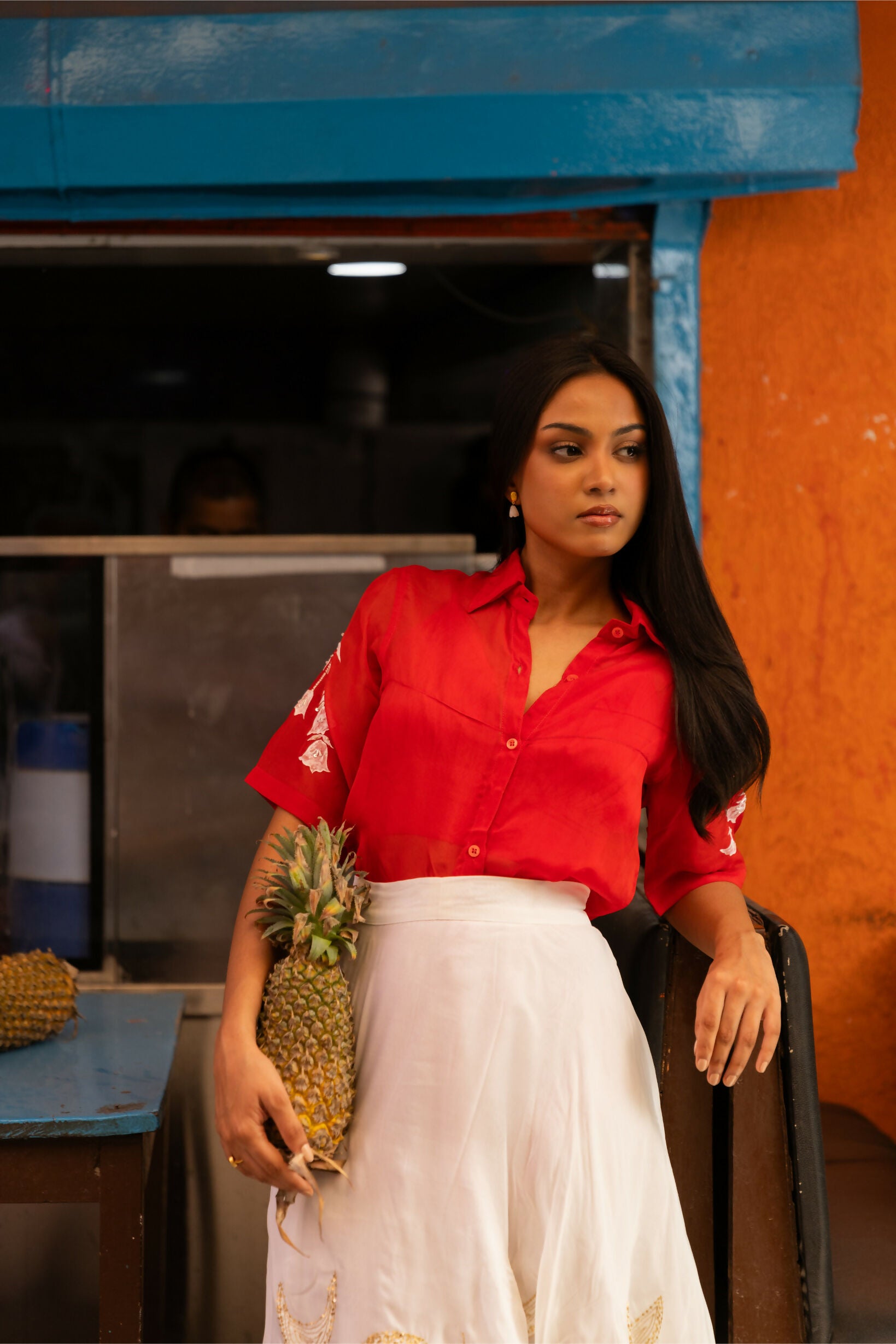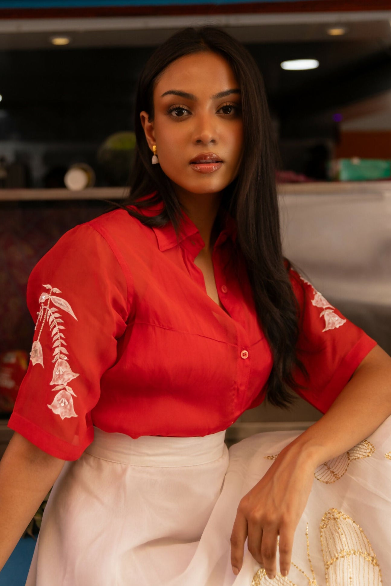 Introducing the Valentino Hand-Embroidered and Hand-Painted Organza Shirt features hand-painted white florals on the sleeves, complemented by intricate hand-embroidery with moti and katana. The attention to detail gives the Valentino shirt a truly exclusive and luxurious look, perfect for making a statement.