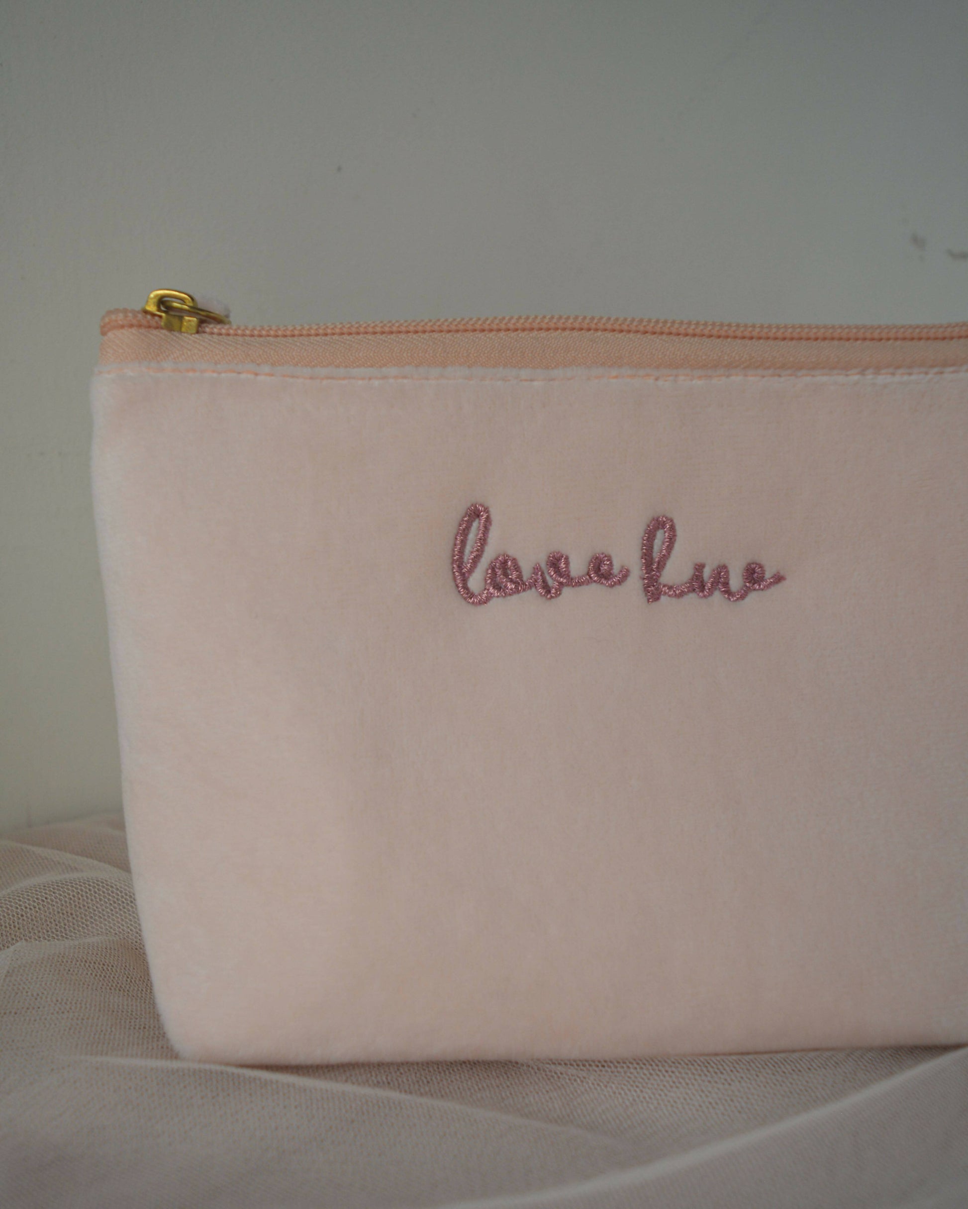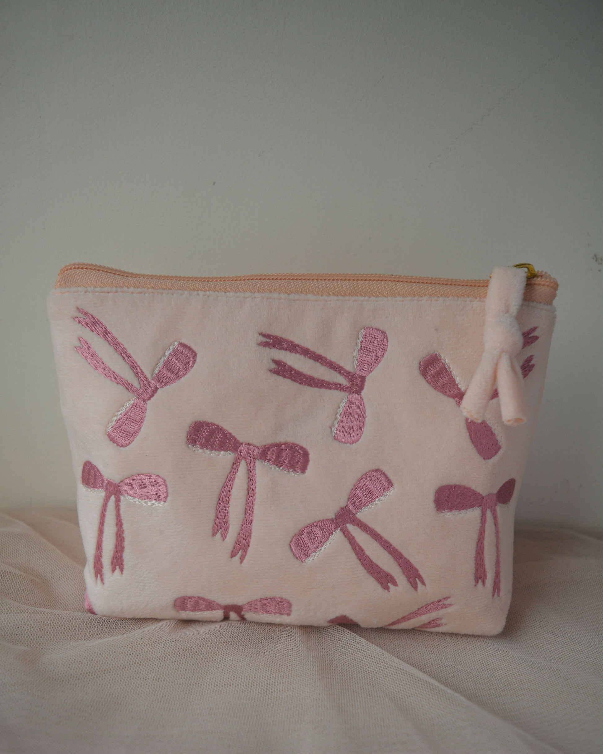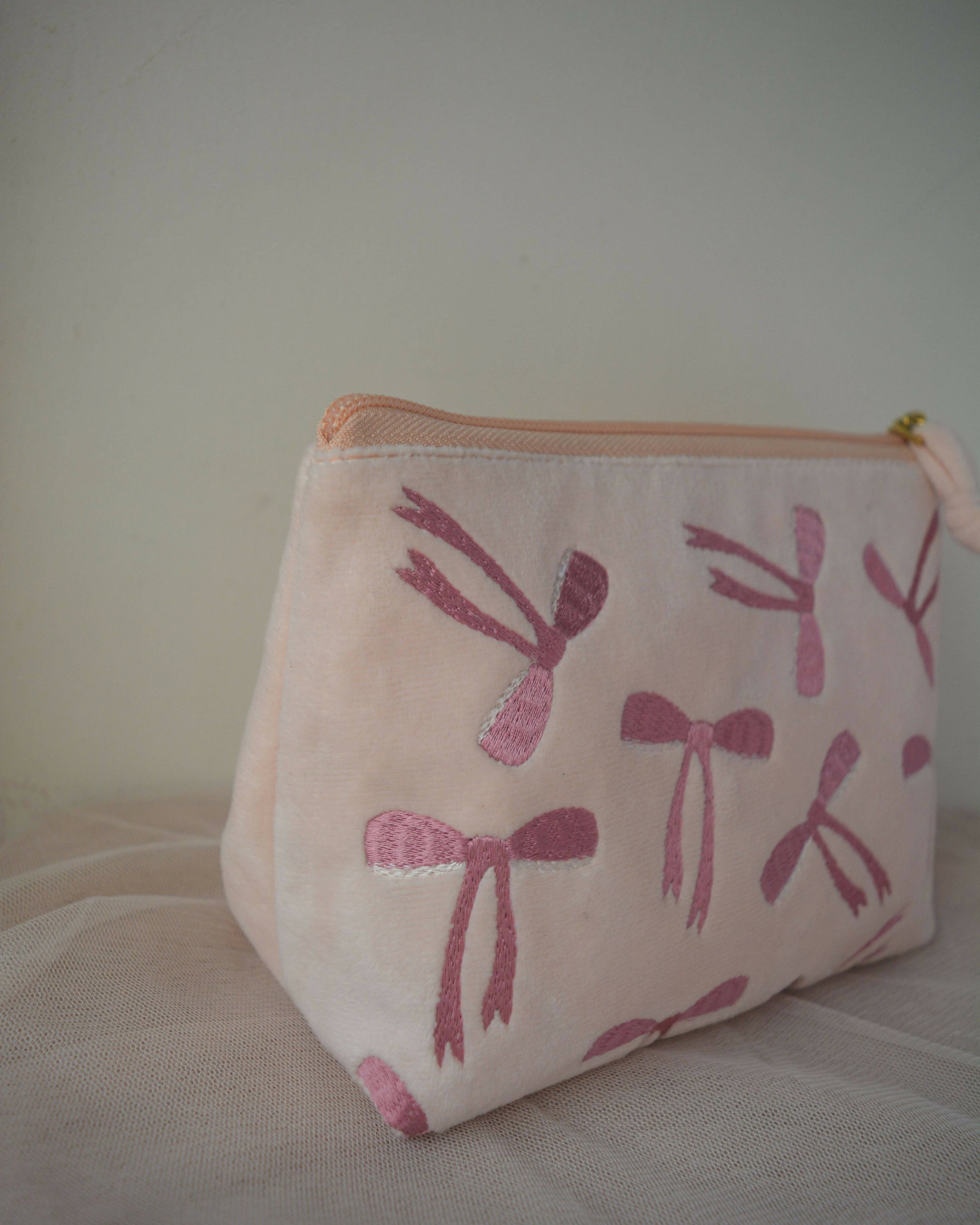 The pouch is made using soft luxurious velvet fabric with pink bows embroidered over it. This everyday structured bag is perfect to store all your daily essentials like makeup, skincare and so much more. Its ideal size makes it perfect for travelling. The pouch comes with a metal zip closure and is easily washable, so no need to worry about spillage.