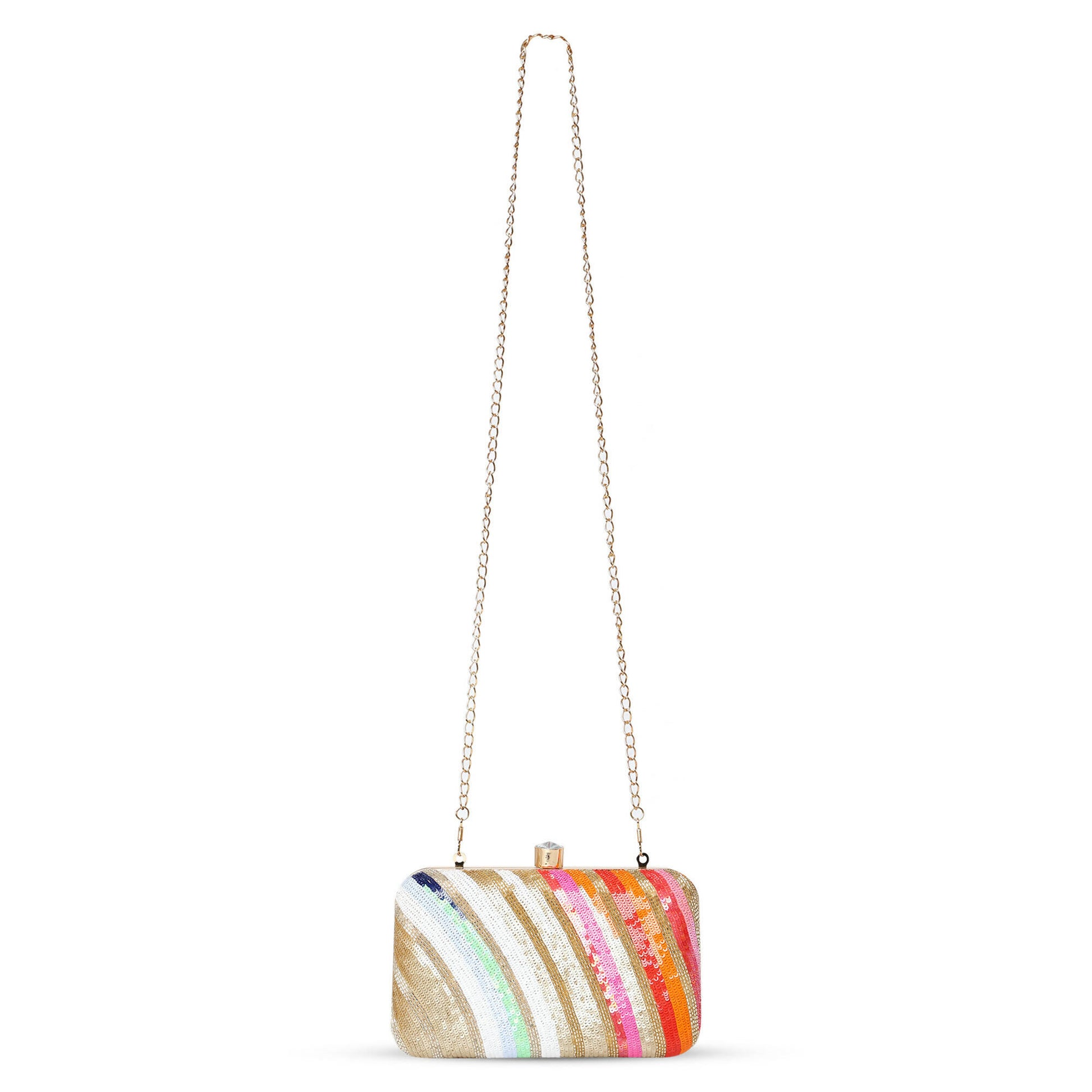 Silk-based Box Clutch adorned with multicolored sequins, complete with a detachable golden sling chain.