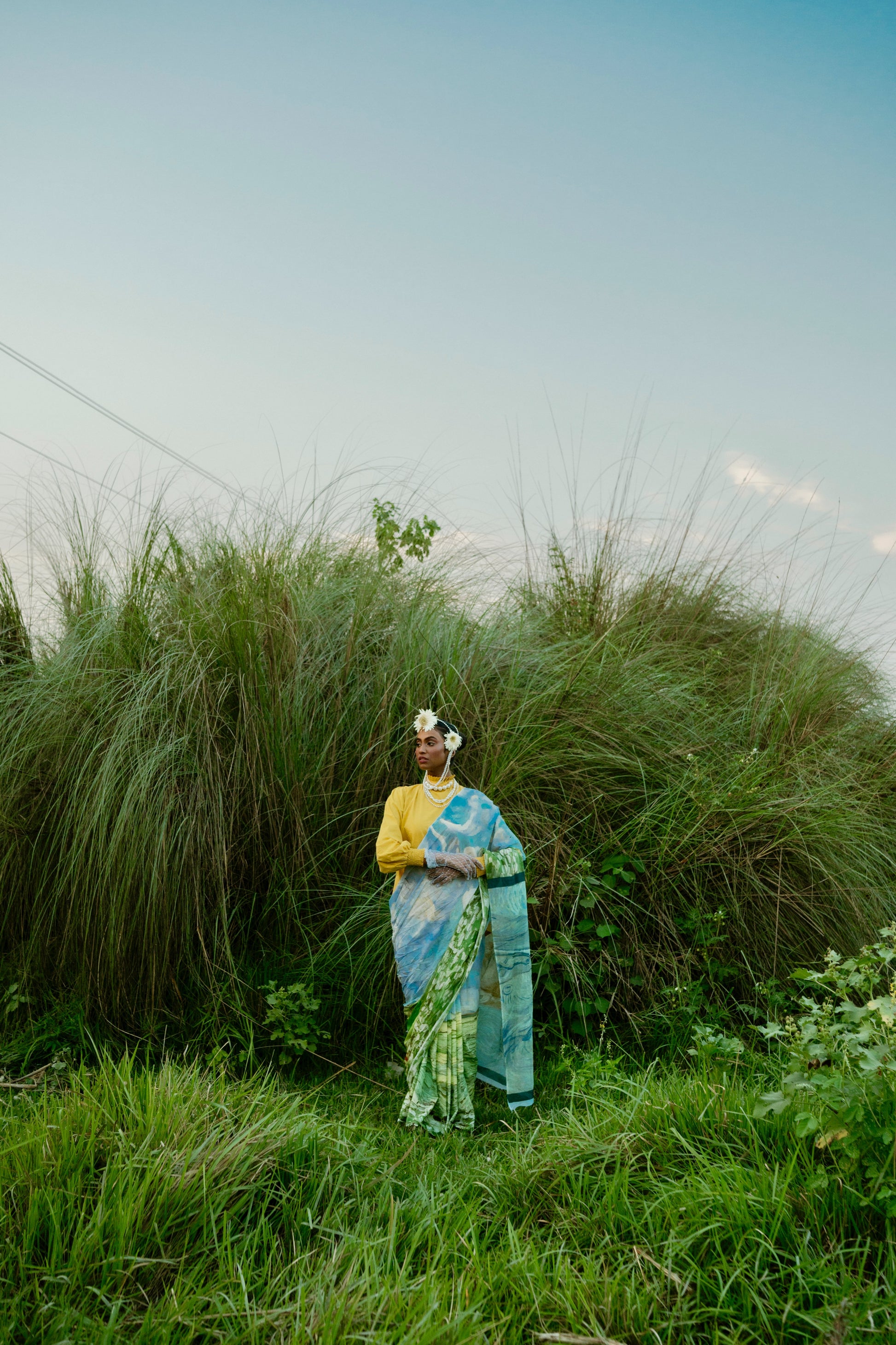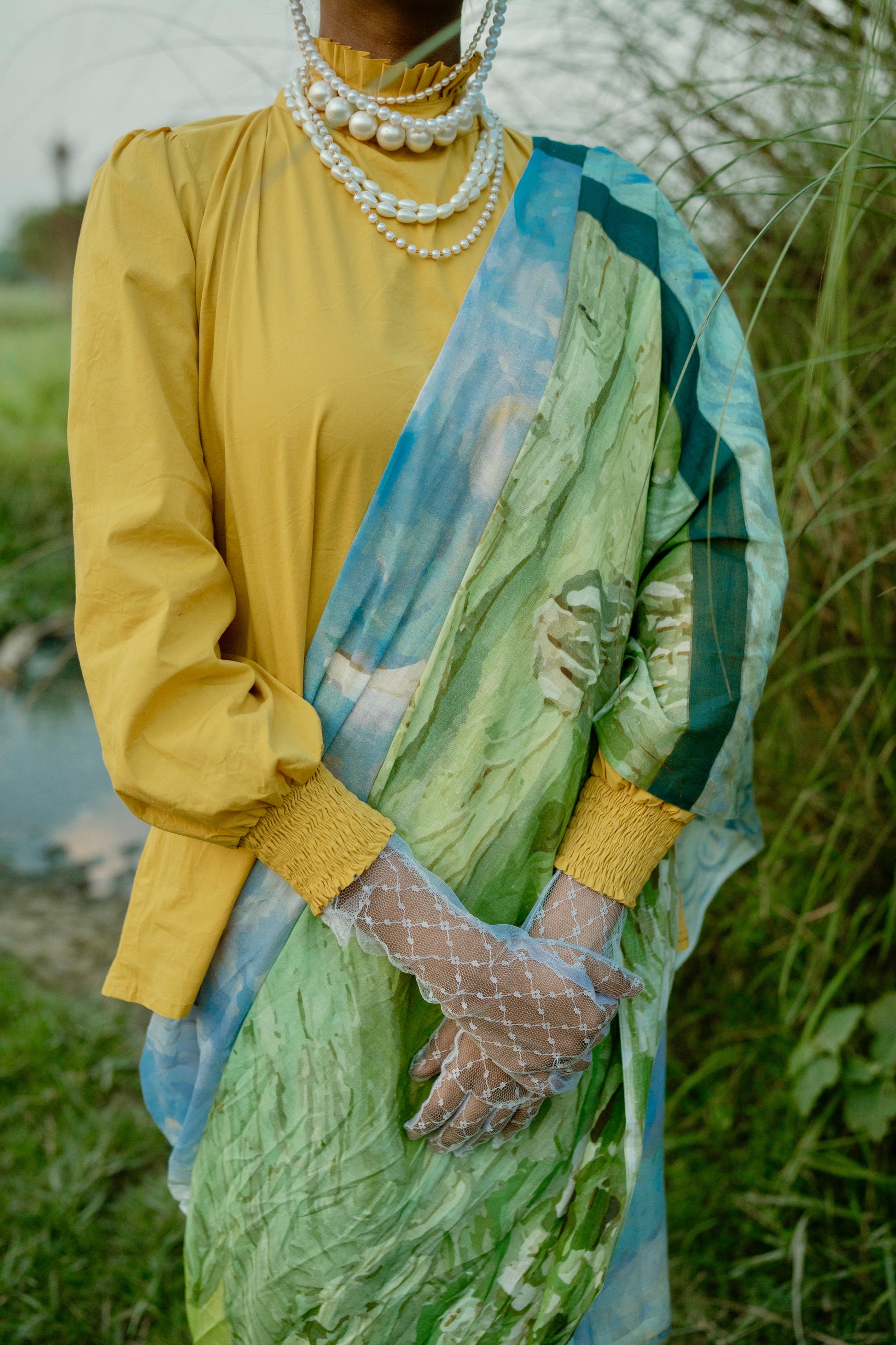 For the saree's body we mixed the sky from 'Wheat Field with Cypresses' and the field from 'Wheat Field Under Thunderclouds'. The self portrait of Vincent Van Gogh adds more class to this piece.