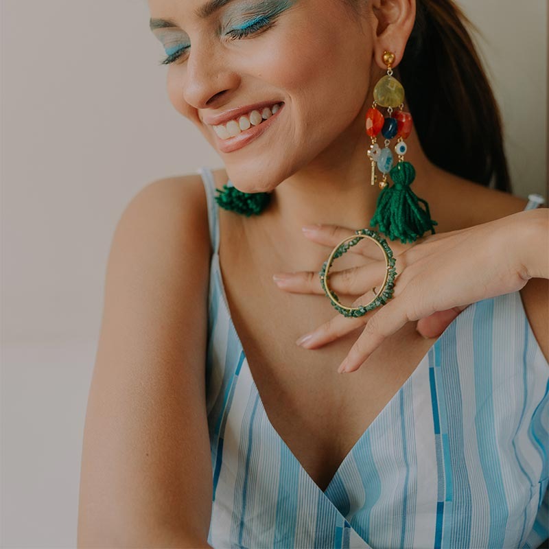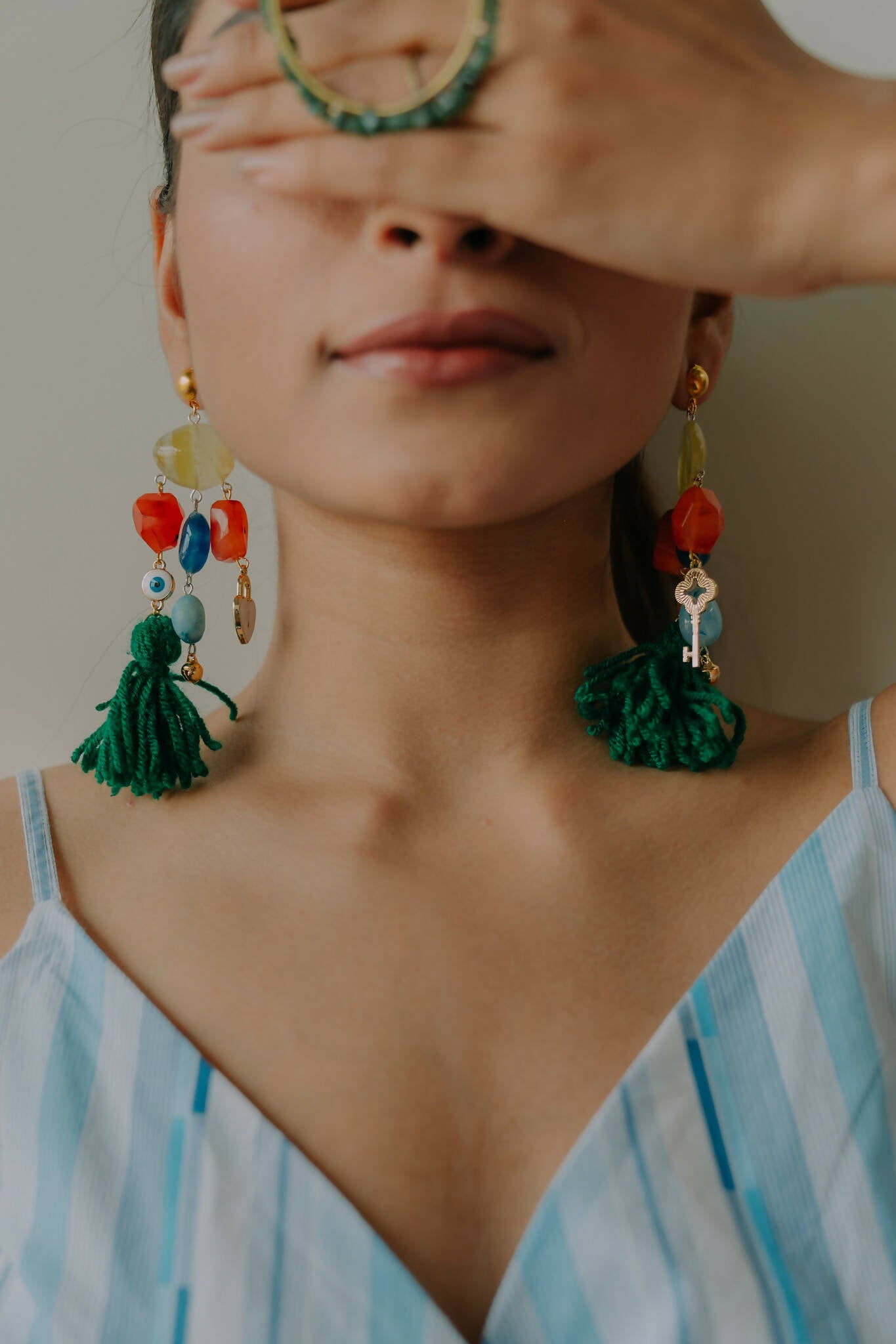 These Lock & Key Earrings bring festive fun to your wardrobe. With a whimsical tassel design resembling a christmas tree, these earrings are the perfect Christmas eve accessory. The playful lock & key design on each side is charmed with colorful gem stones that swing and sway with every movement. It's time to sing jingle bell now!