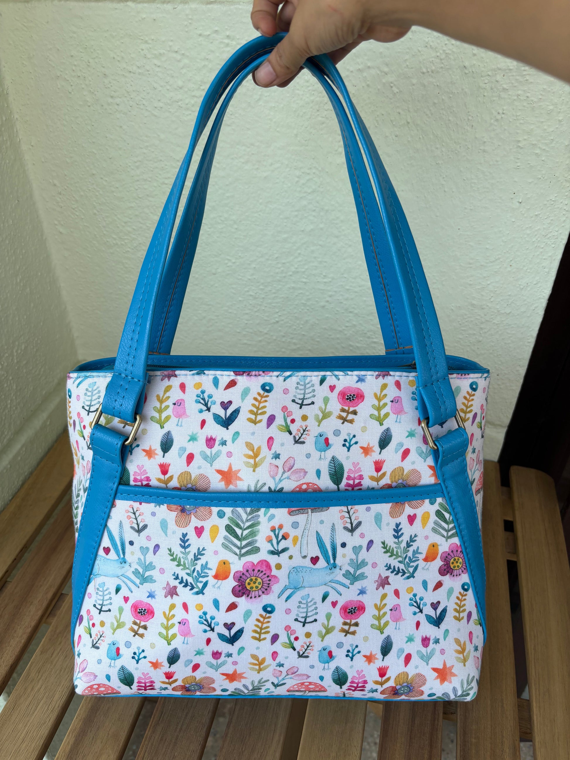 Cheerful and storybook-inspired, the Whimsical Meadow Tote features a playful nature print with flowers, birds, and woodland creatures on premium cotton fabric. Bright blue faux leather adds a lively contrast, while a spacious zippered compartment, water-resistant lining, and thoughtful pockets make it as functional as it is charming.