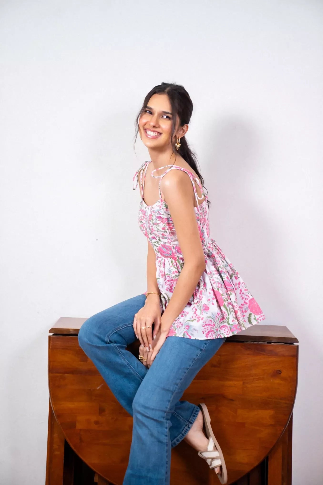 White And Pink Floral Hand Block Printed Tie Up Cotton Top