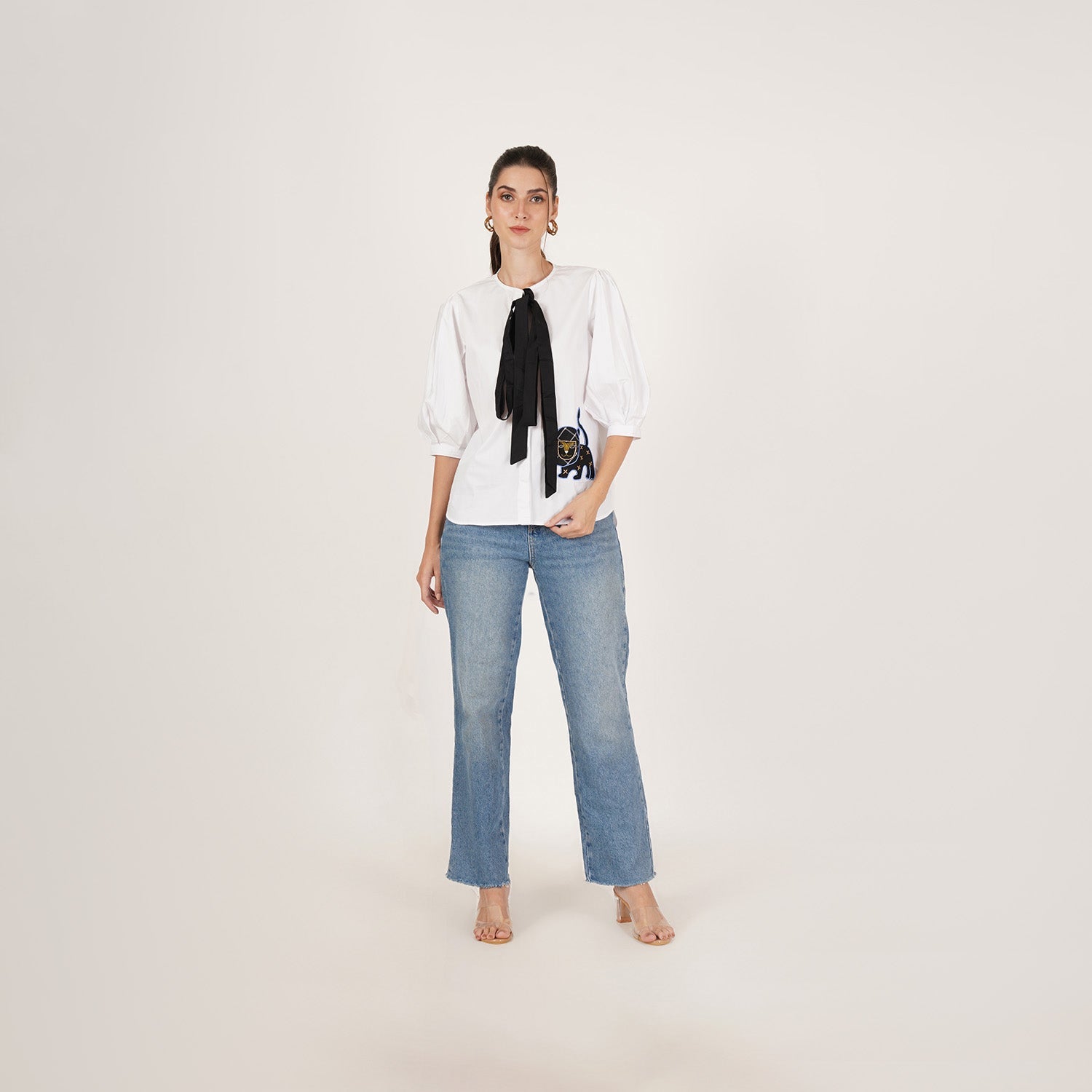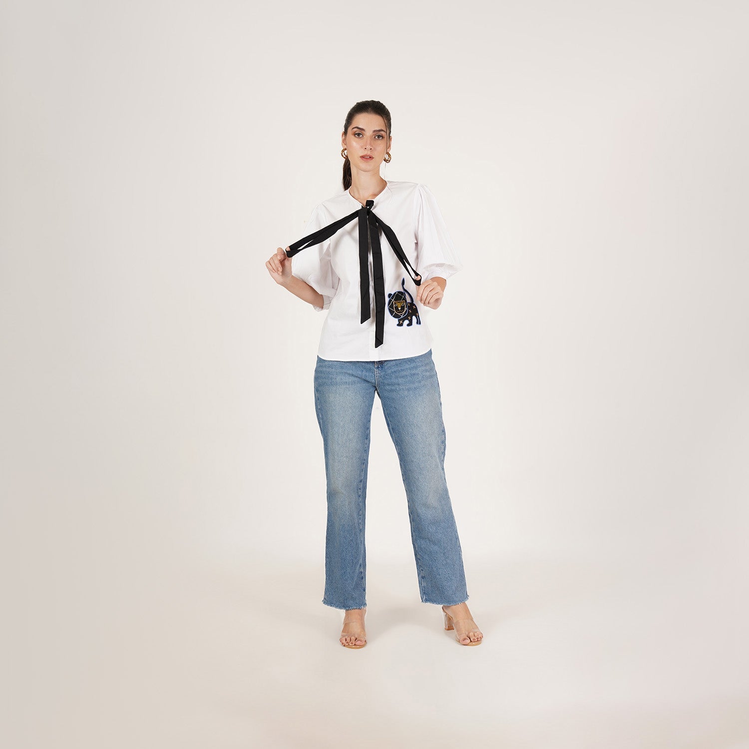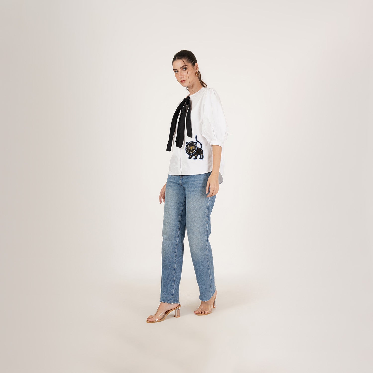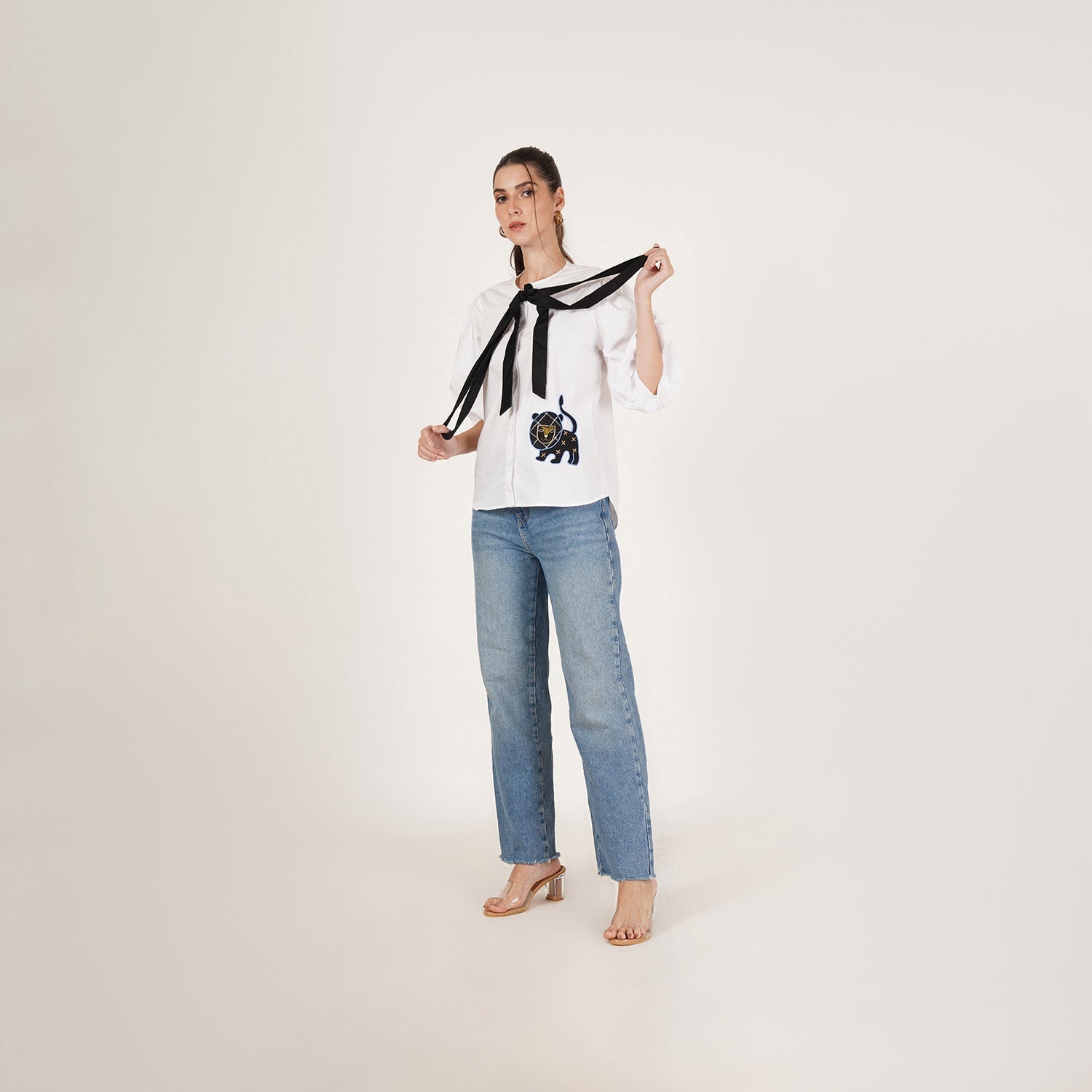 The White Embroidered Simba Bow Shirt is a perfect blend of elegance and playfulness, designed for those who love unique statement pieces. Crafted from premium poplin fabric, this shirt offers a crisp yet breathable feel, ensuring all-day comfort. The delicate Simba embroidery adds a charming and artistic touch, bringing a hint of whimsy to the classic white silhouette.