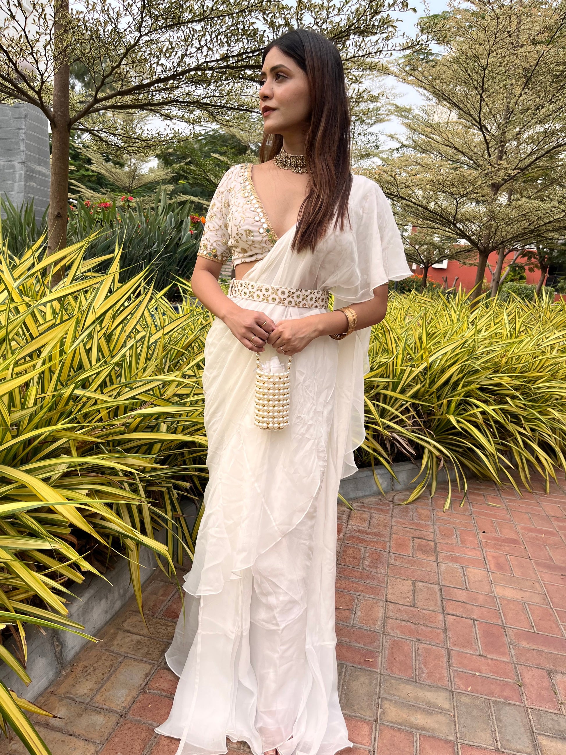 Up your style quotient this festive season in our white pre-draped saree with ruffle detail. It comes with a beautifully embroidered blouse piece and a belt. This saree is a classic and the ruffle pallu can be styled in multiple ways!